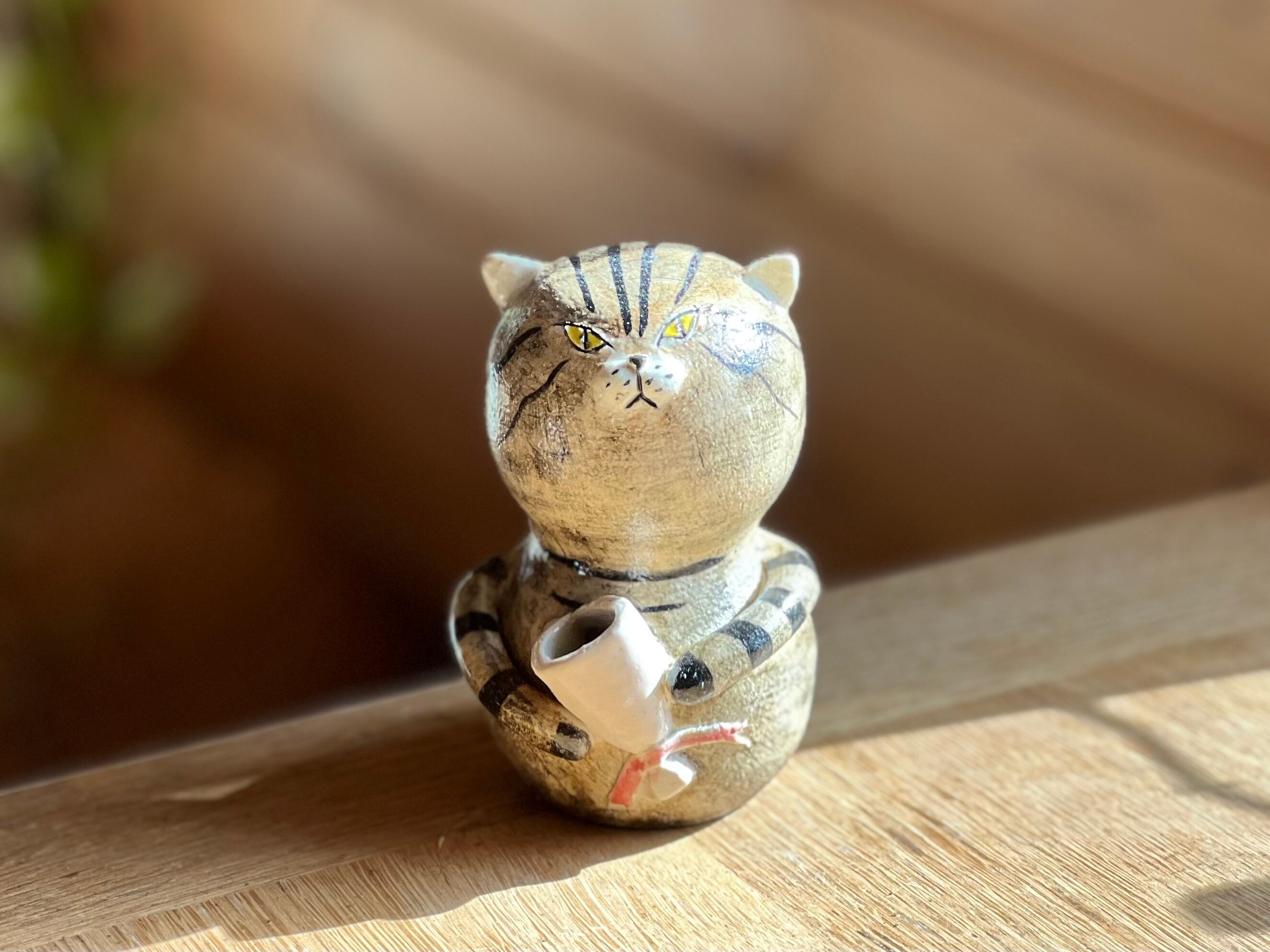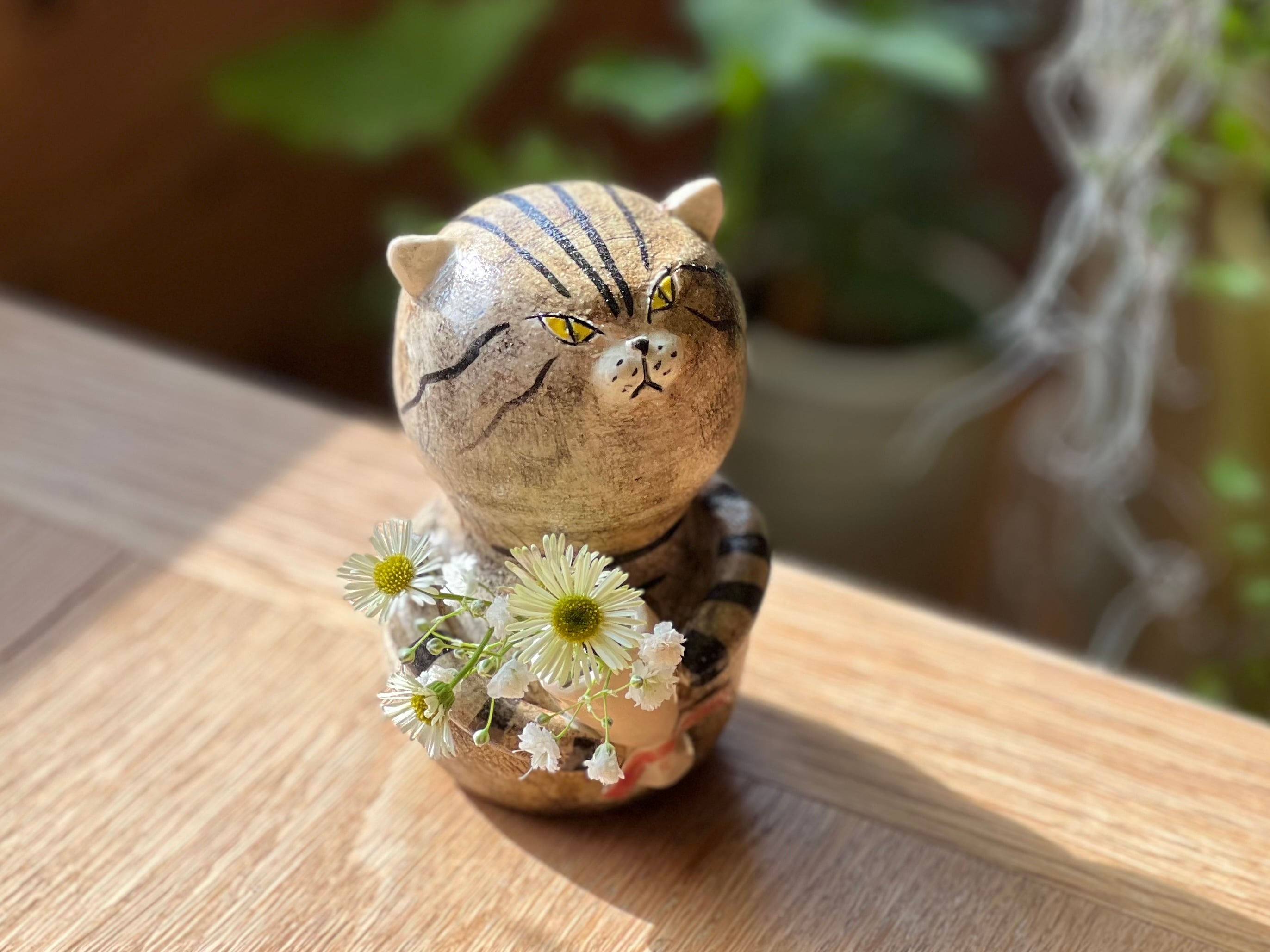 とら猫さんが花束を持った一輪挿しです。猫好きの方や花を飾るのが好きな方にぴったりのアイテムです。