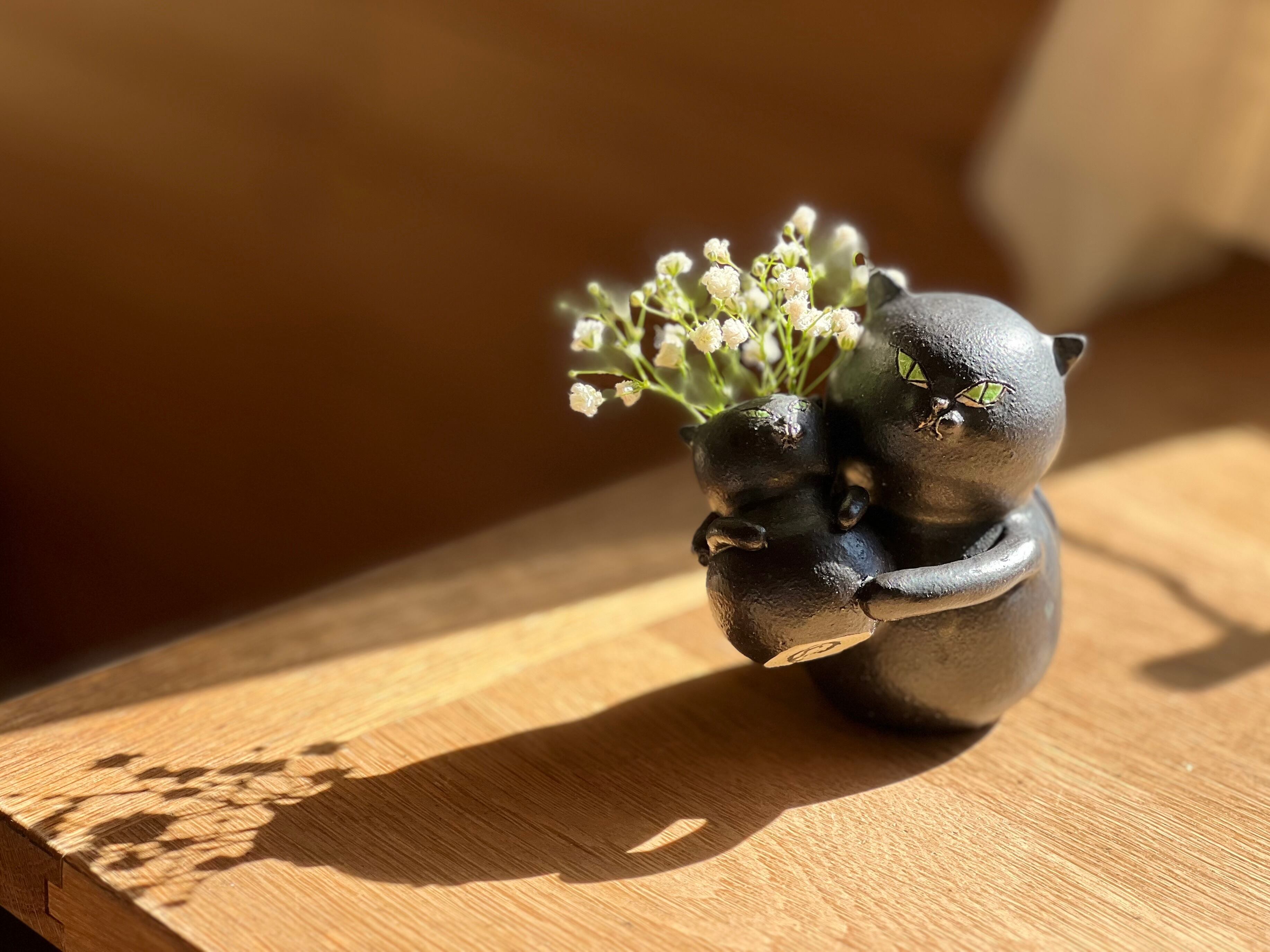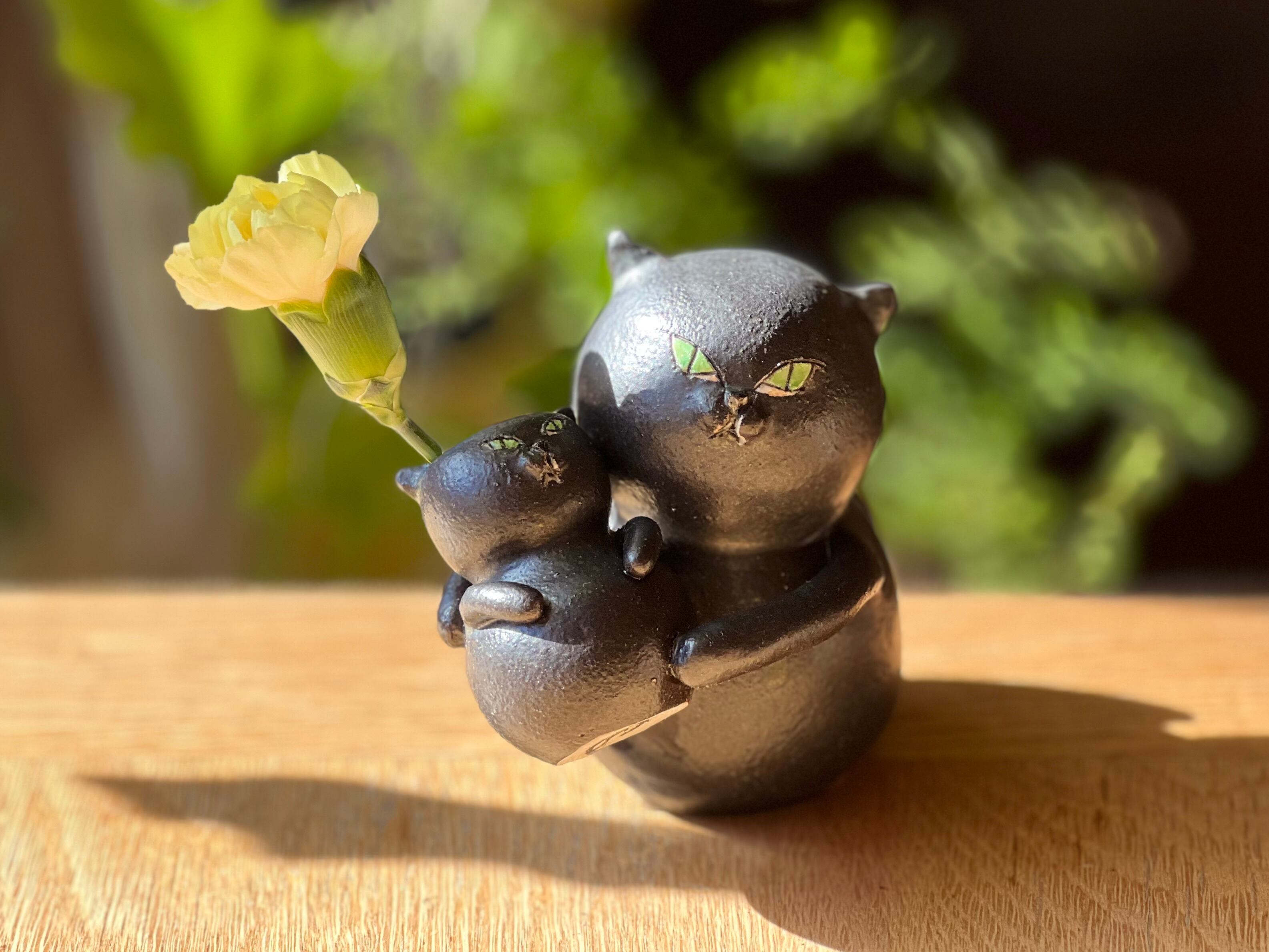 猫さん花瓶 小さい猫さんを抱っこした黒猫さん