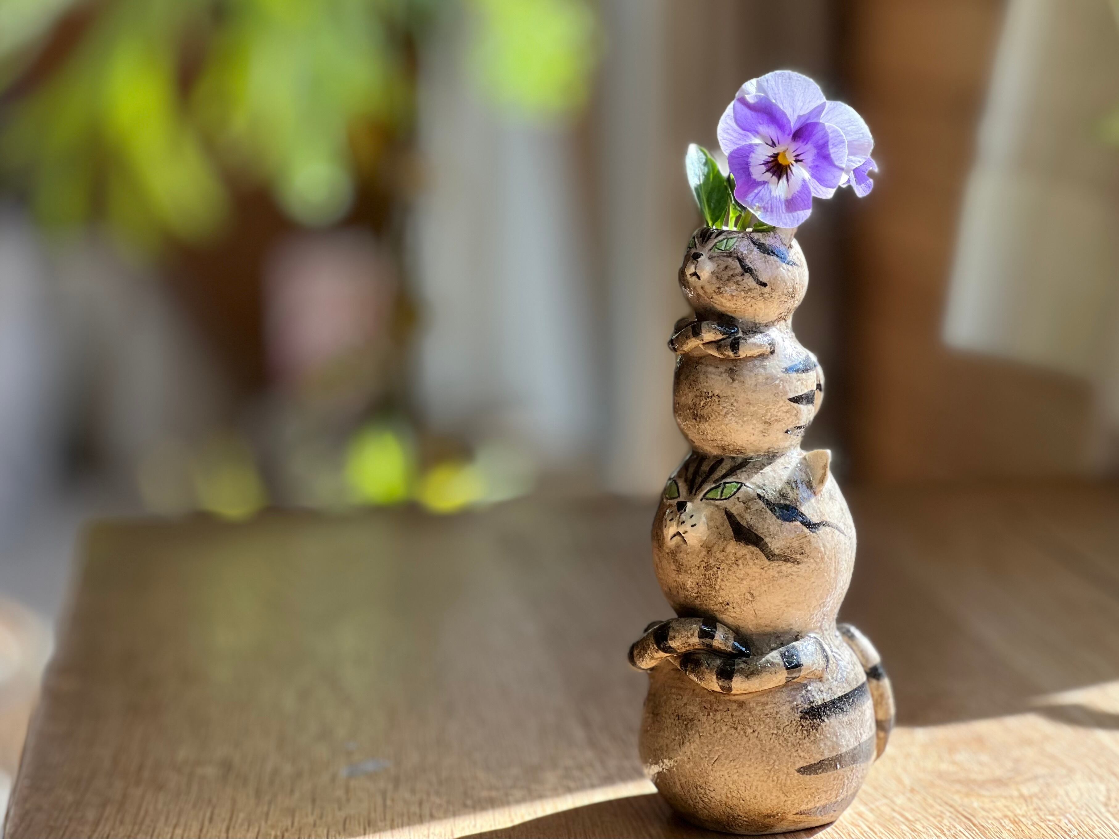 とら猫さんが花瓶を頭に乗せた一輪挿しです。猫好きの方や花を飾るのが好きな方にぴったりのアイテムです。