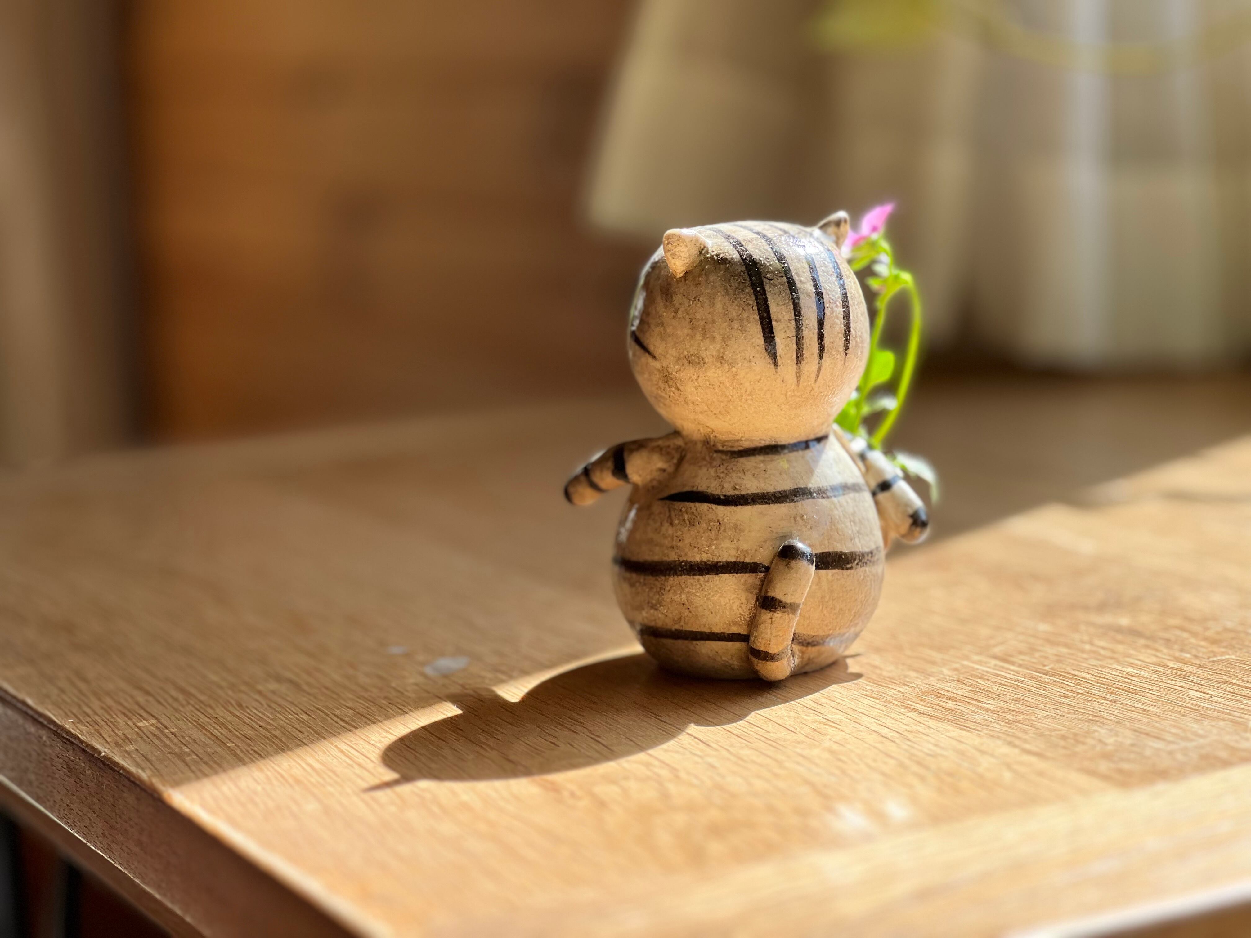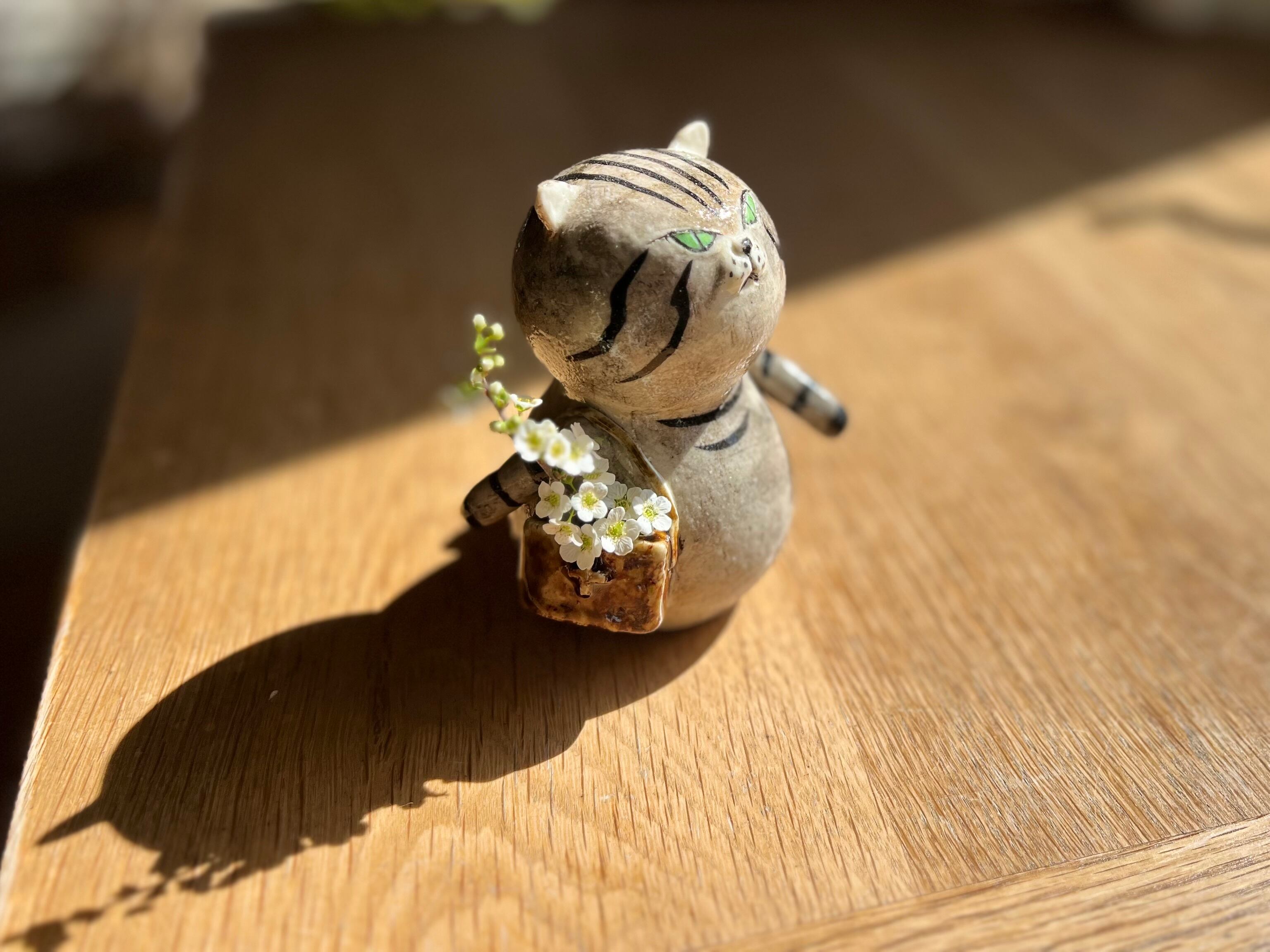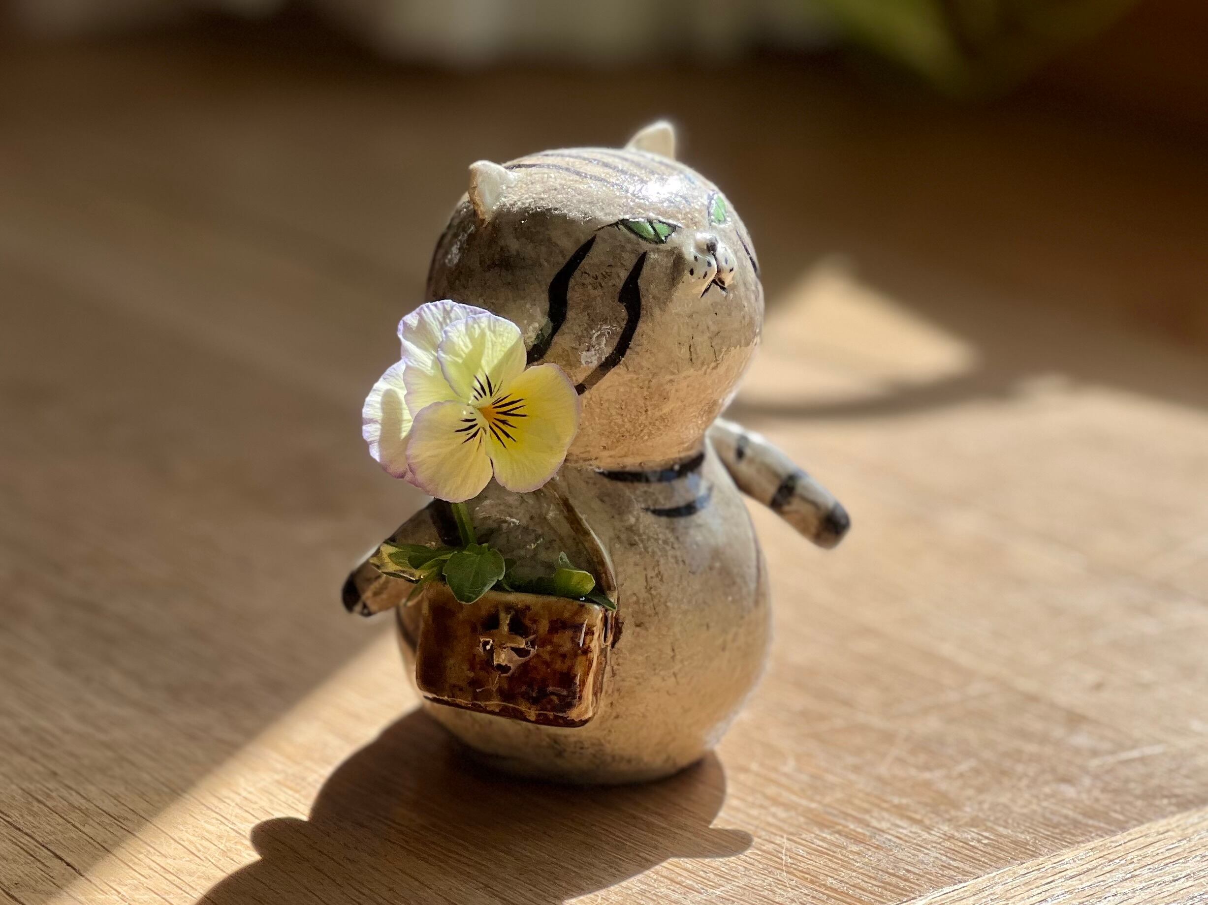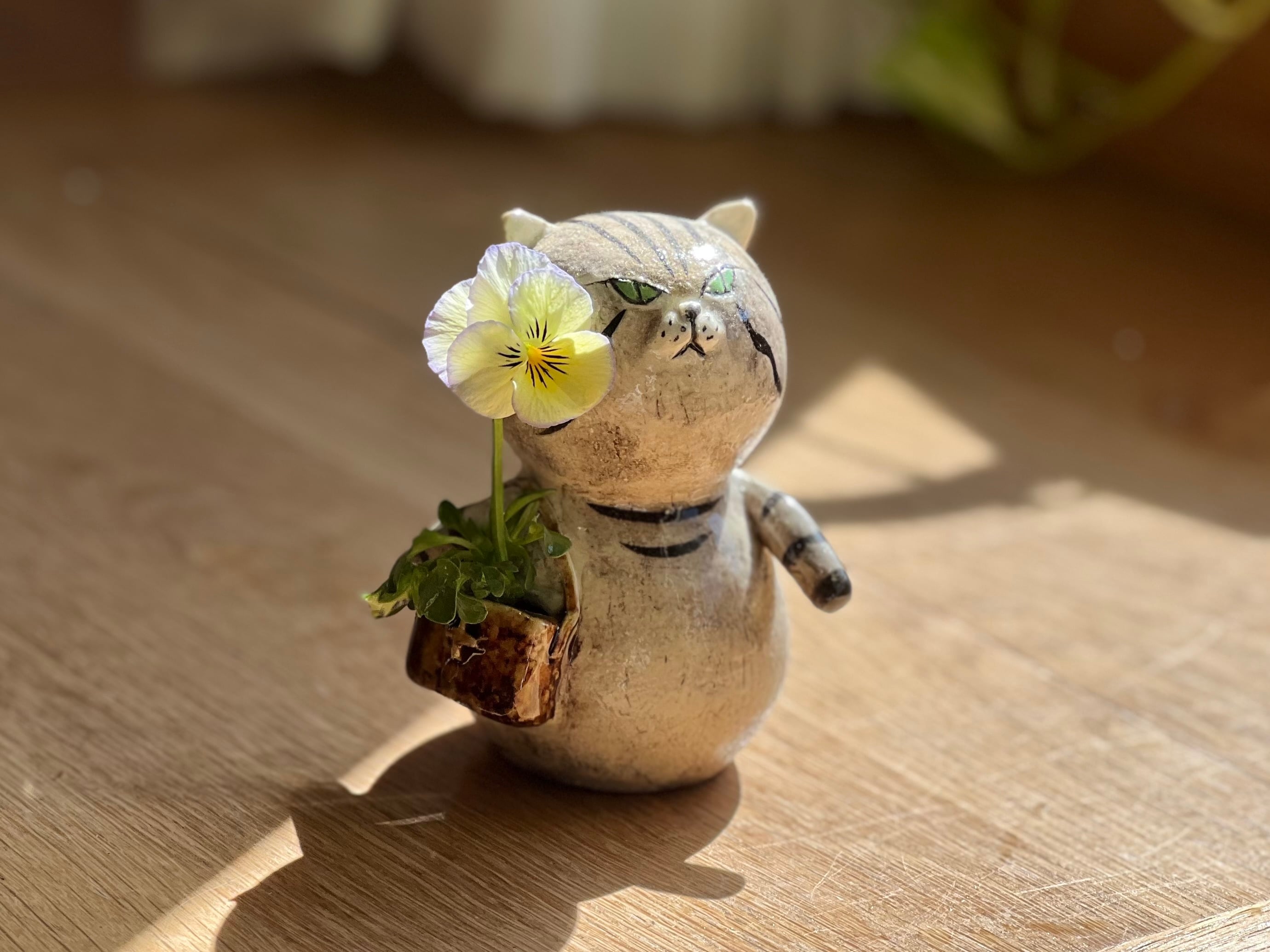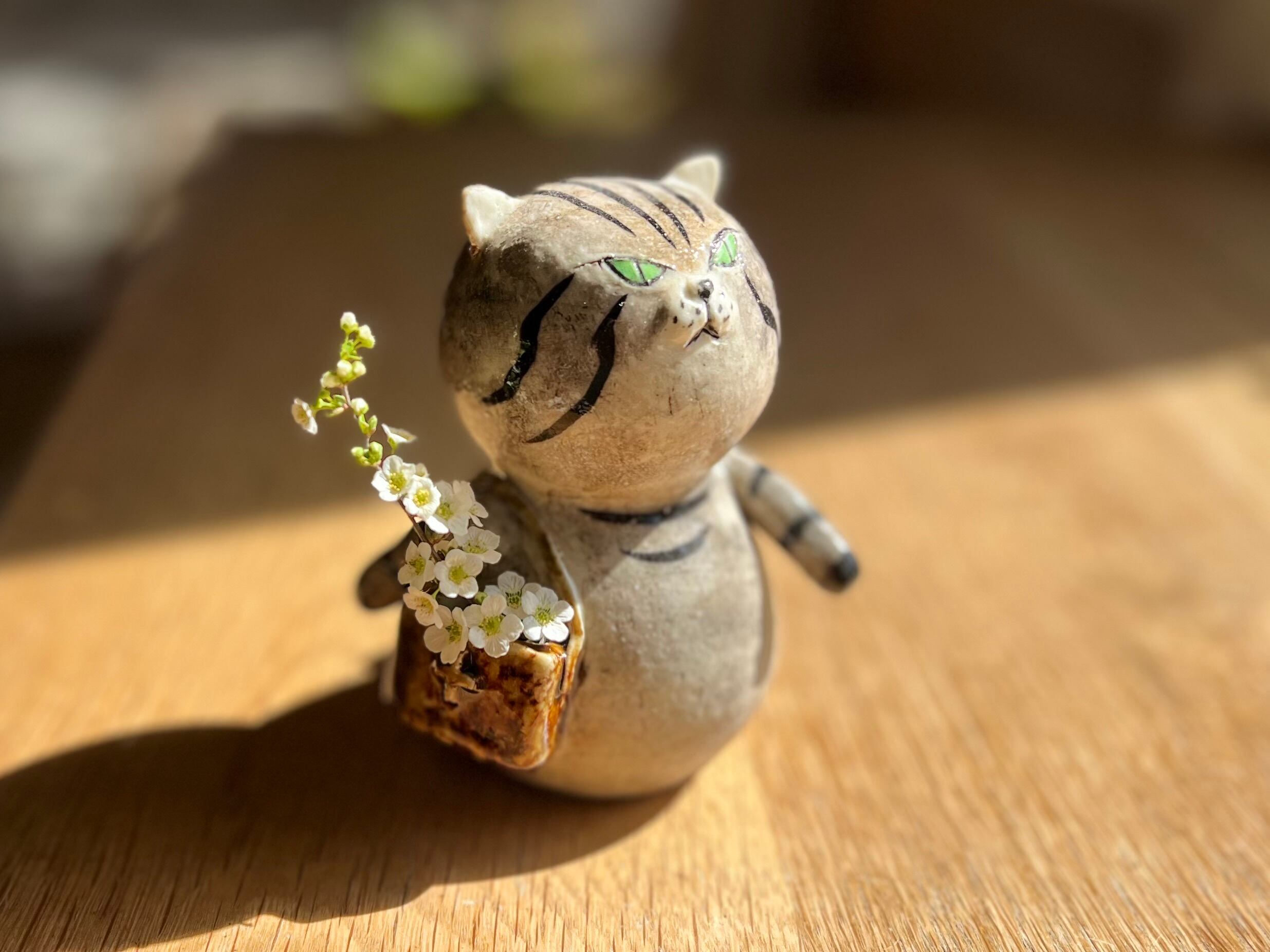 猫さん花瓶は、手作りの陶器製で、ひとつひとつ丁寧に作られています。そのため、それぞれの表情や模様が微妙に異なるのも魅力の一つです。