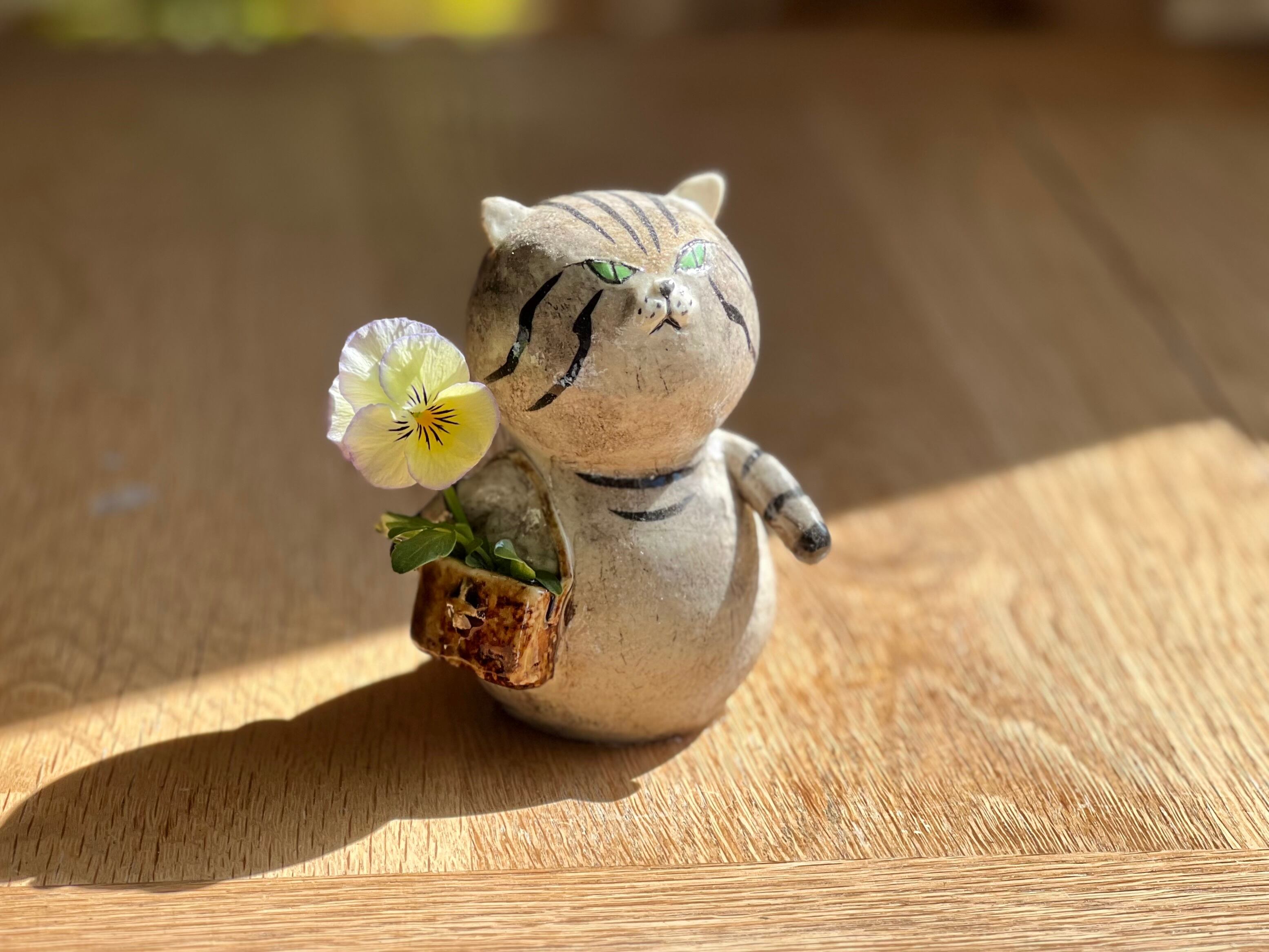 とら猫さんがショルダーバッグを肩にかけた一輪挿しです。猫好きの方や花を飾るのが好きな方にぴったりのアイテムです。