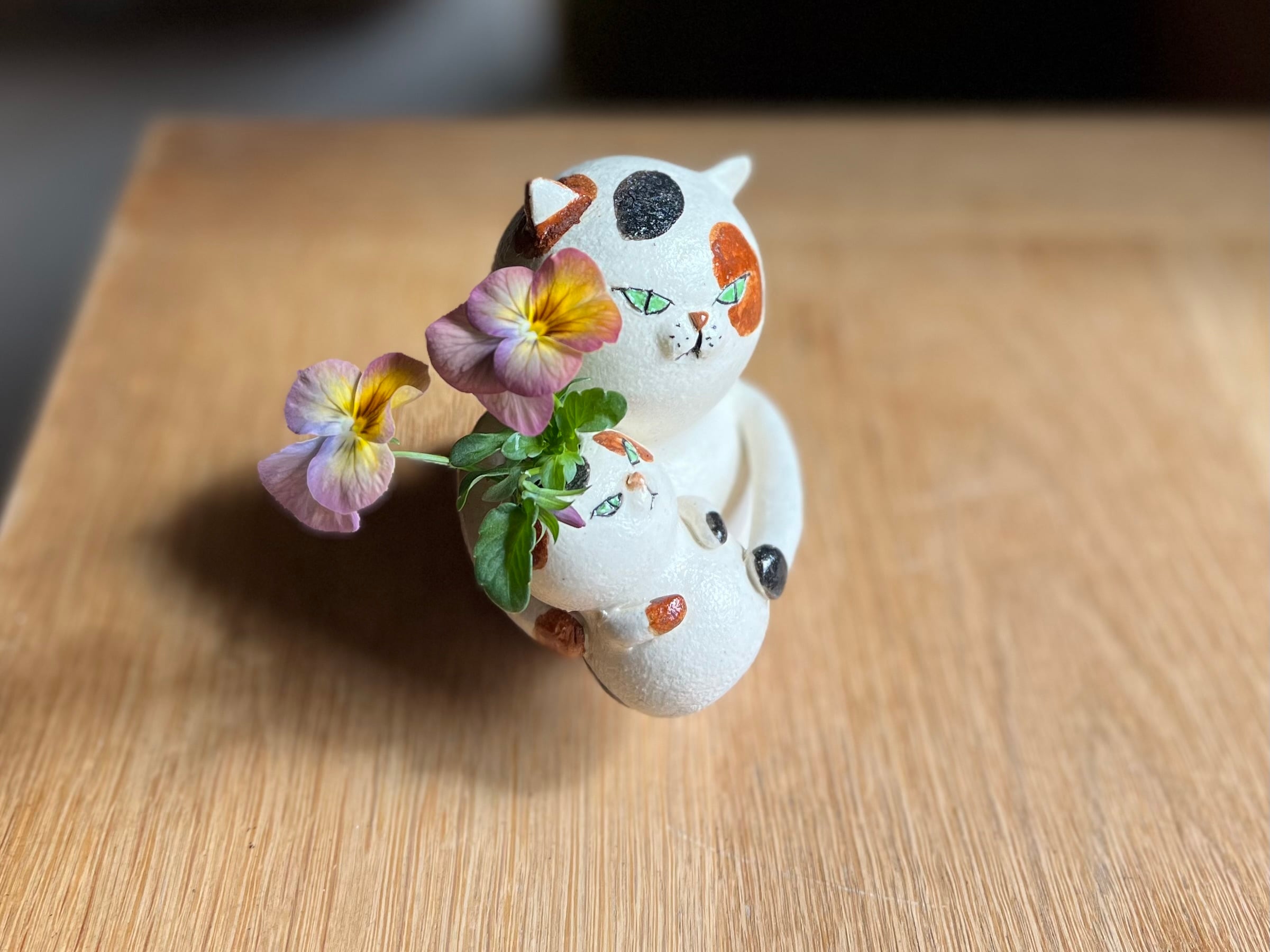 三毛猫さんが小さい猫さんを抱っこした一輪挿しです。猫好きの方や花を飾るのが好きな方にぴったりのアイテムです。