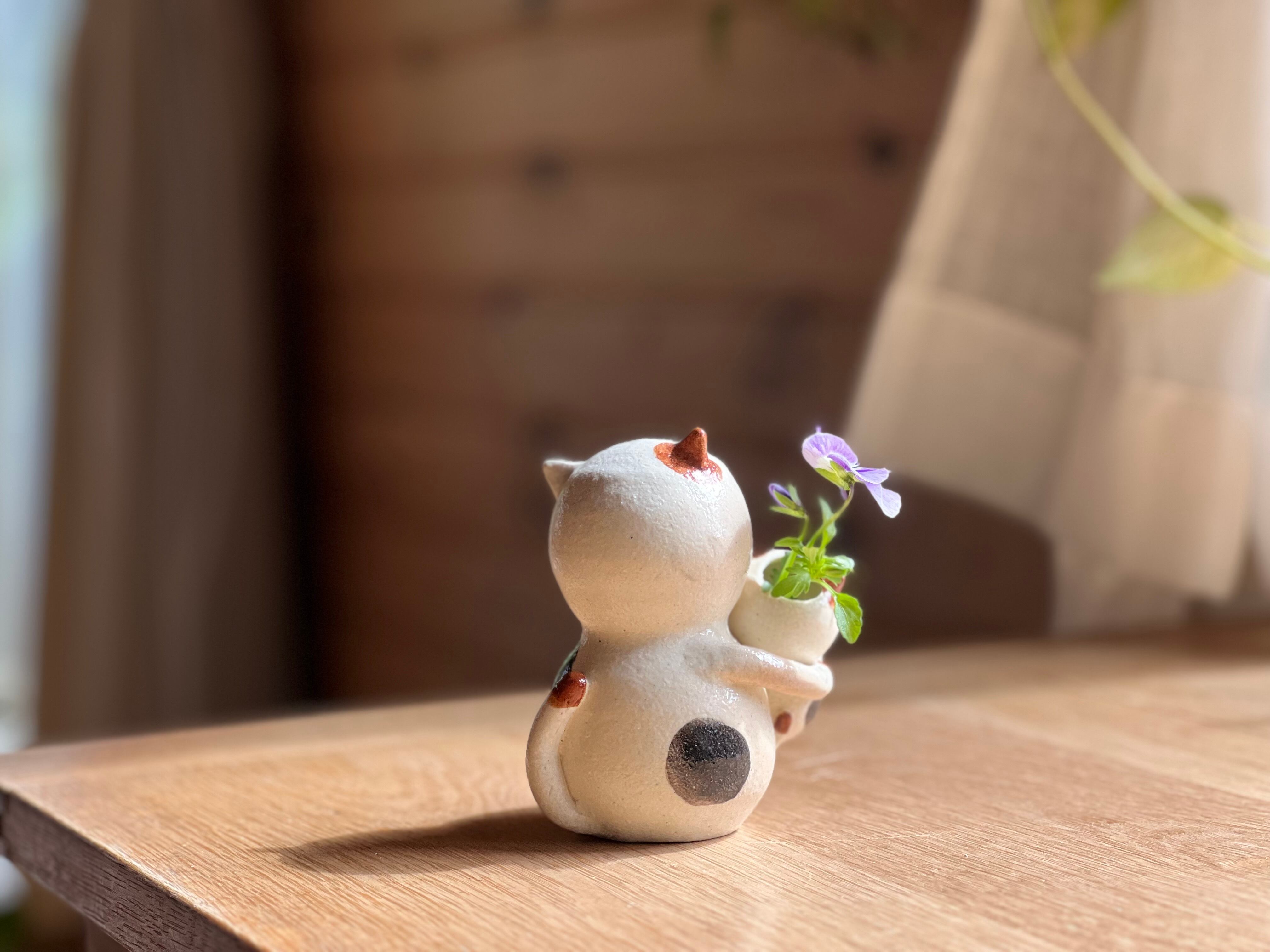 猫さん花瓶は、手作りの陶器製で、ひとつひとつ丁寧に作られています。そのため、それぞれの表情や模様が微妙に異なるのも魅力の一つです。