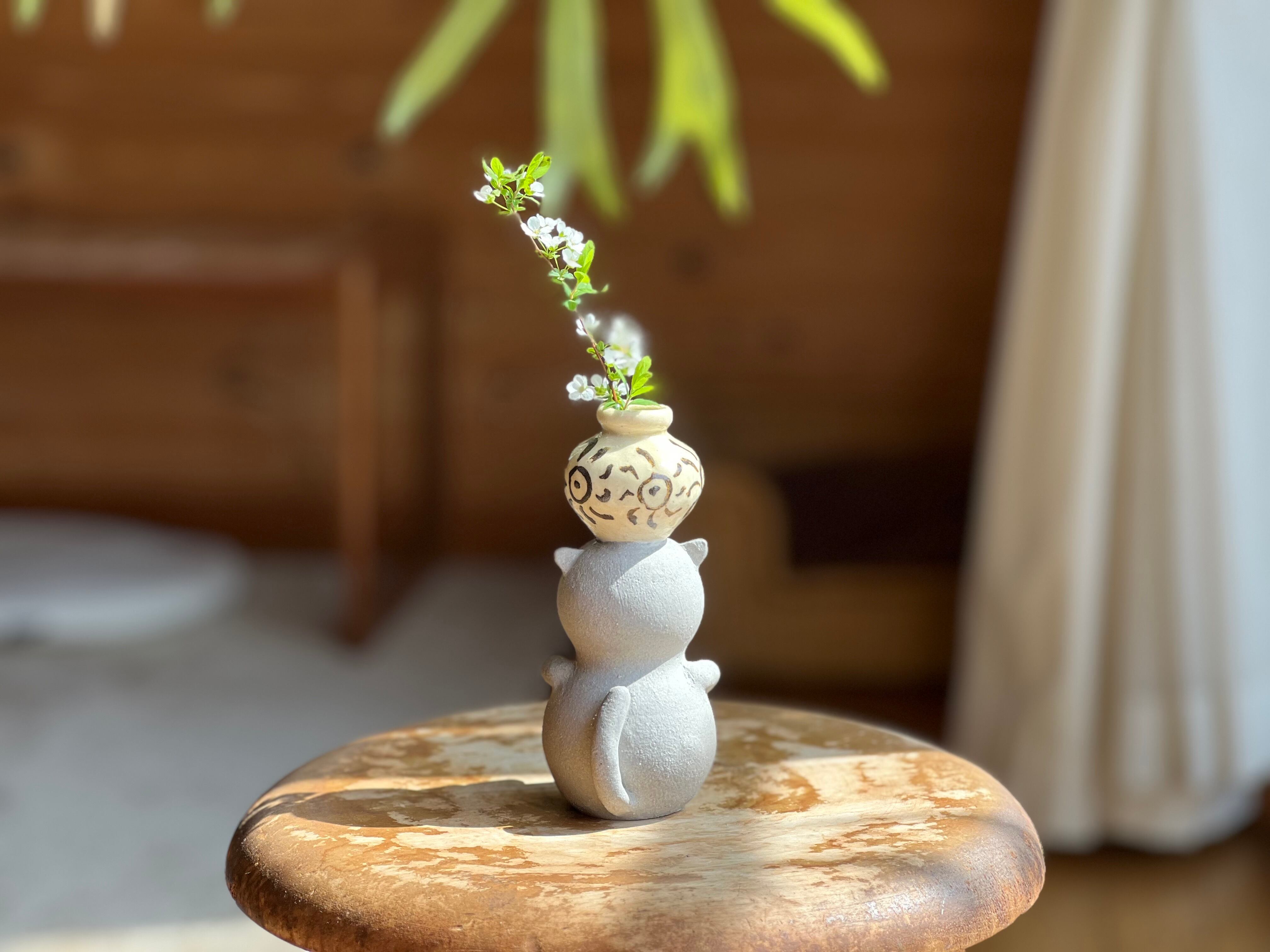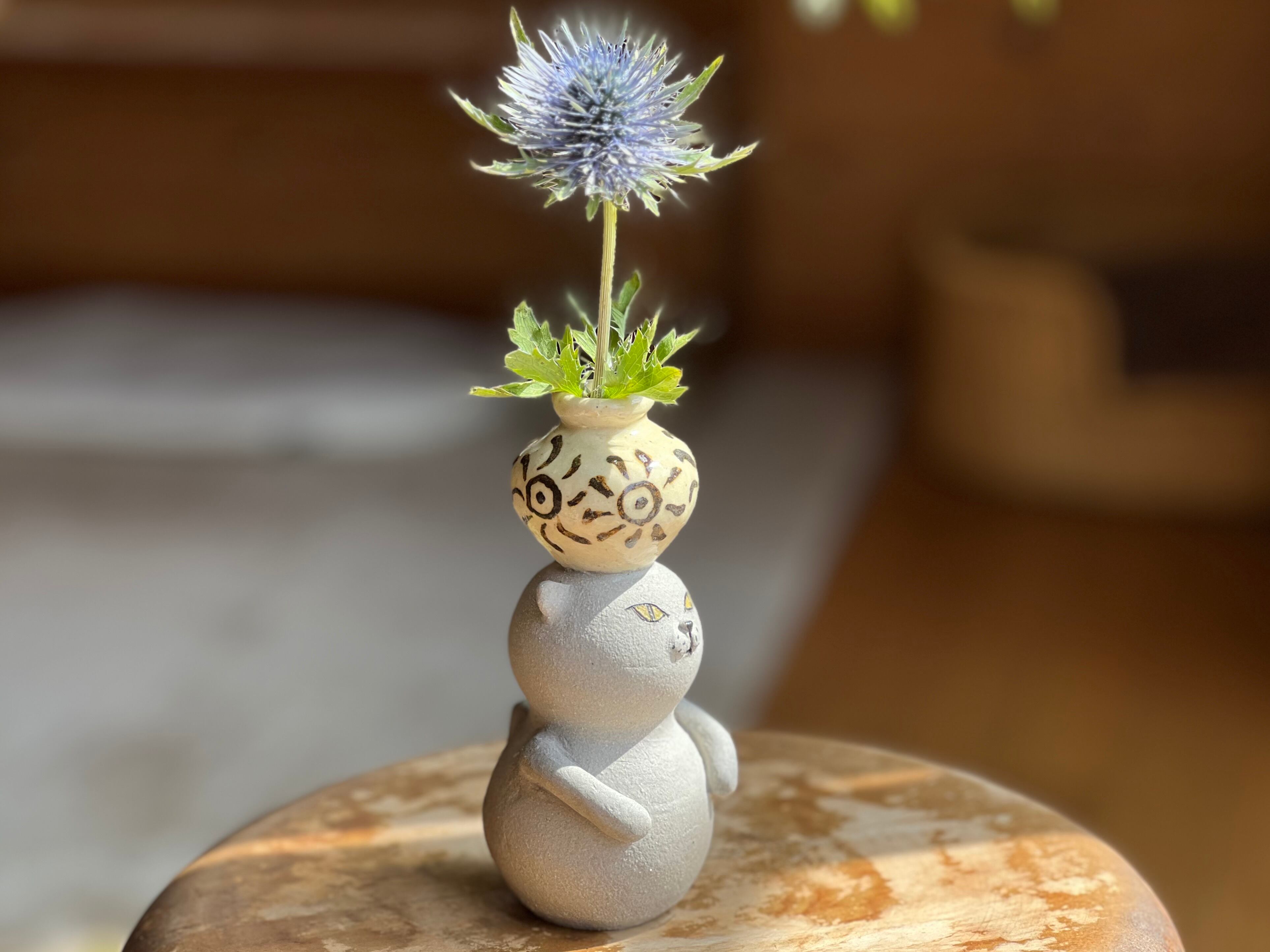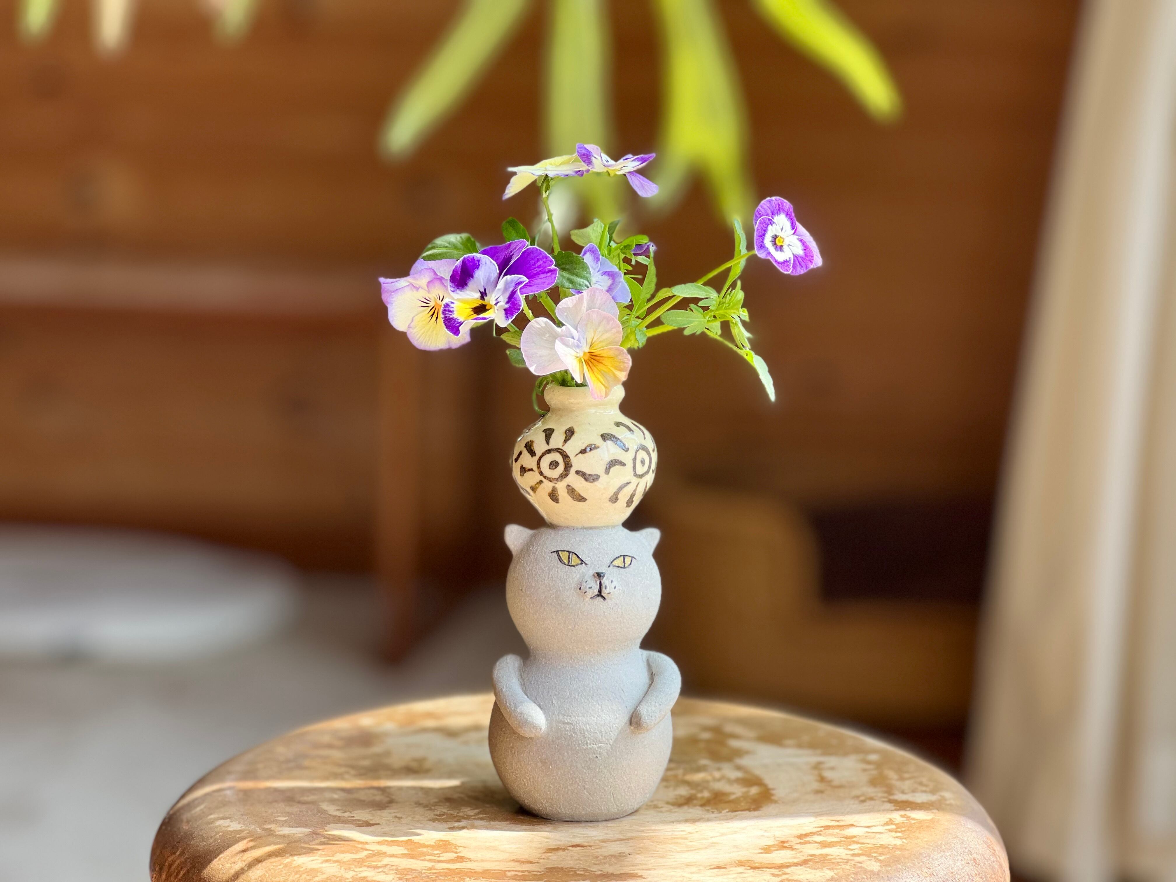 グレー猫さんが壺を頭に乗せた一輪挿しです。猫好きの方や花を飾るのが好きな方にぴったりのアイテムです。
