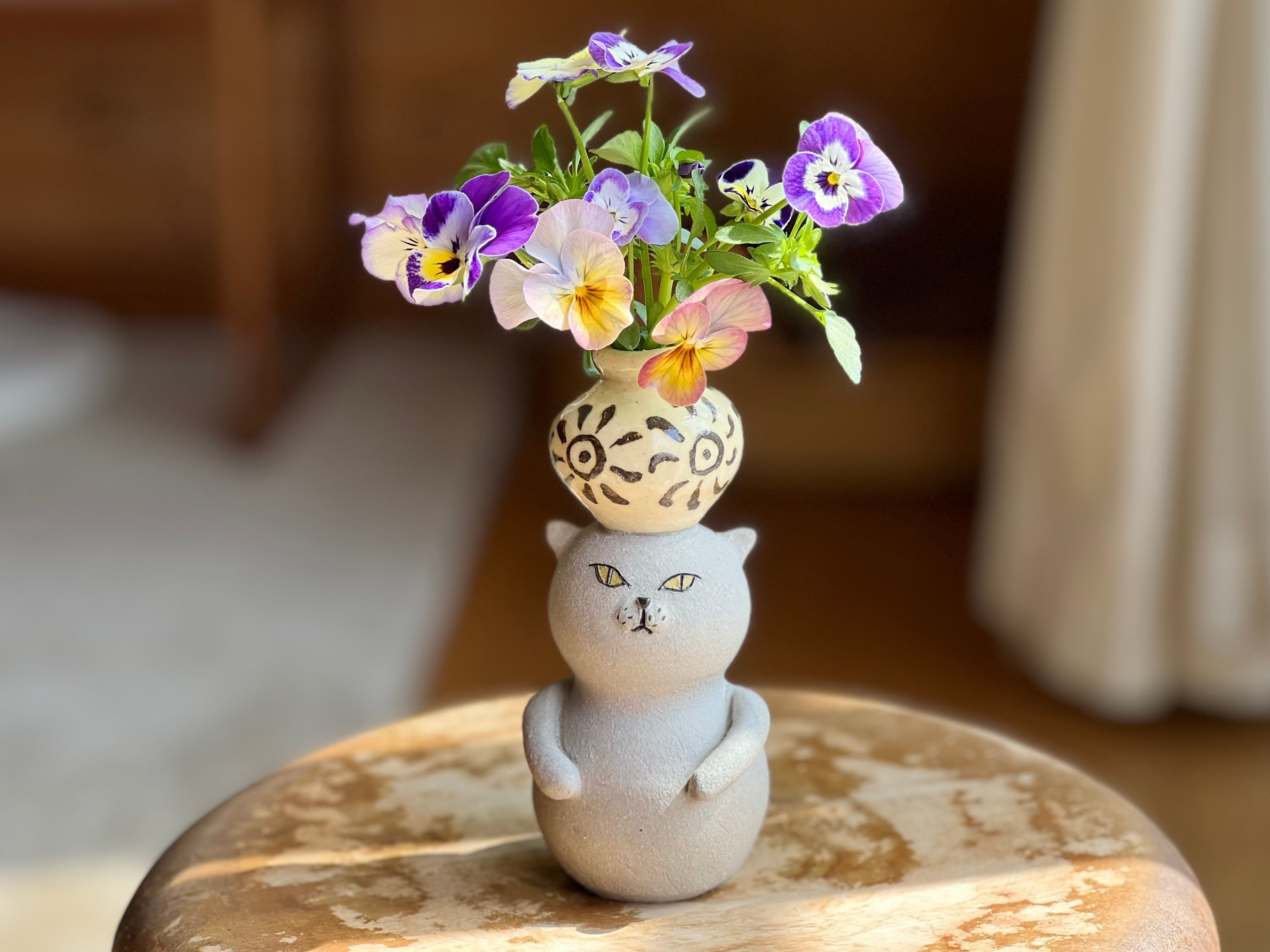 猫さん花瓶は、手作りの陶器製で、ひとつひとつ丁寧に作られています。そのため、それぞれの表情や模様が微妙に異なるのも魅力の一つです。
