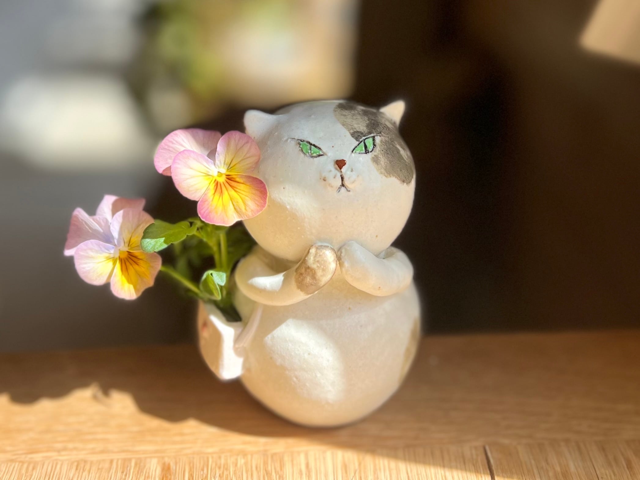 猫さん花瓶は、手作りの陶器製で、ひとつひとつ丁寧に作られています。そのため、それぞれの表情や模様が微妙に異なるのも魅力の一つです。