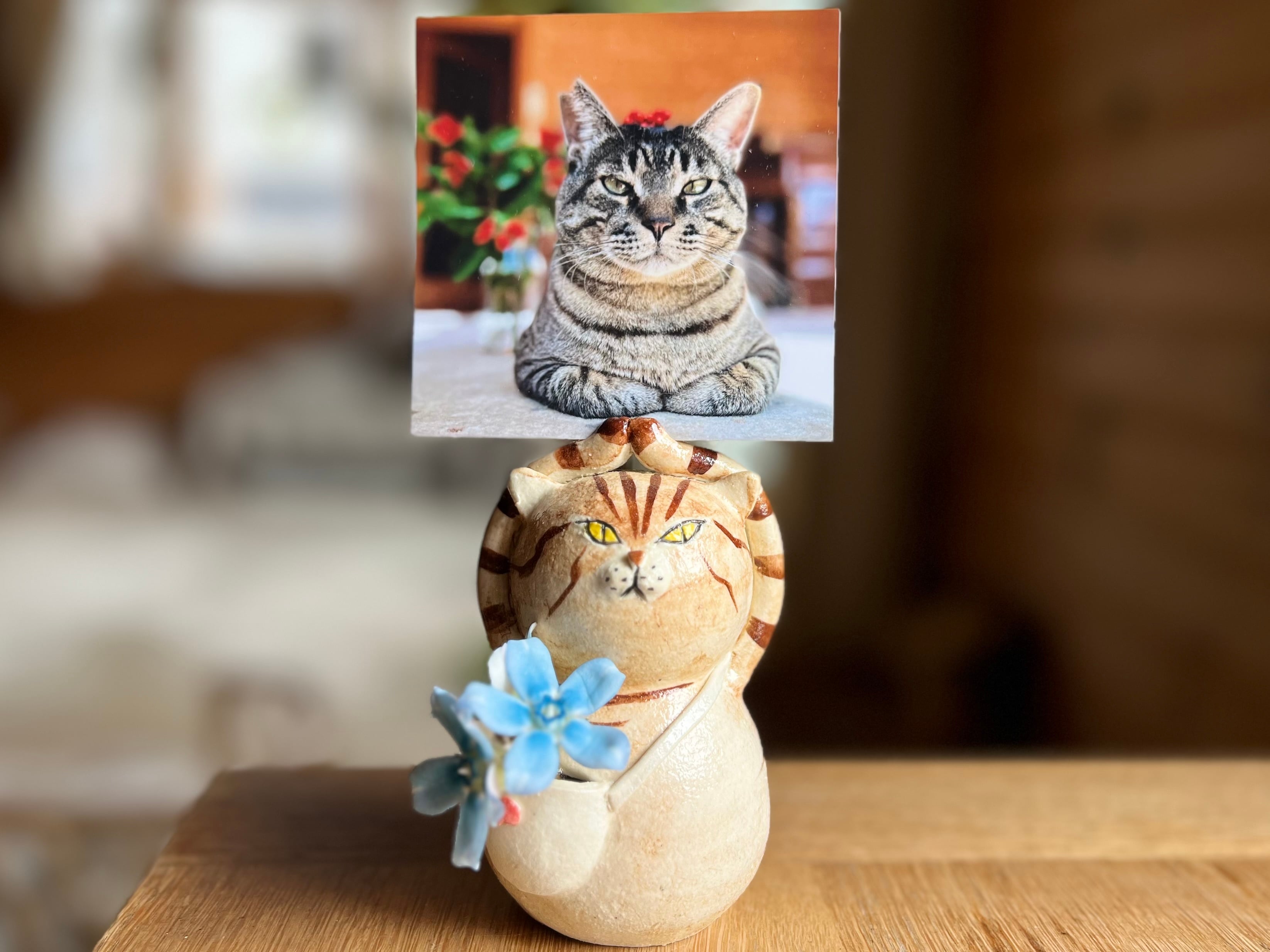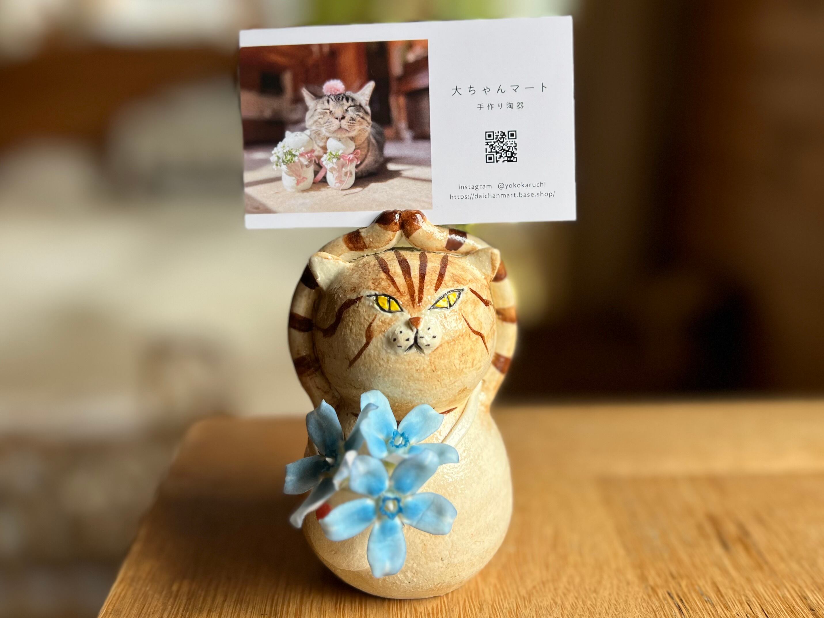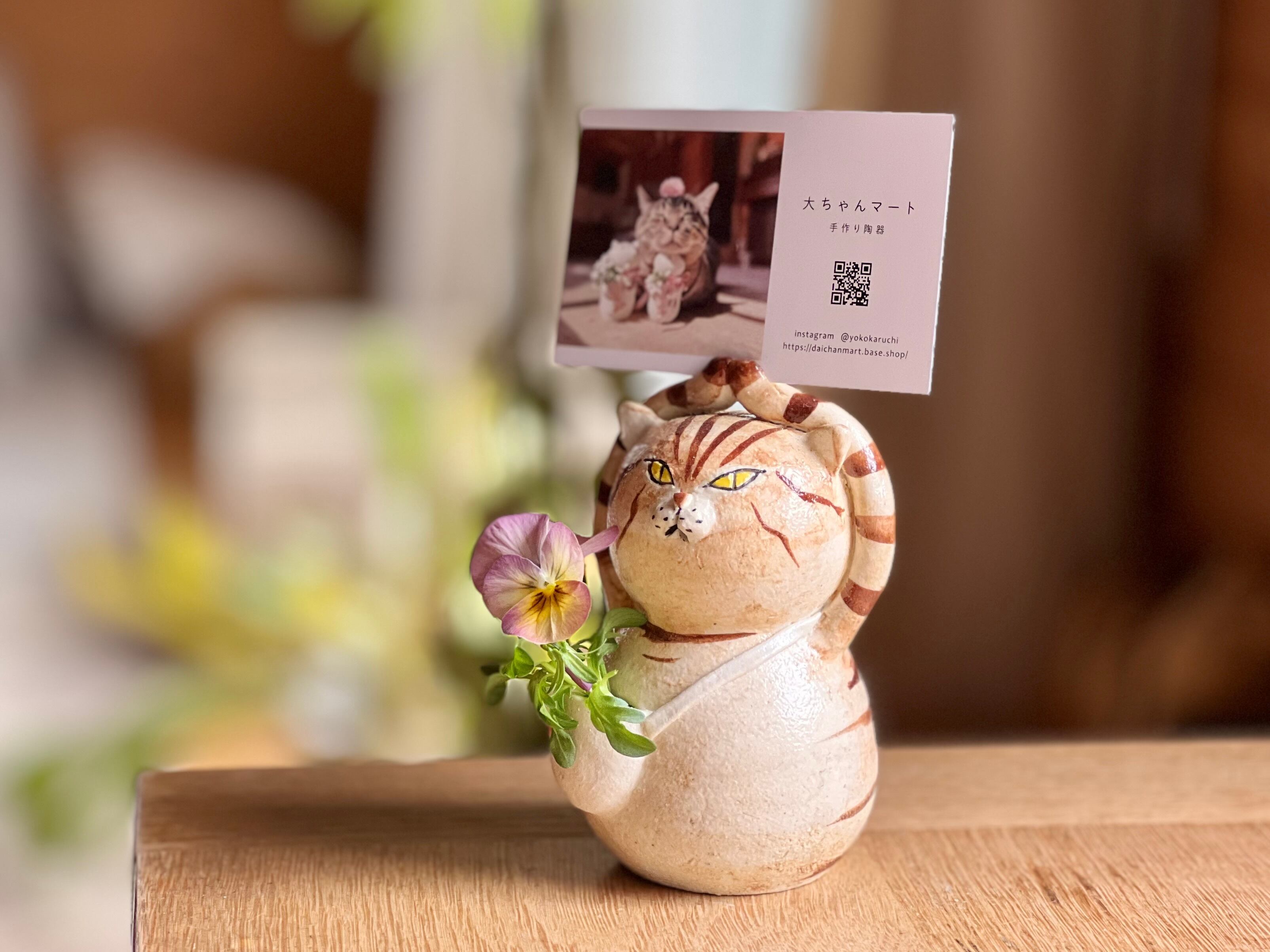茶トラさんがカードやハガキを持つことができる一輪挿しです。猫好きの方や花を飾るのが好きな方にぴったりのアイテムです。