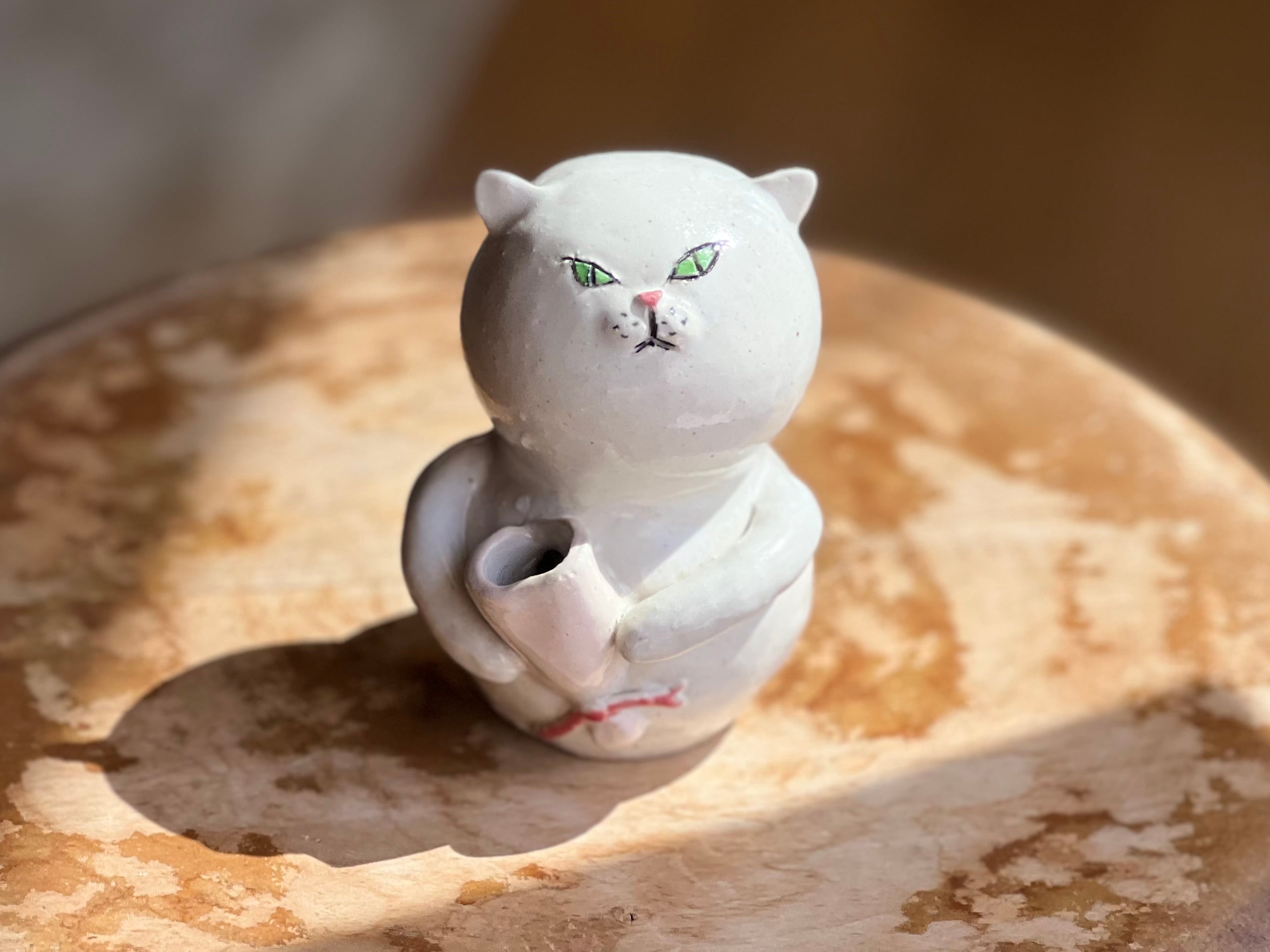 猫さん花瓶は、手作りの陶器製で、ひとつひとつ丁寧に作られています。そのため、それぞれの表情や模様が微妙に異なるのも魅力の一つです。