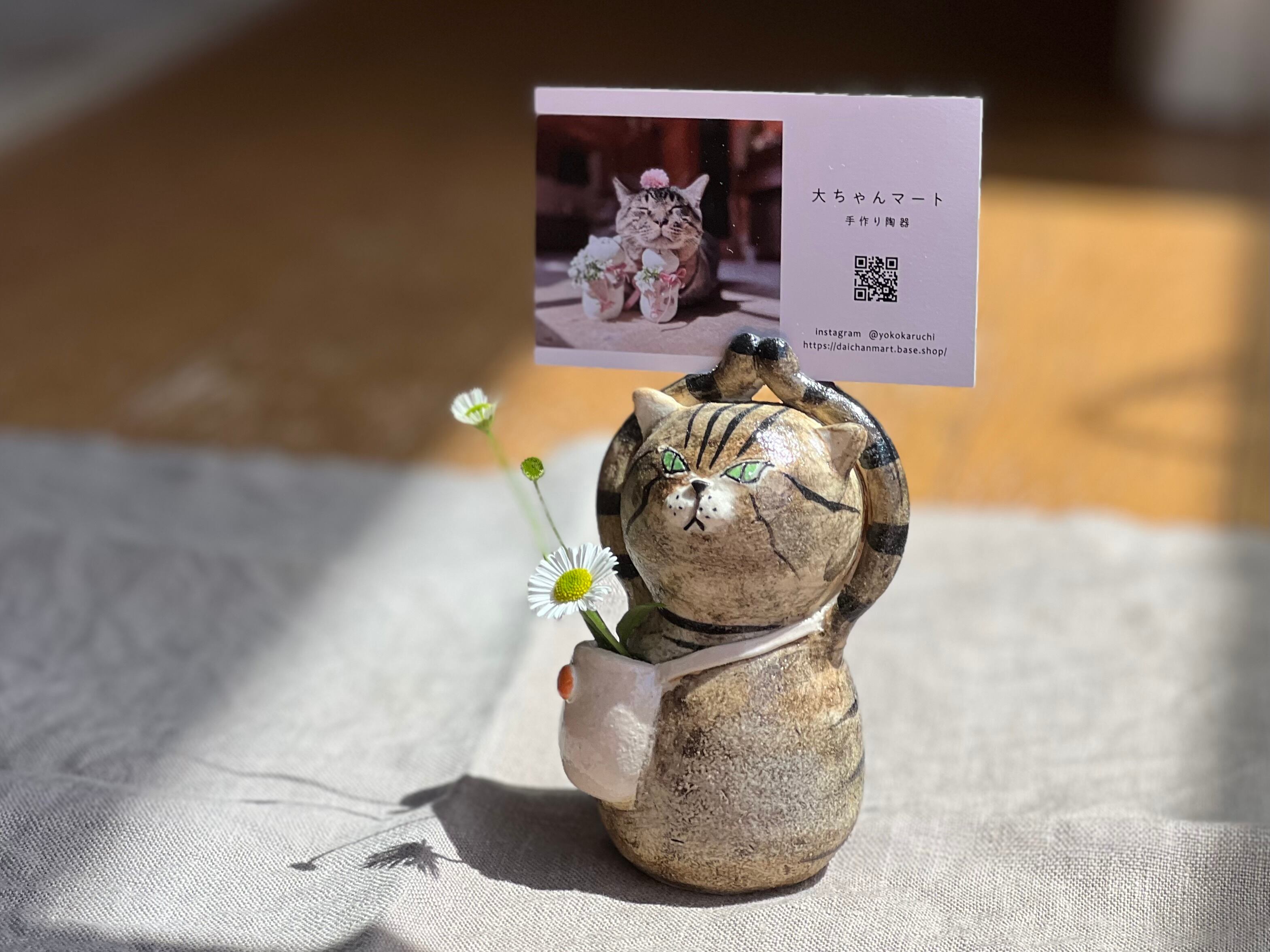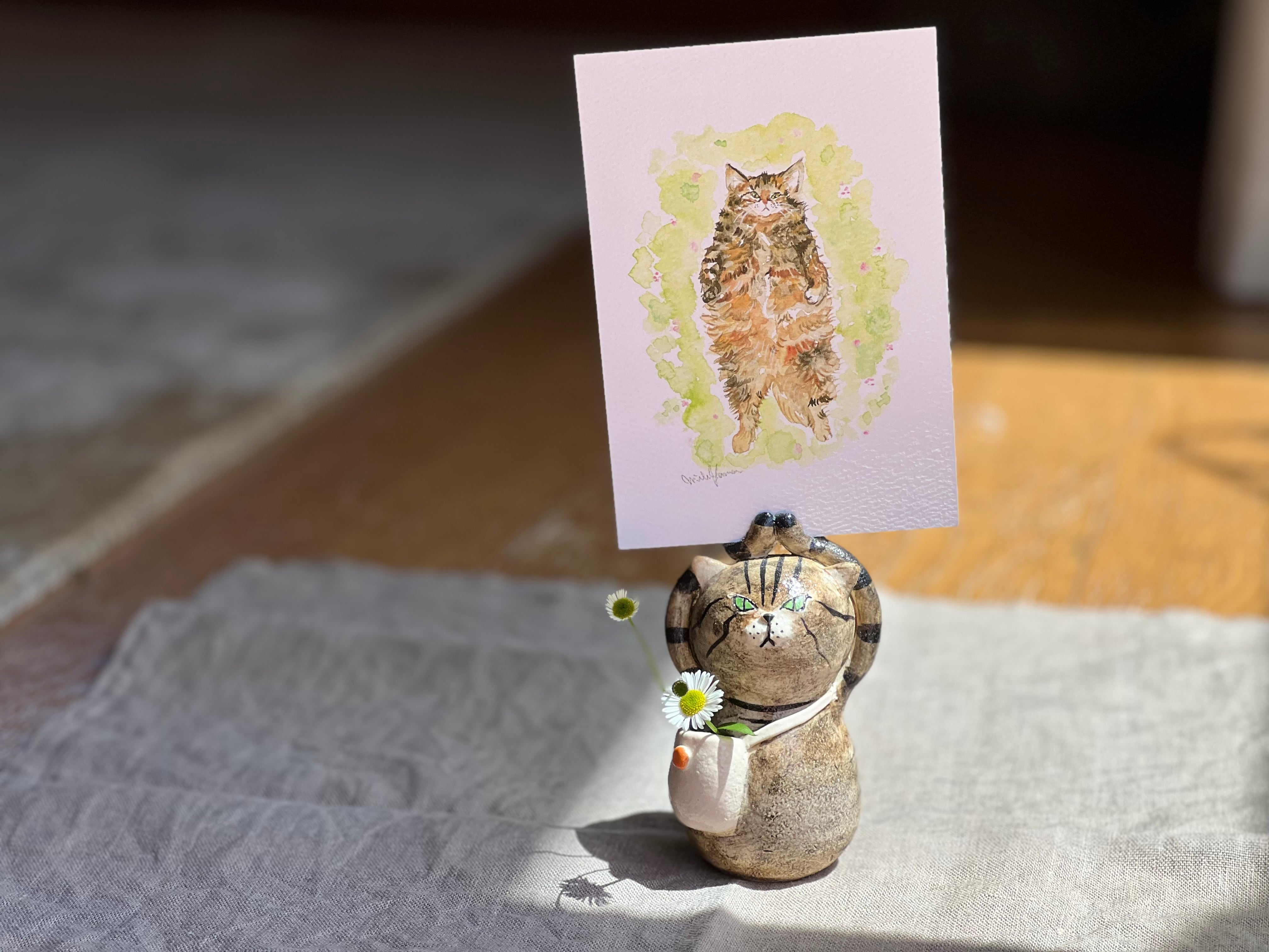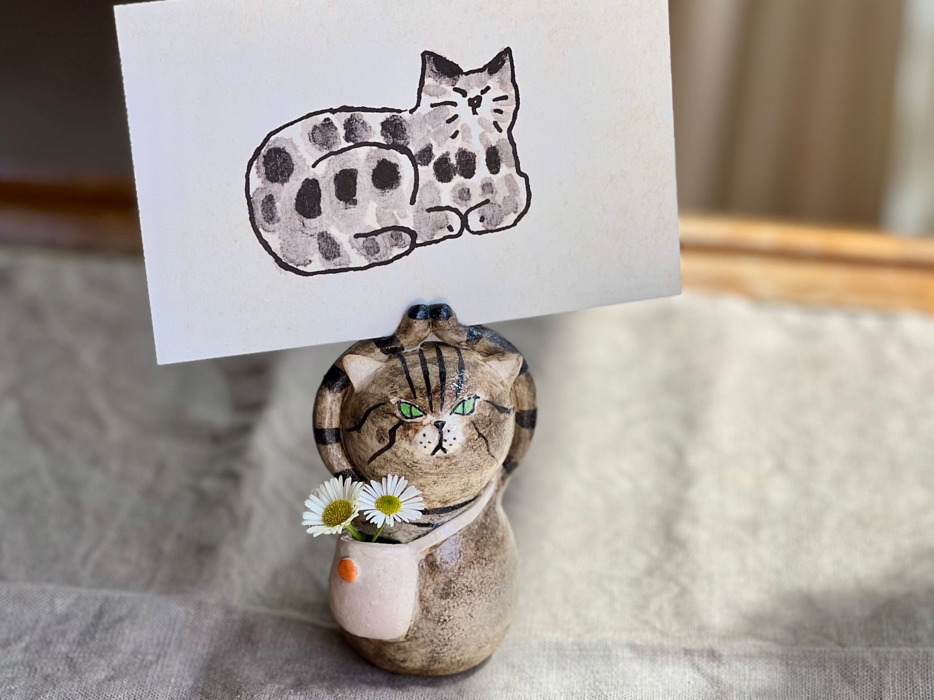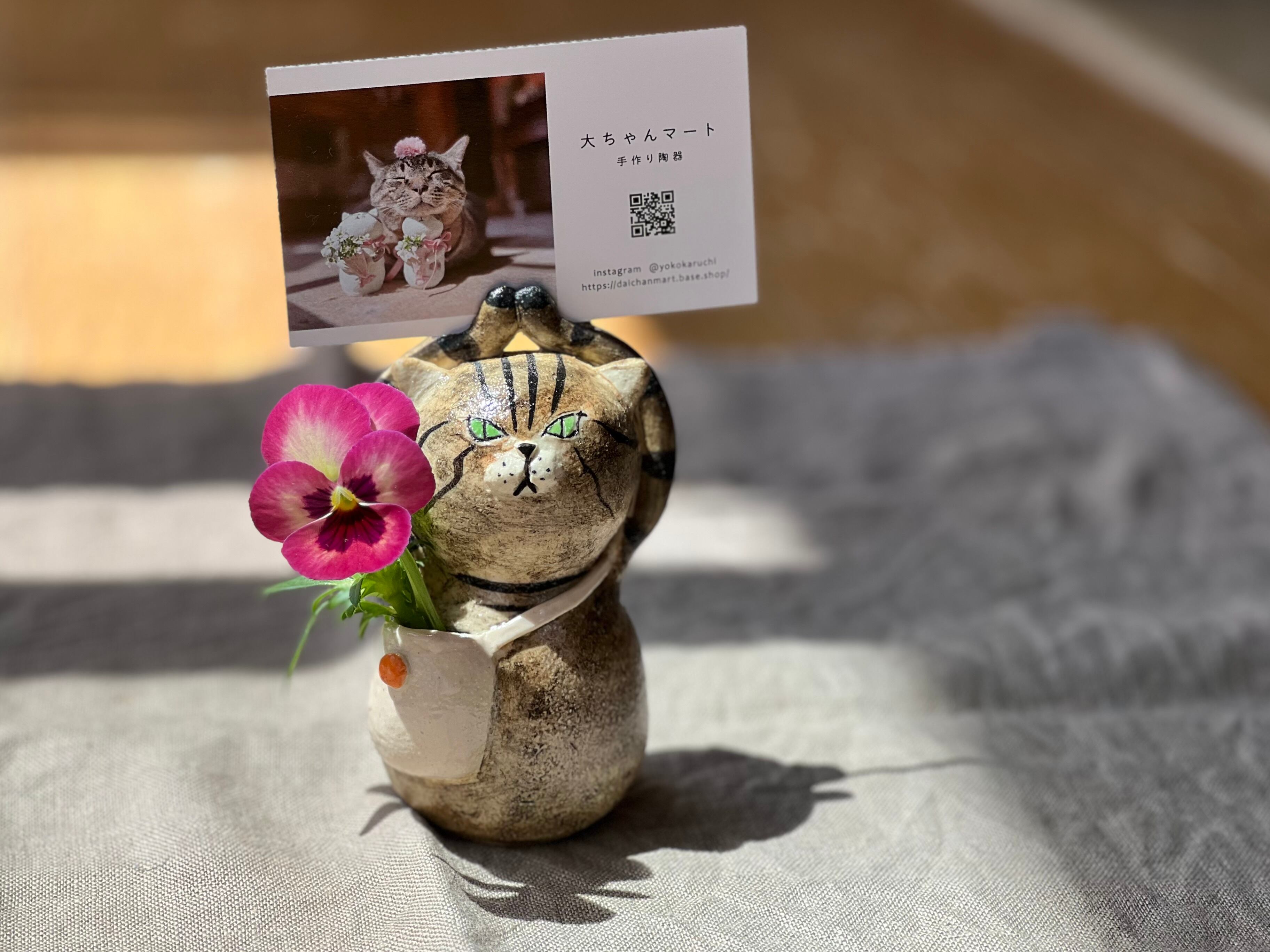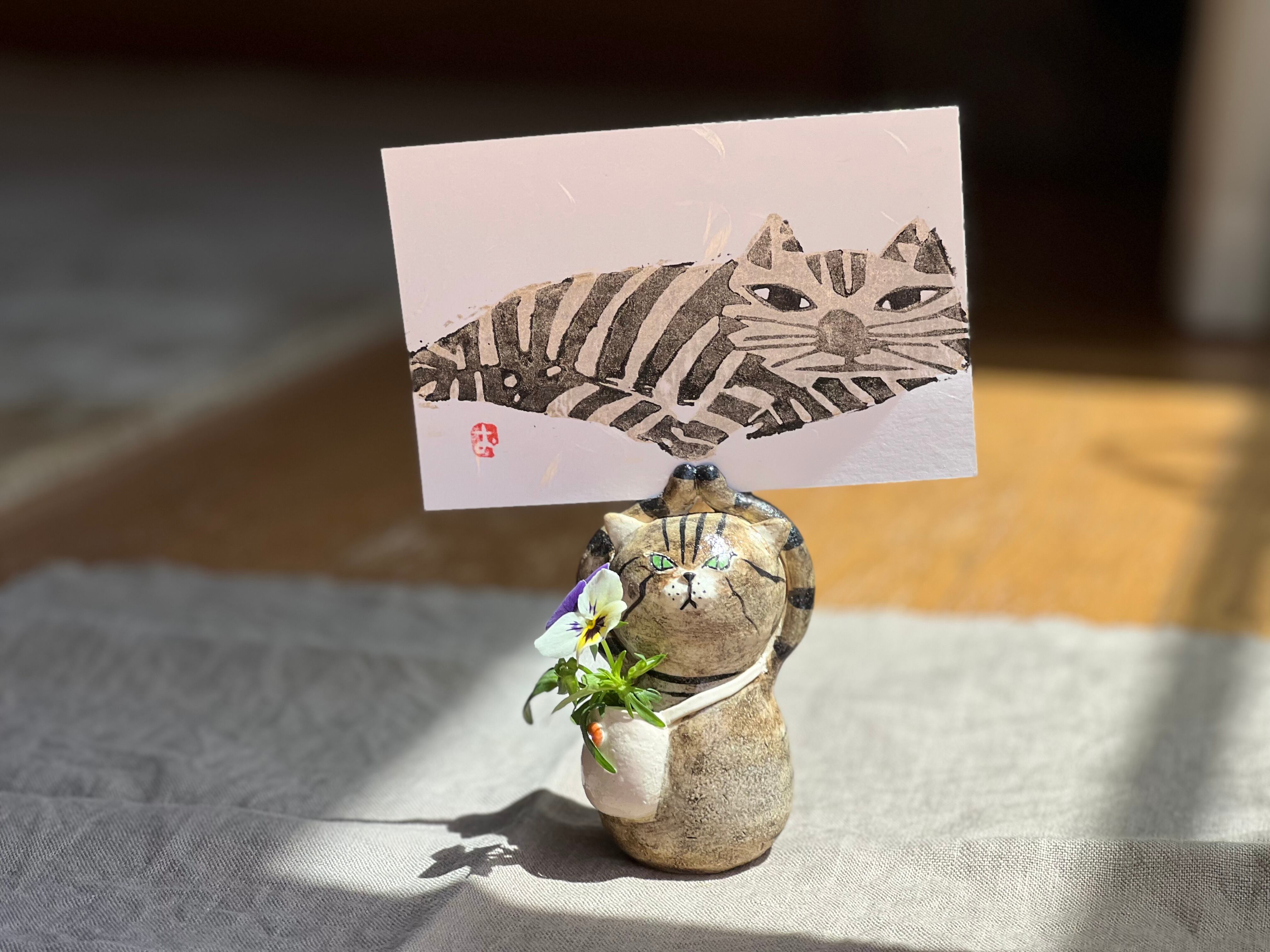 とら猫さんがカードやハガキを持つことができる一輪挿しです。猫好きの方や花を飾るのが好きな方にぴったりのアイテムです。
