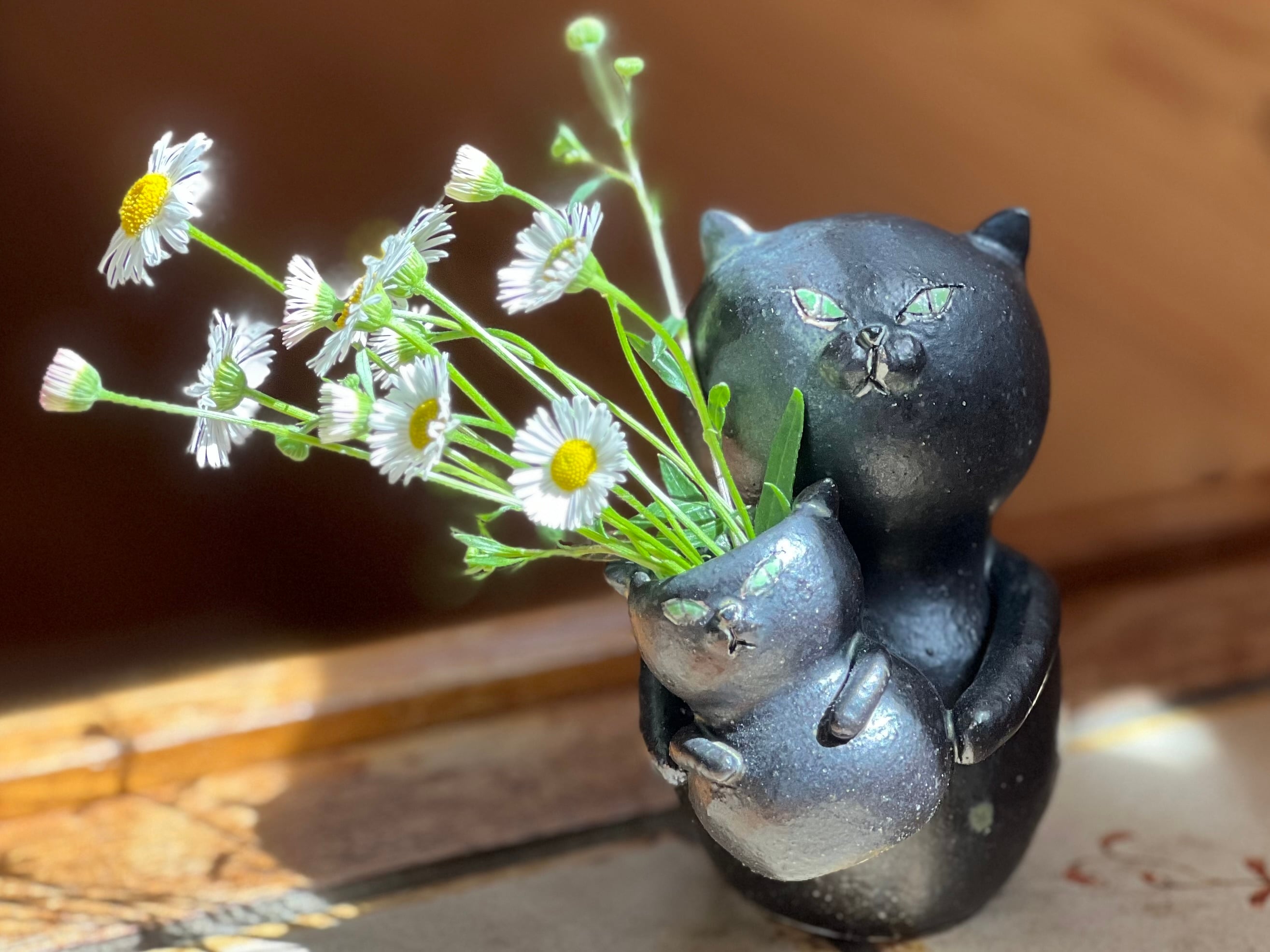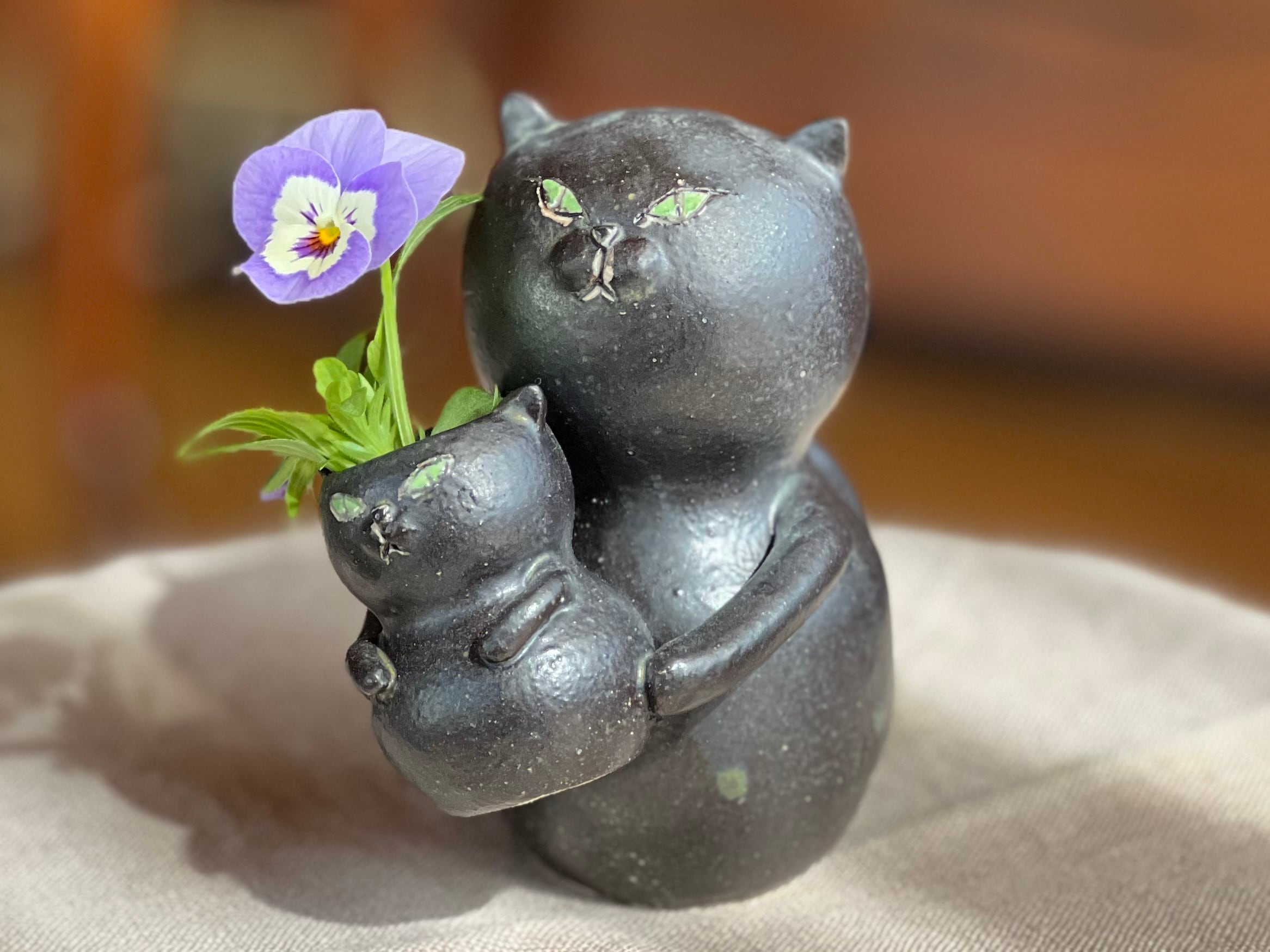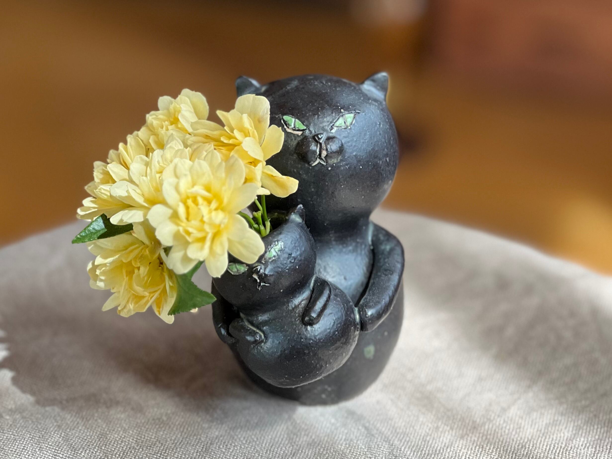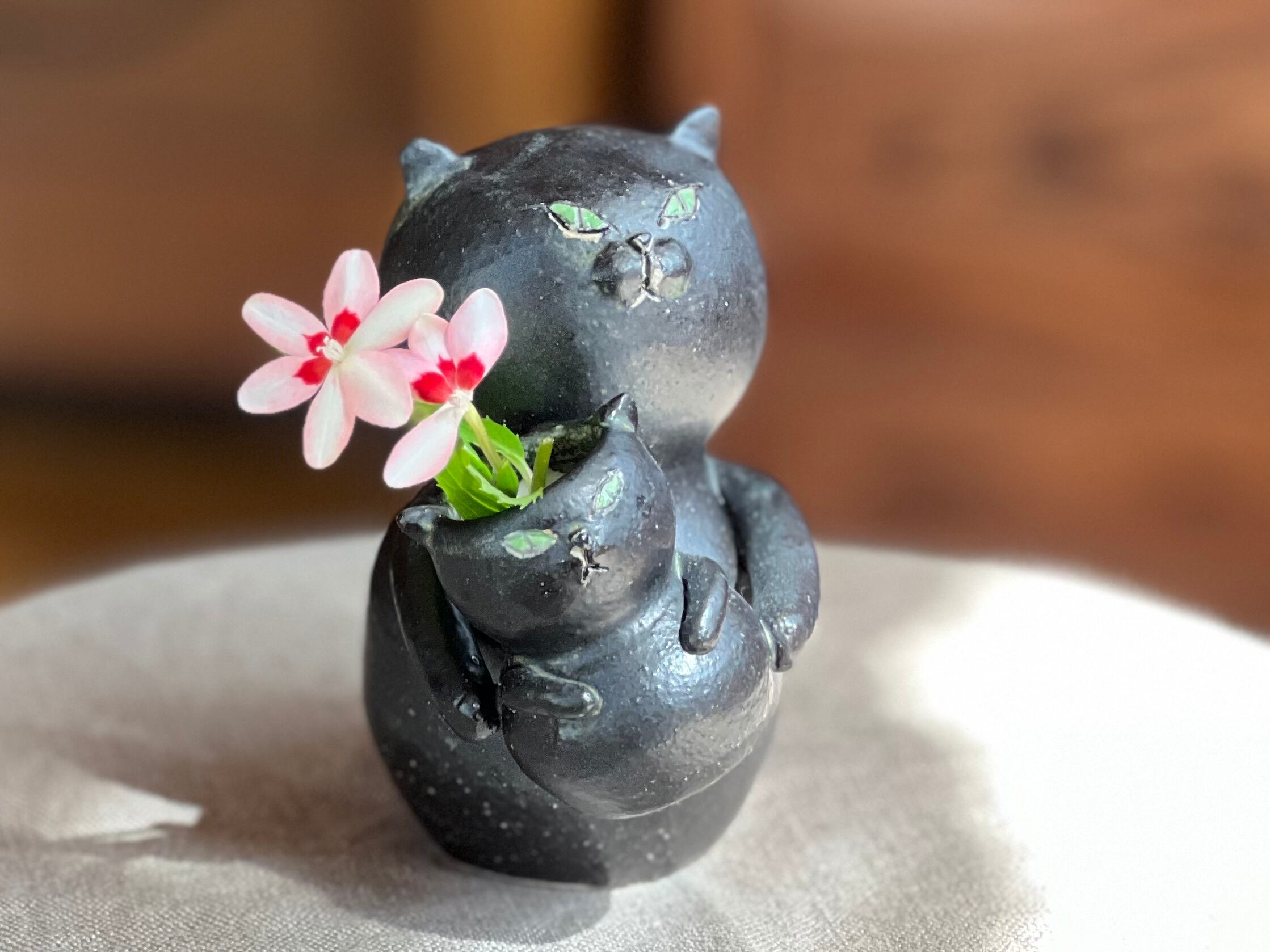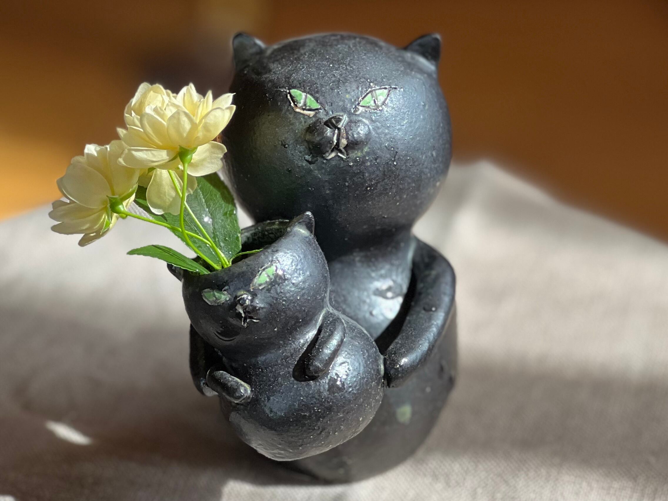 黒猫さんが小さい猫さんを抱っこした一輪挿しです。猫好きの方や花を飾るのが好きな方にぴったりのアイテムです。