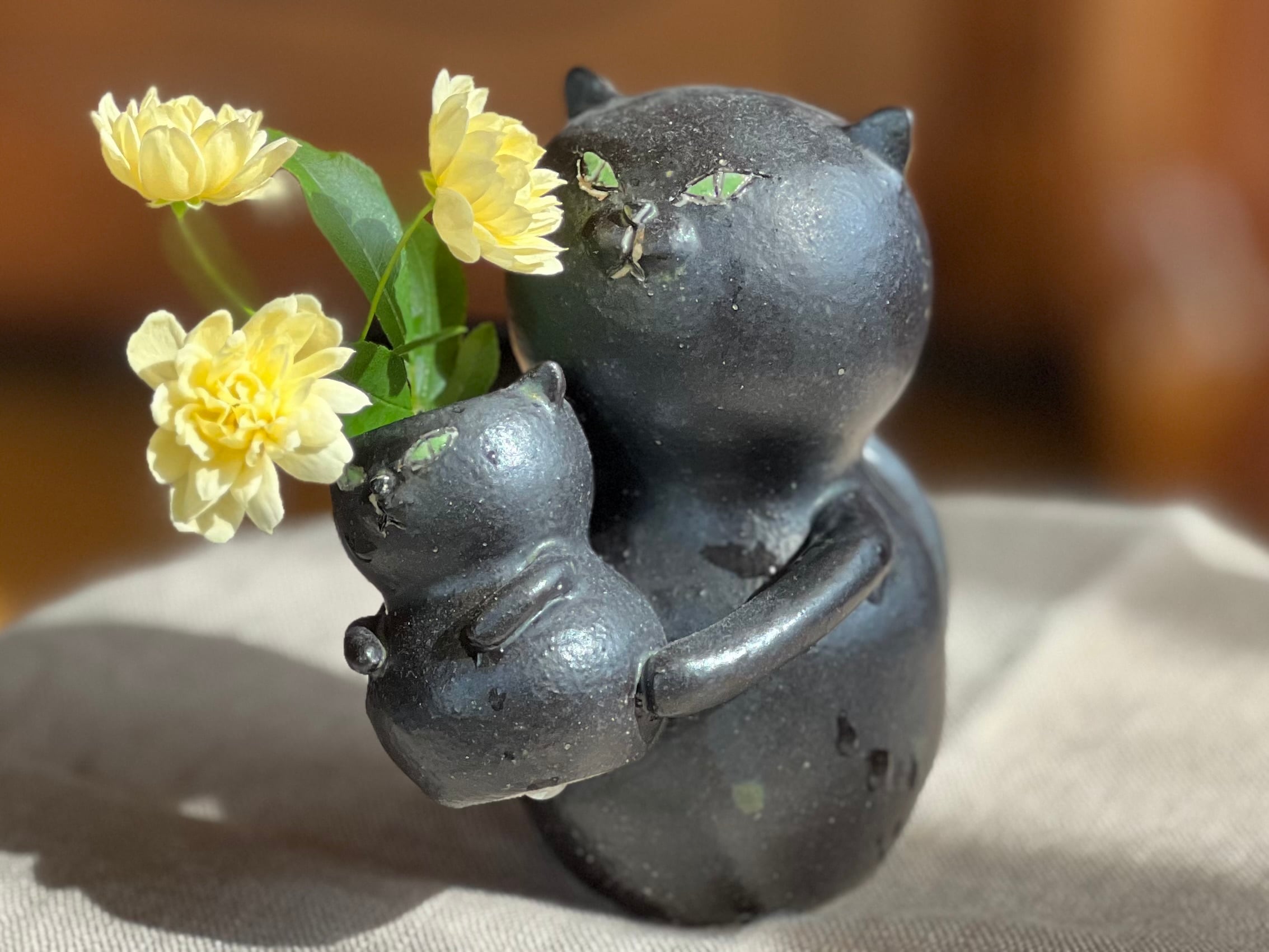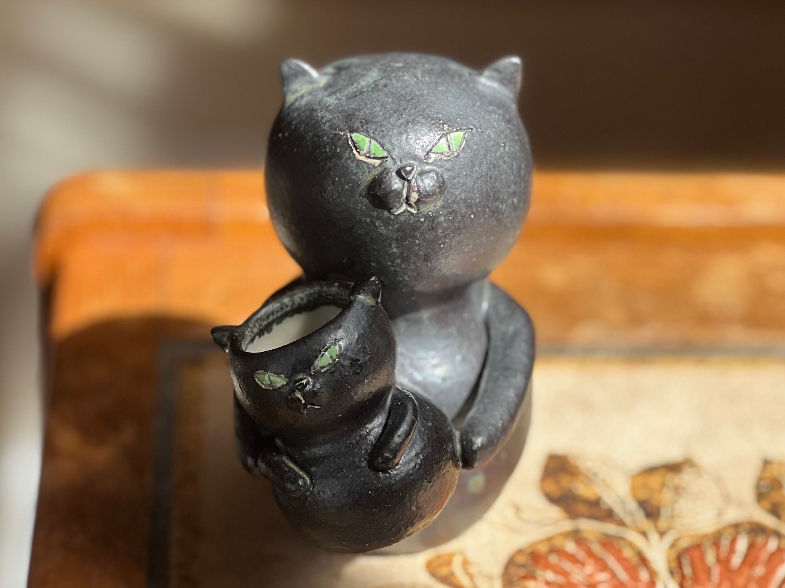 猫さん花瓶 小さい猫さんを抱っこした黒猫さん