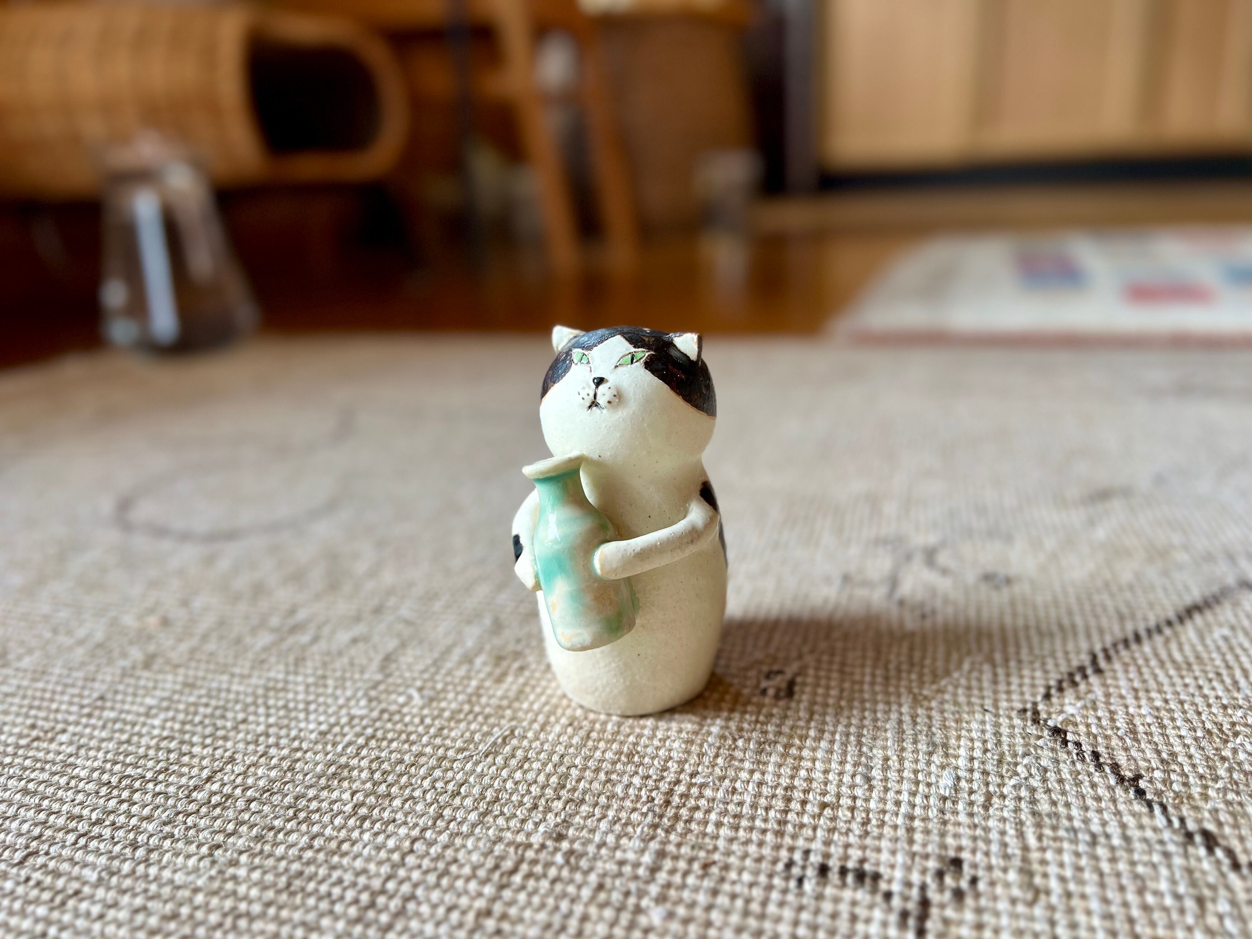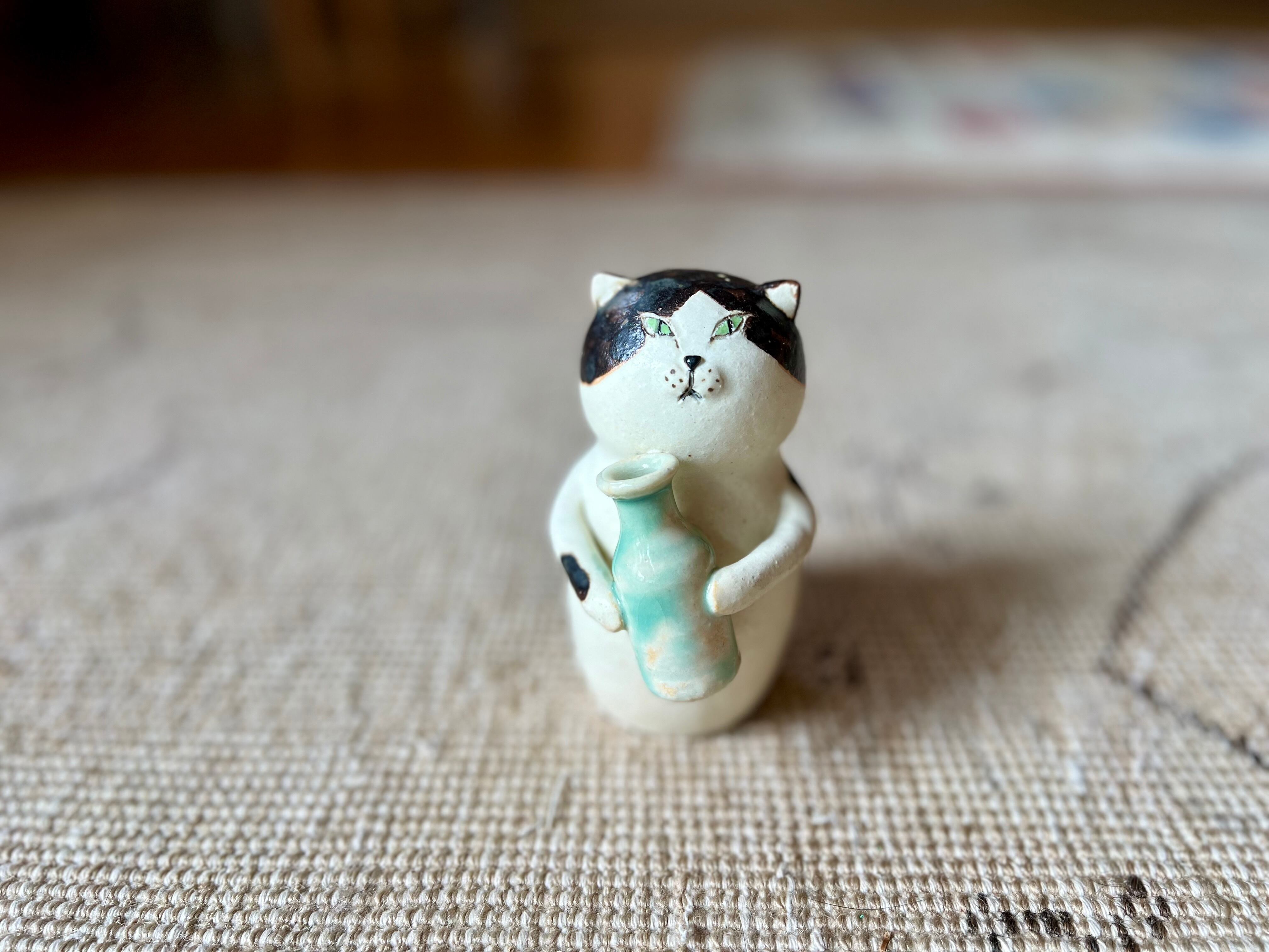 ハチワレ猫さんがボトルを持った一輪挿しです。猫好きの方や花を飾るのが好きな方にぴったりのアイテムです。