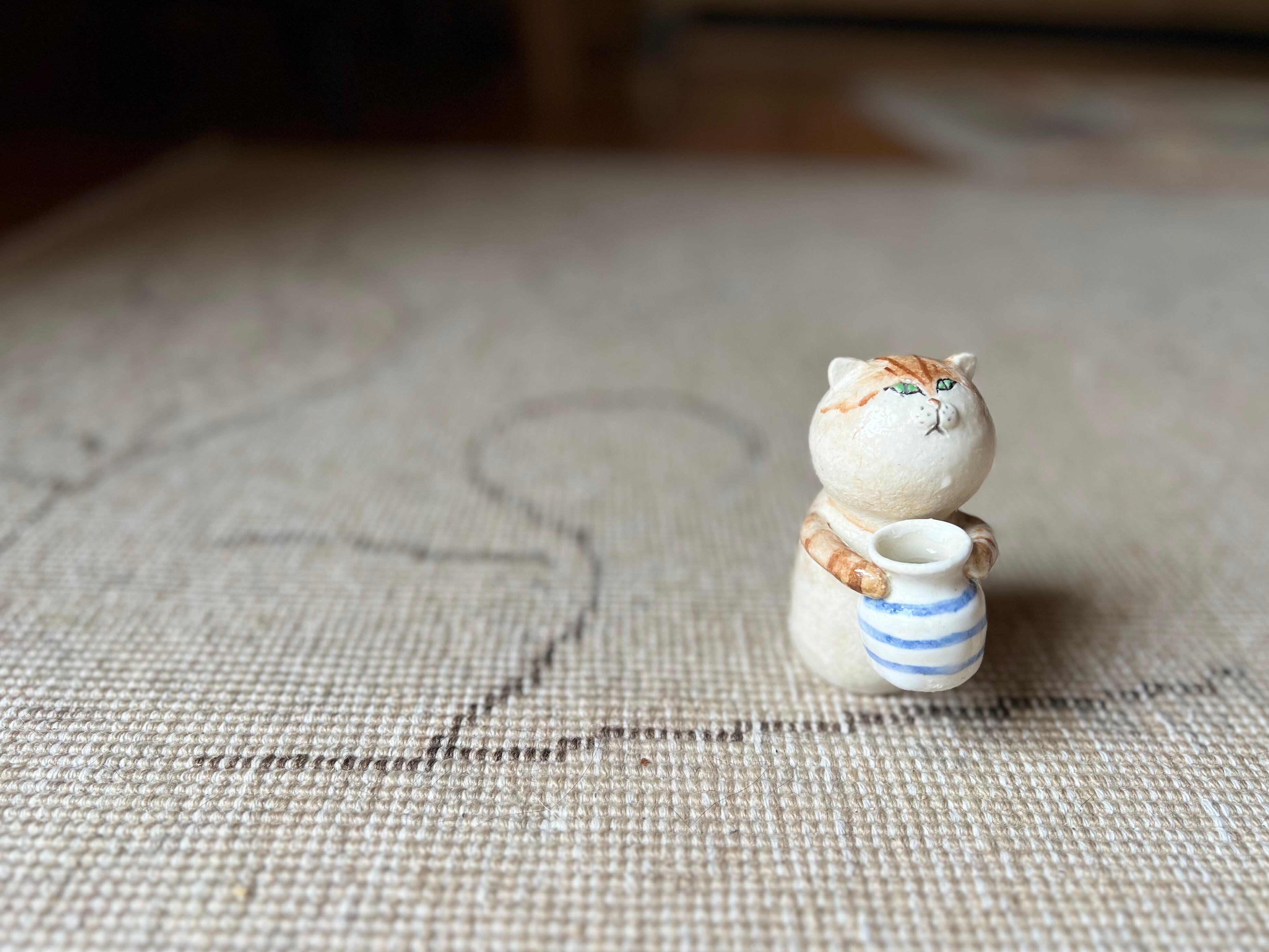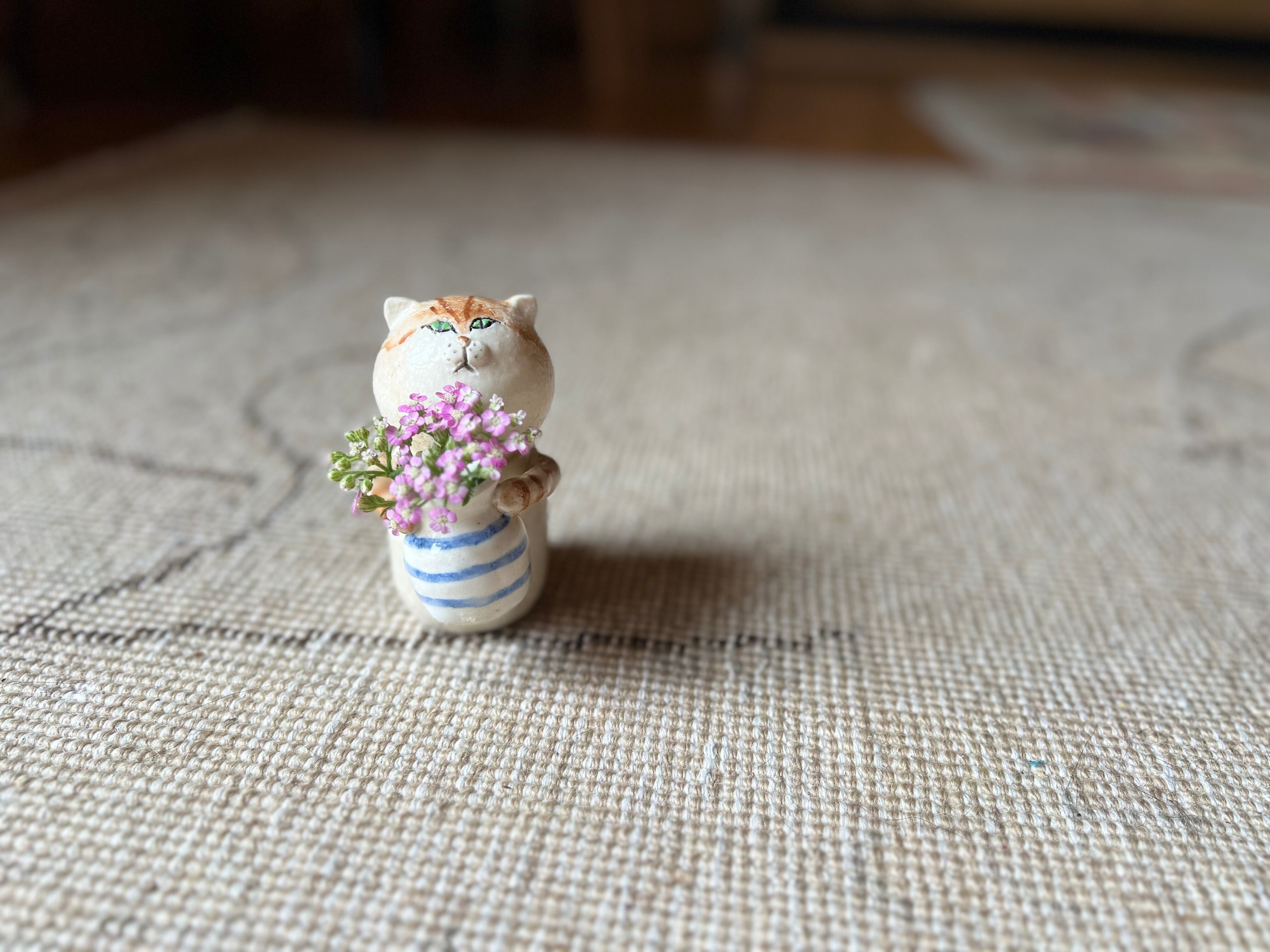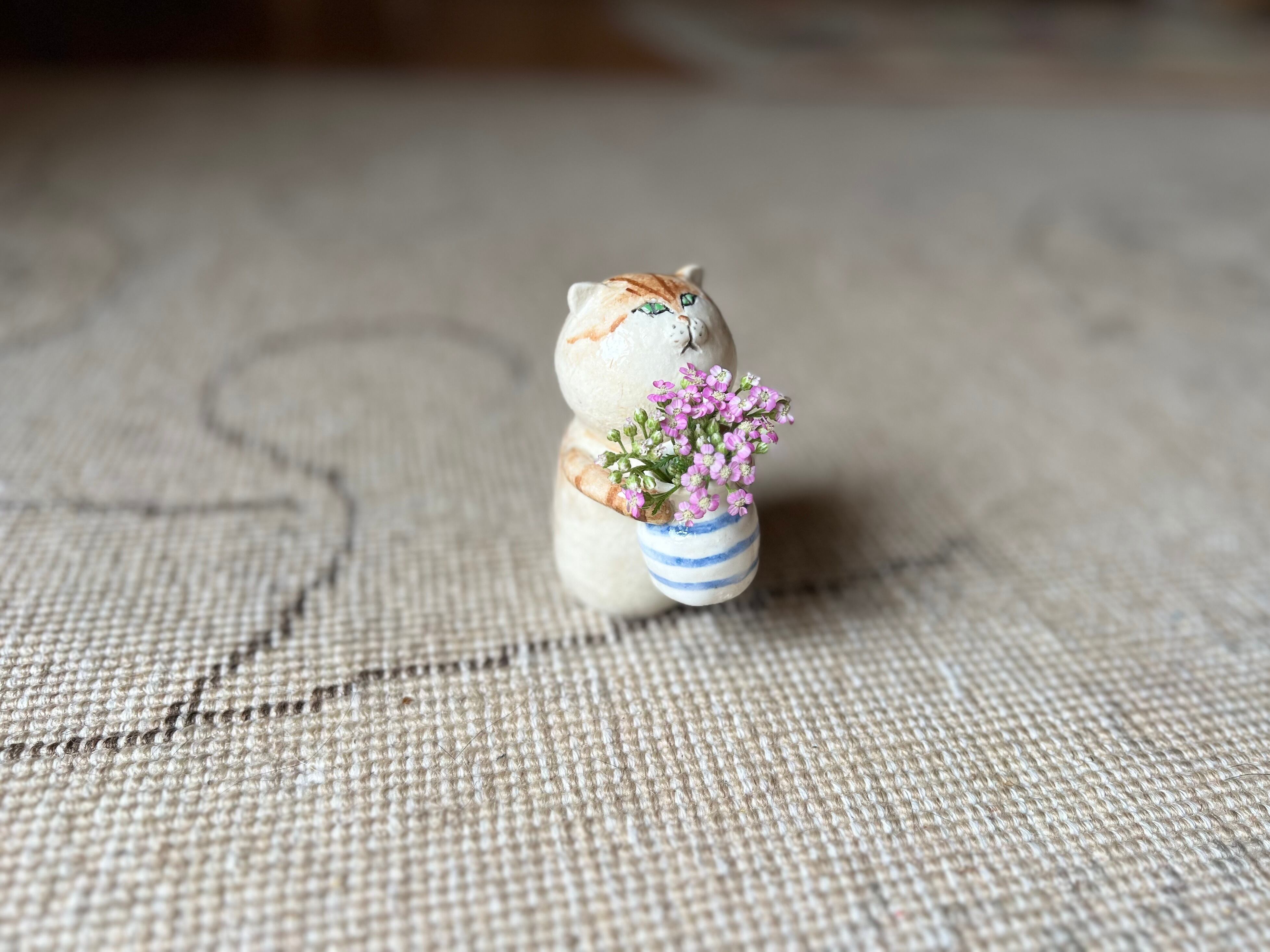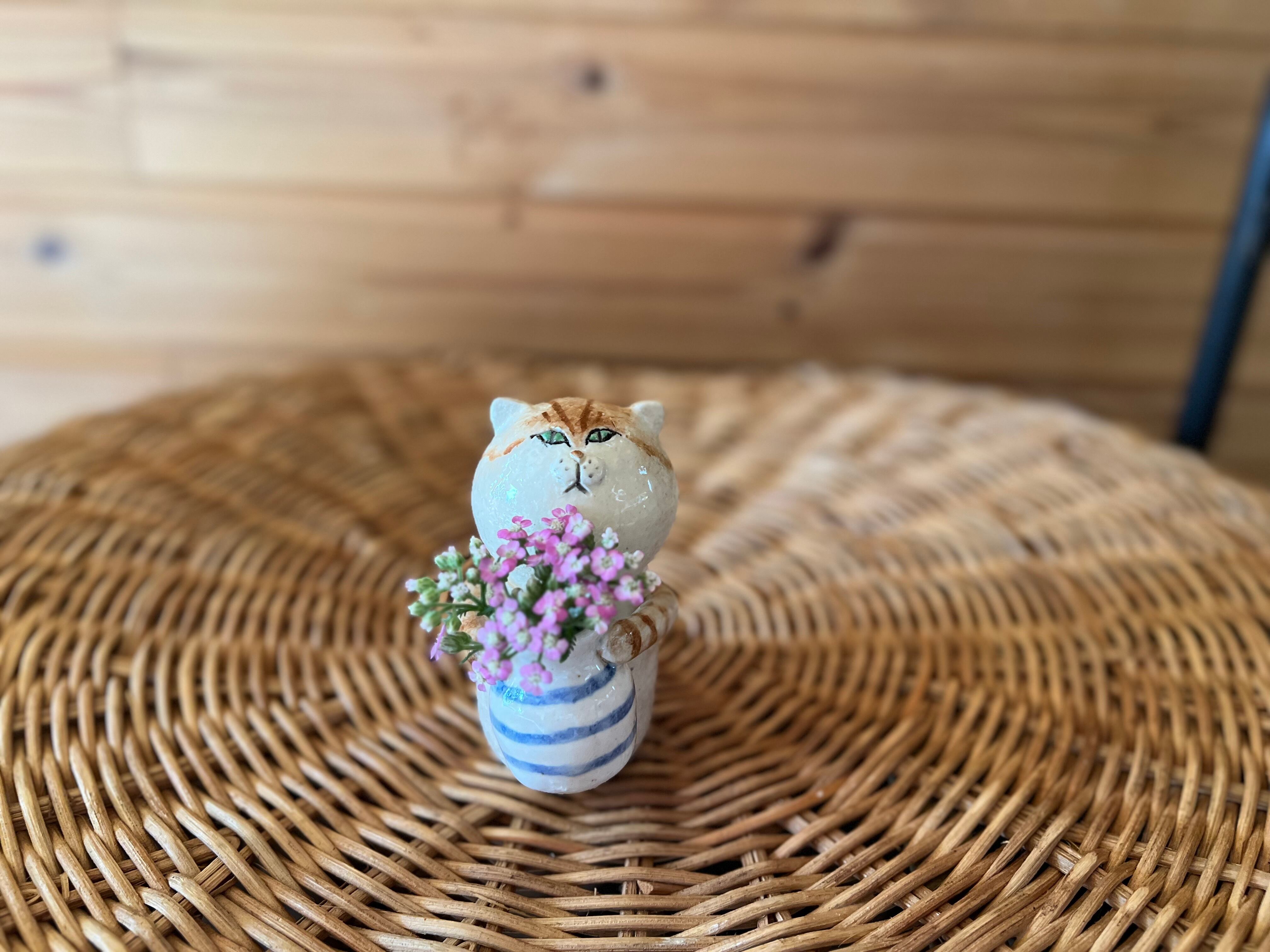 茶トラ猫さんがシマシマ花瓶を持った一輪挿しです。猫好きの方や花を飾るのが好きな方にぴったりのアイテムです。