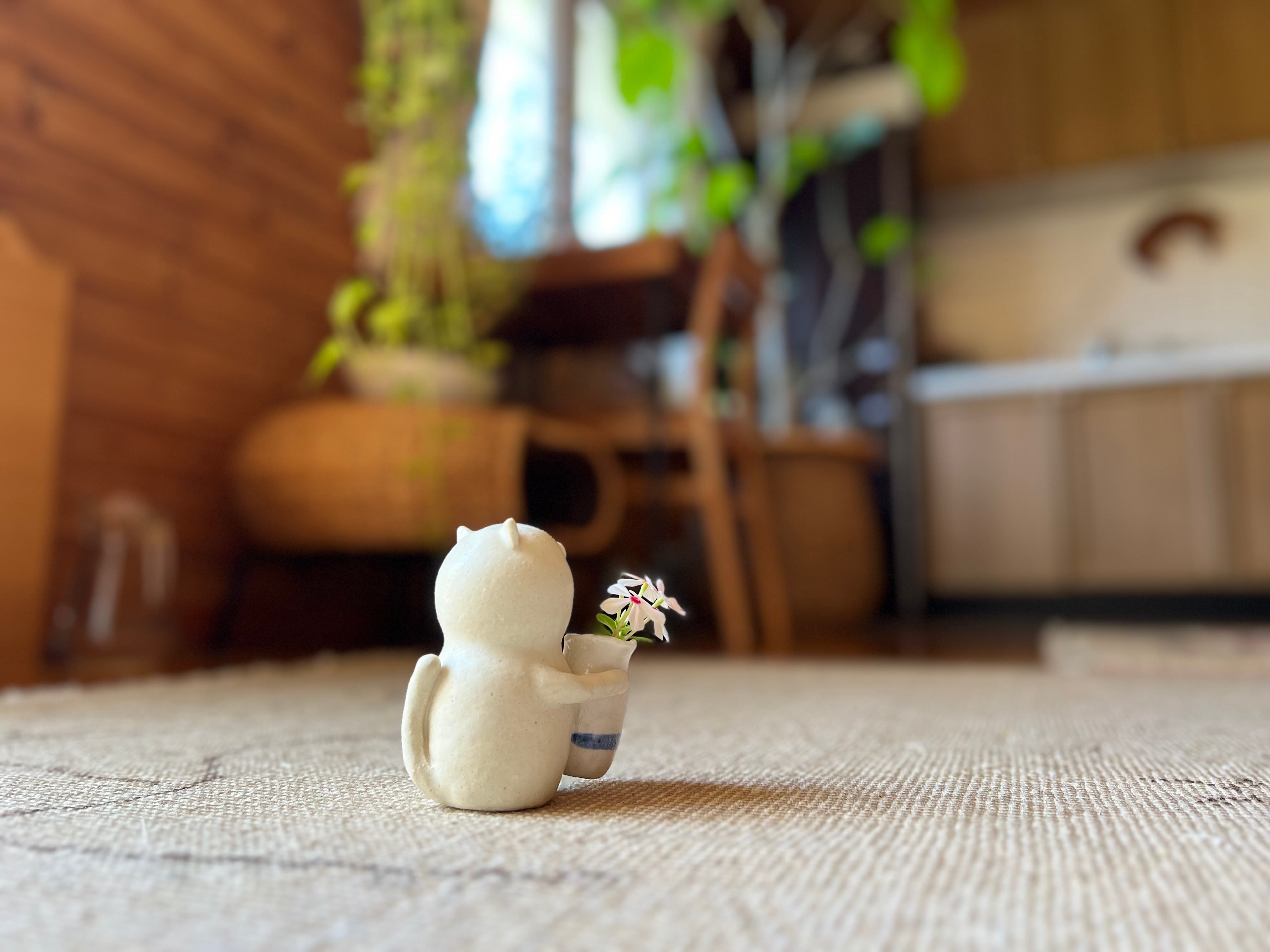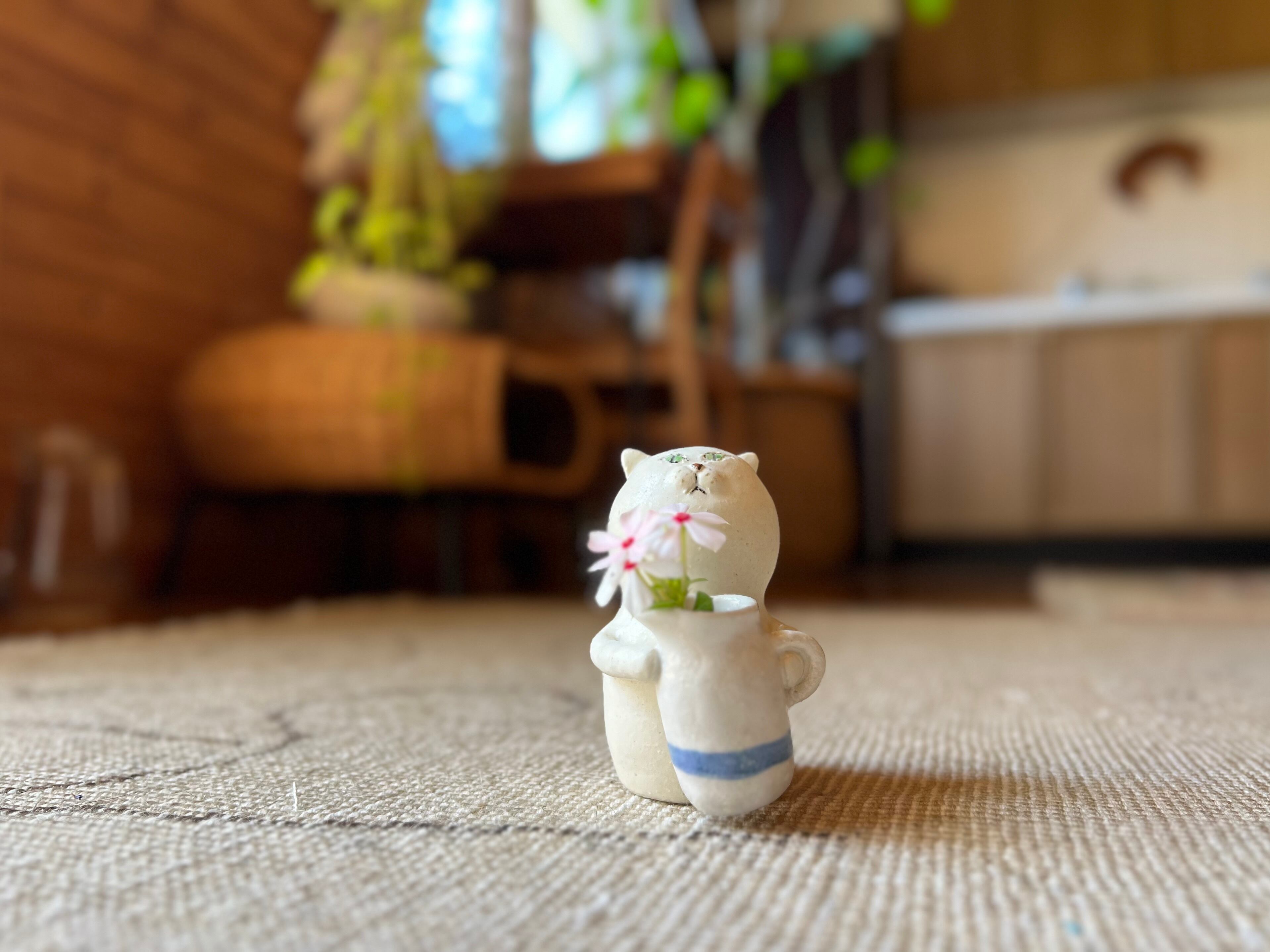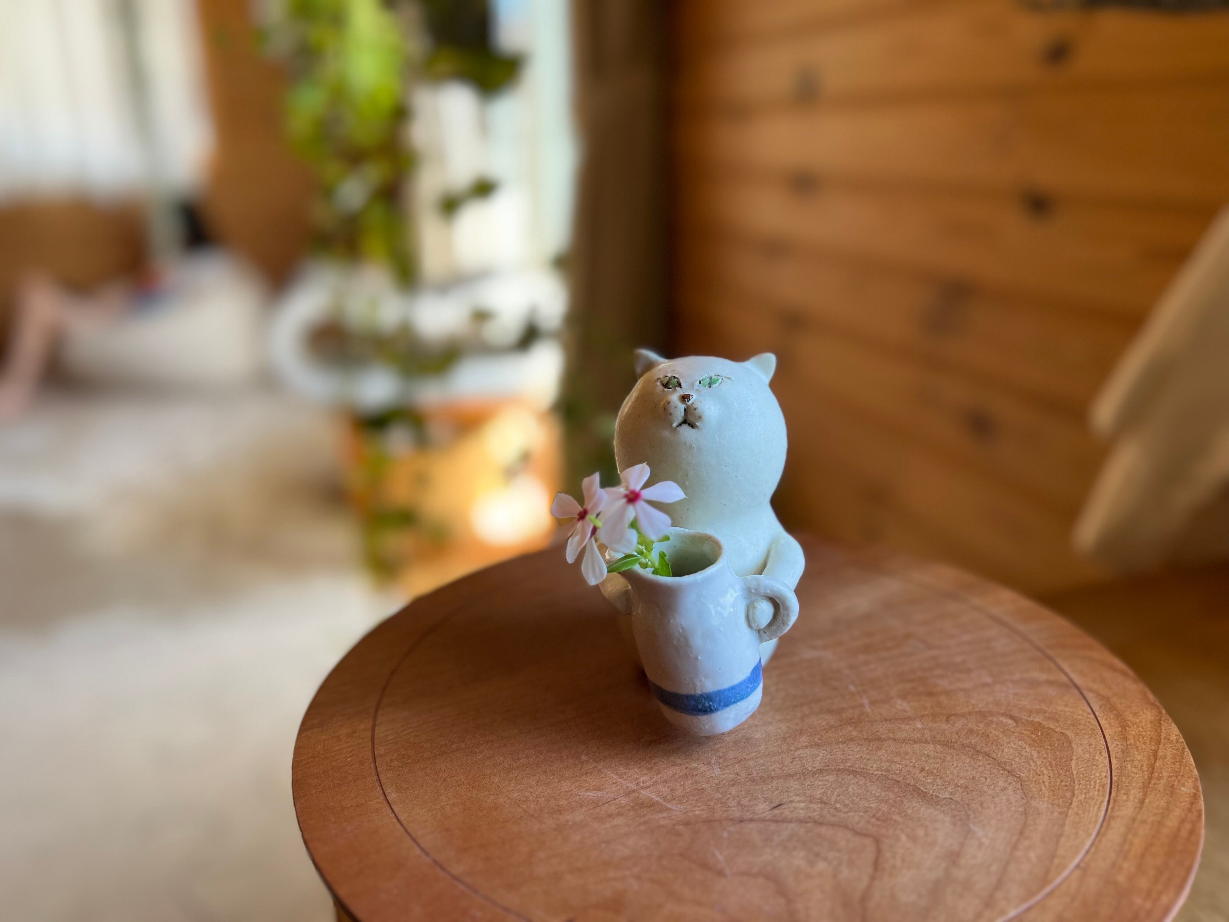 白猫さんがピッチャーを持っている一輪挿しです。猫好きの方や花を飾るのが好きな方にぴったりのアイテムです。