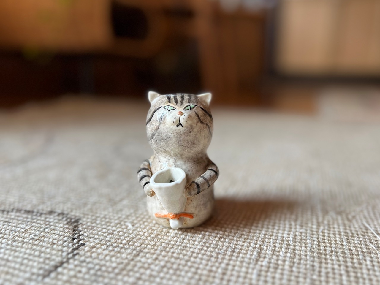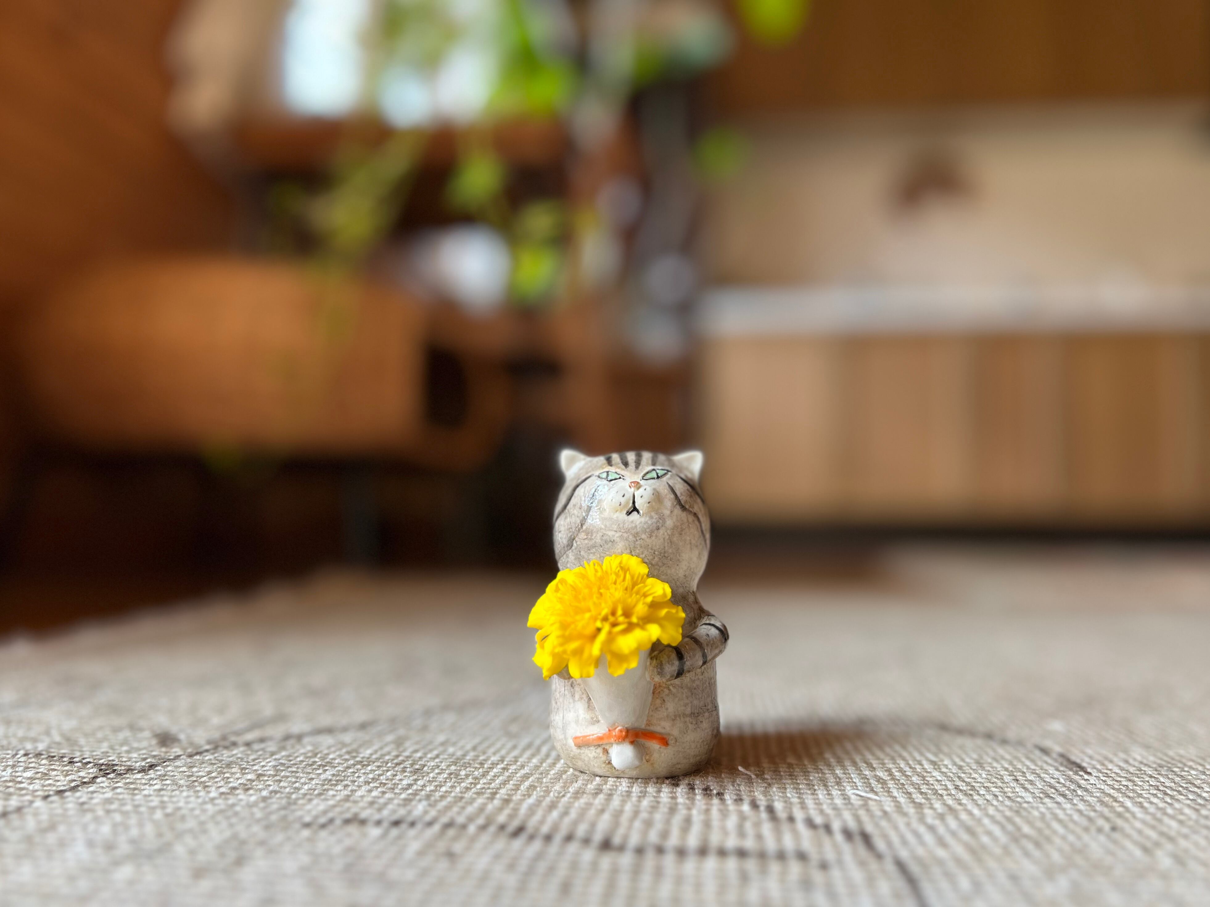 キジトラさんが花束を持った一輪挿しです。猫好きの方や花を飾るのが好きな方にぴったりのアイテムです。