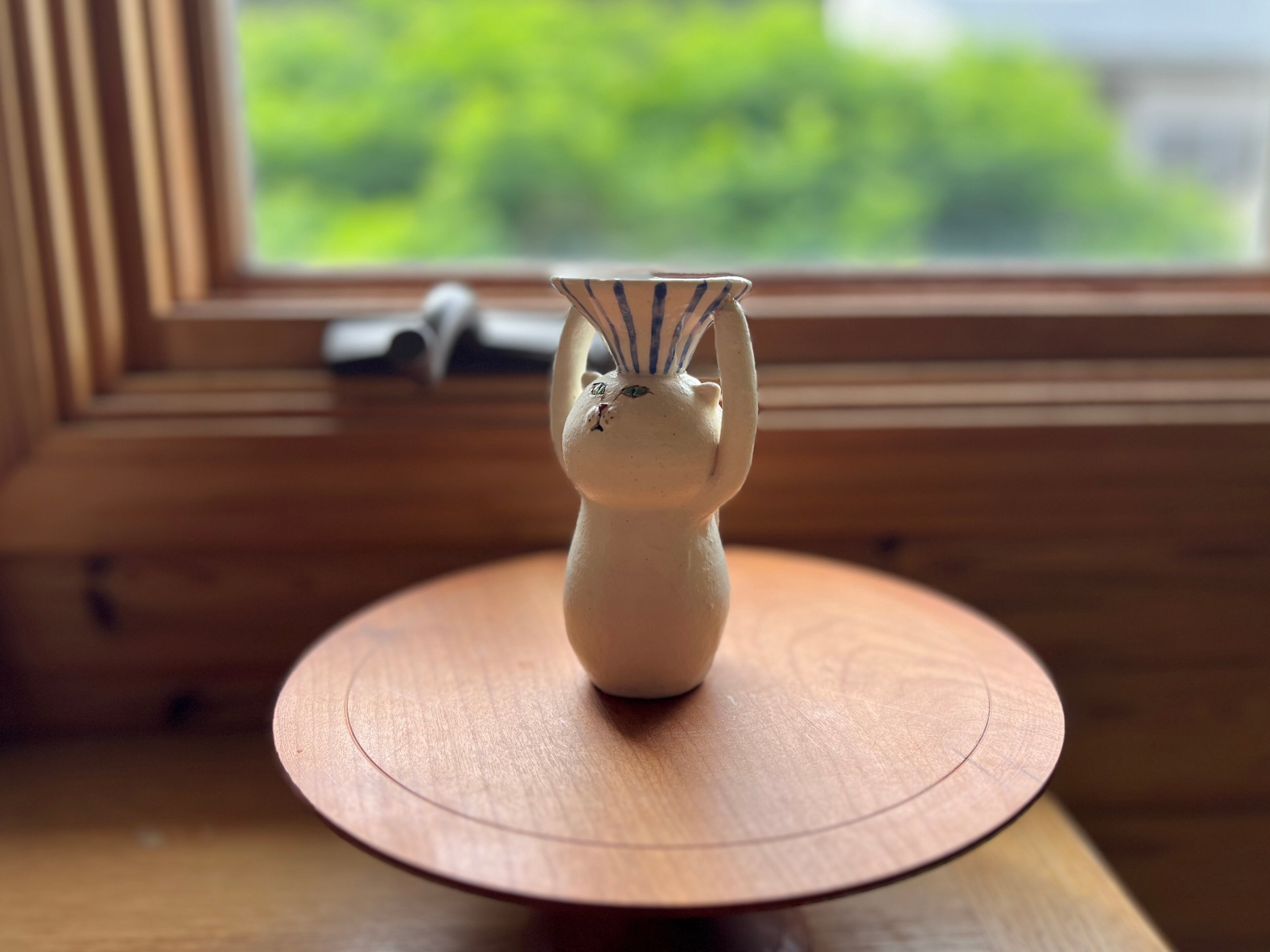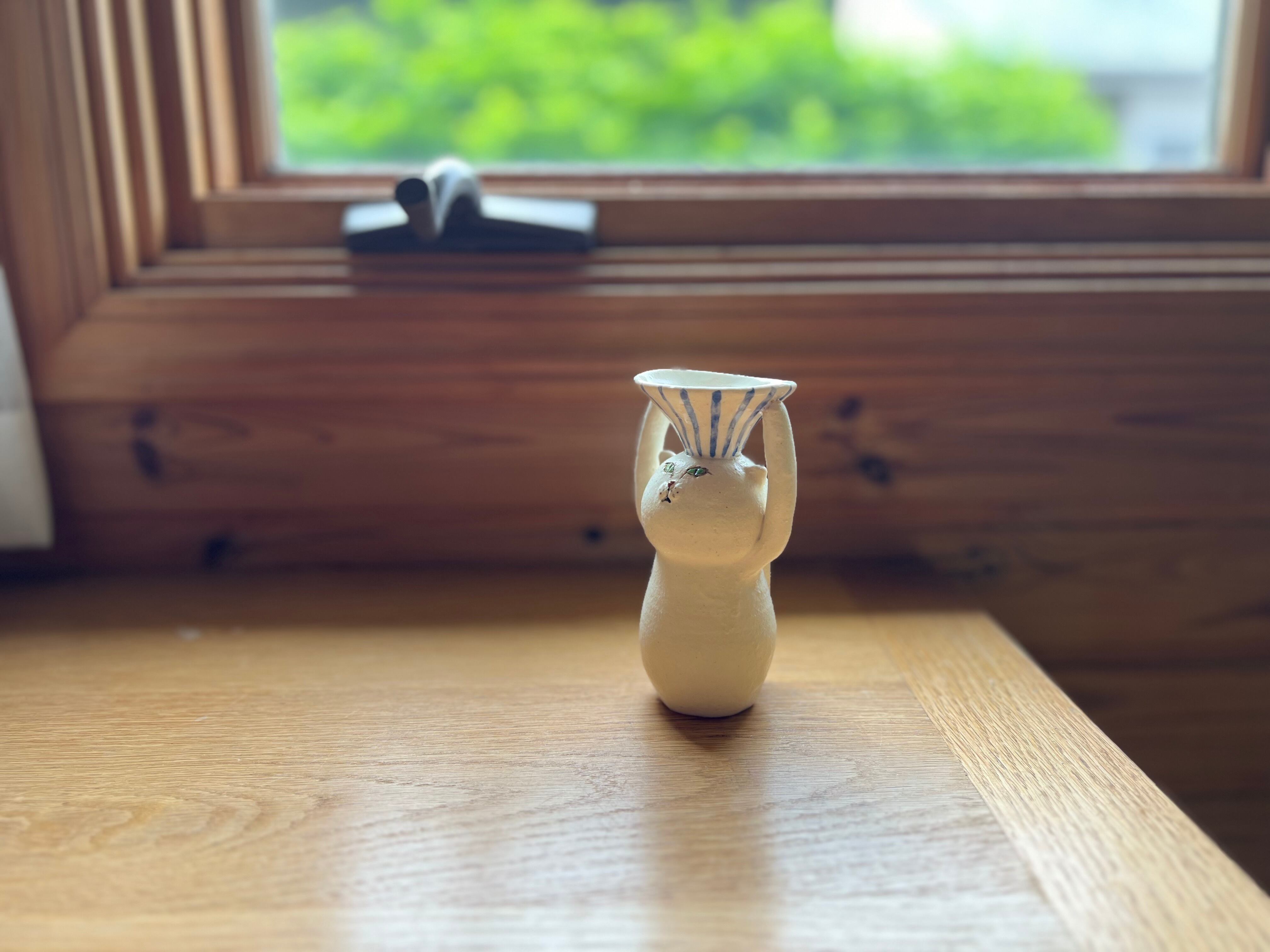 白猫さんが頭に鉢を乗せた一輪挿しです。猫好きの方や花を飾るのが好きな方にぴったりのアイテムです。