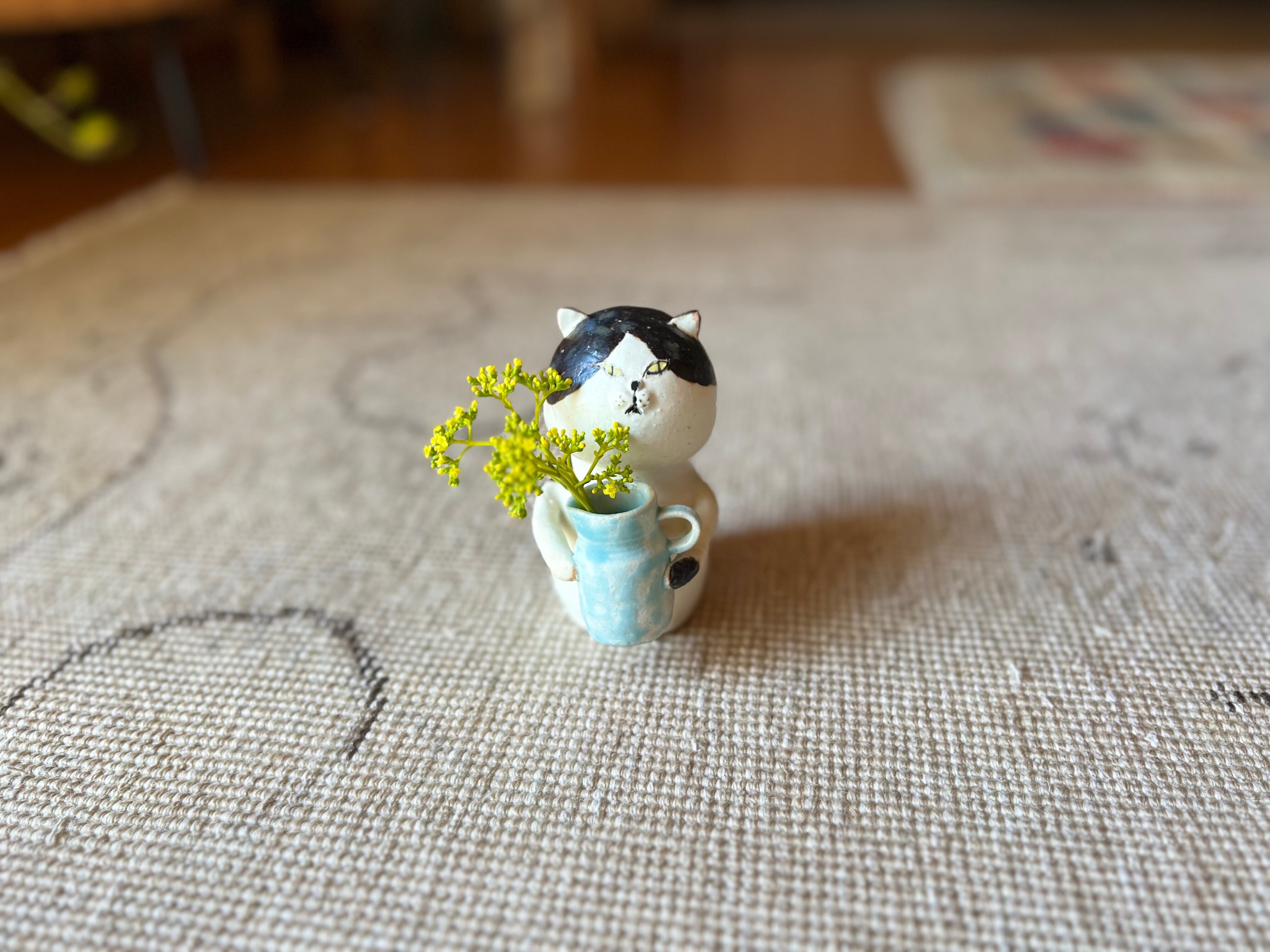 ハチワレ猫さんがピッチャーを持った一輪挿しです。猫好きの方や花を飾るのが好きな方にぴったりのアイテムです。