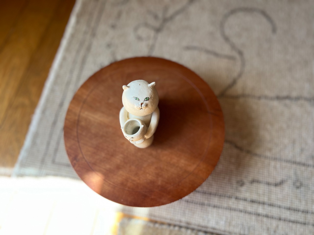 白猫さんが白猫さんを持った一輪挿しです。猫好きの方や花を飾るのが好きな方にぴったりのアイテムです。