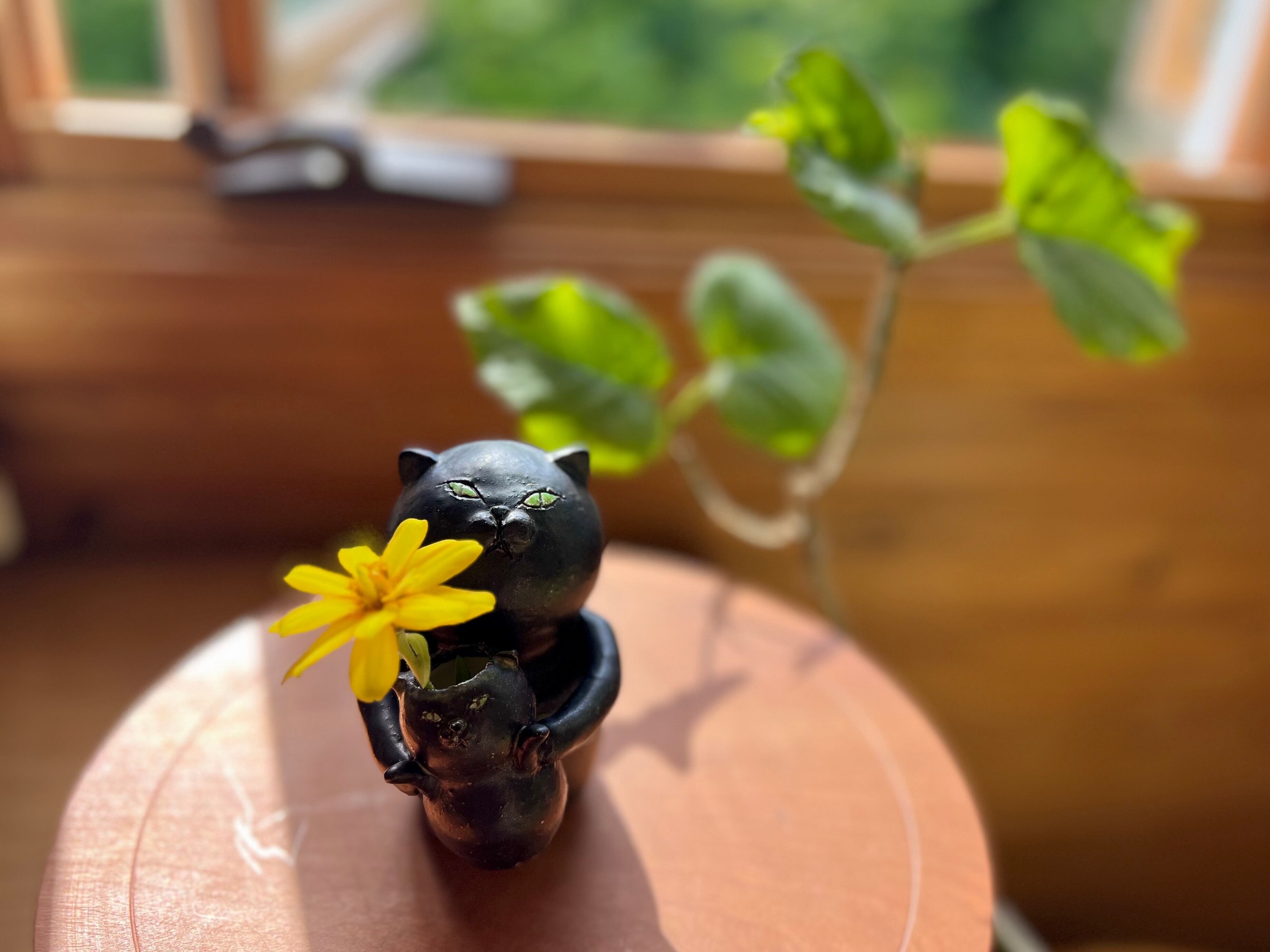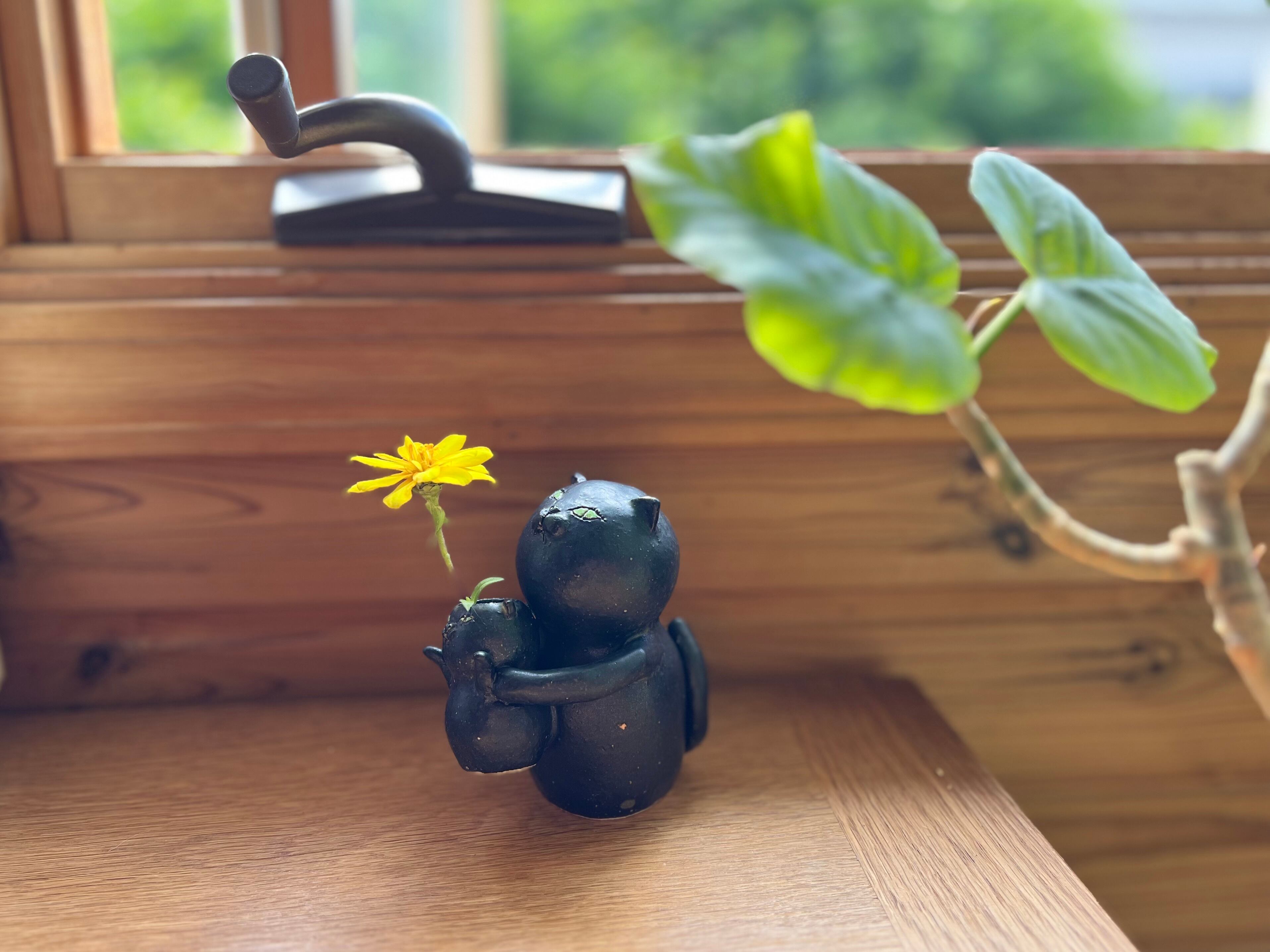 黒猫さんが小さい黒猫さんを抱っこした一輪挿しです。猫好きの方や花を飾るのが好きな方にぴったりのアイテムです。