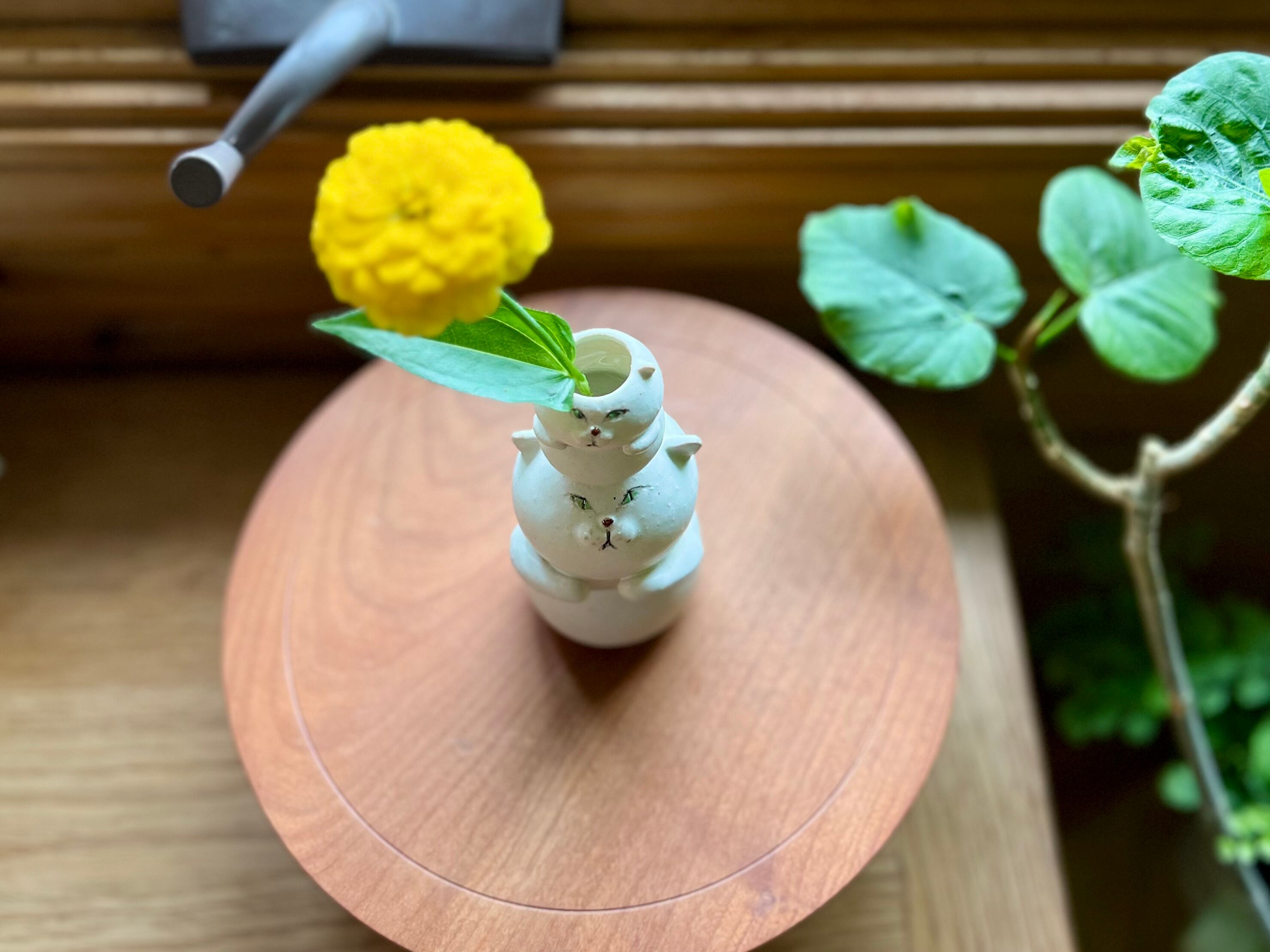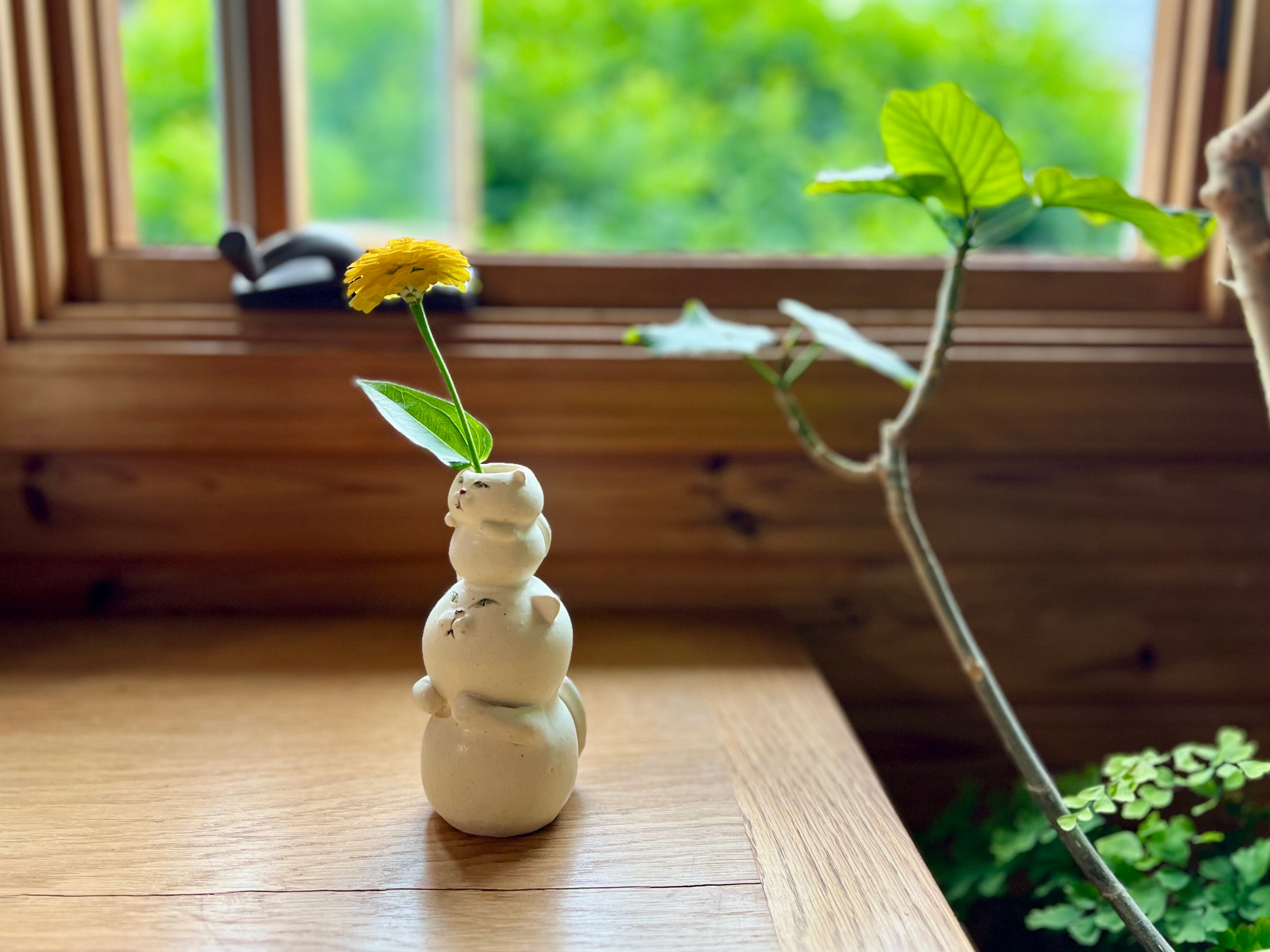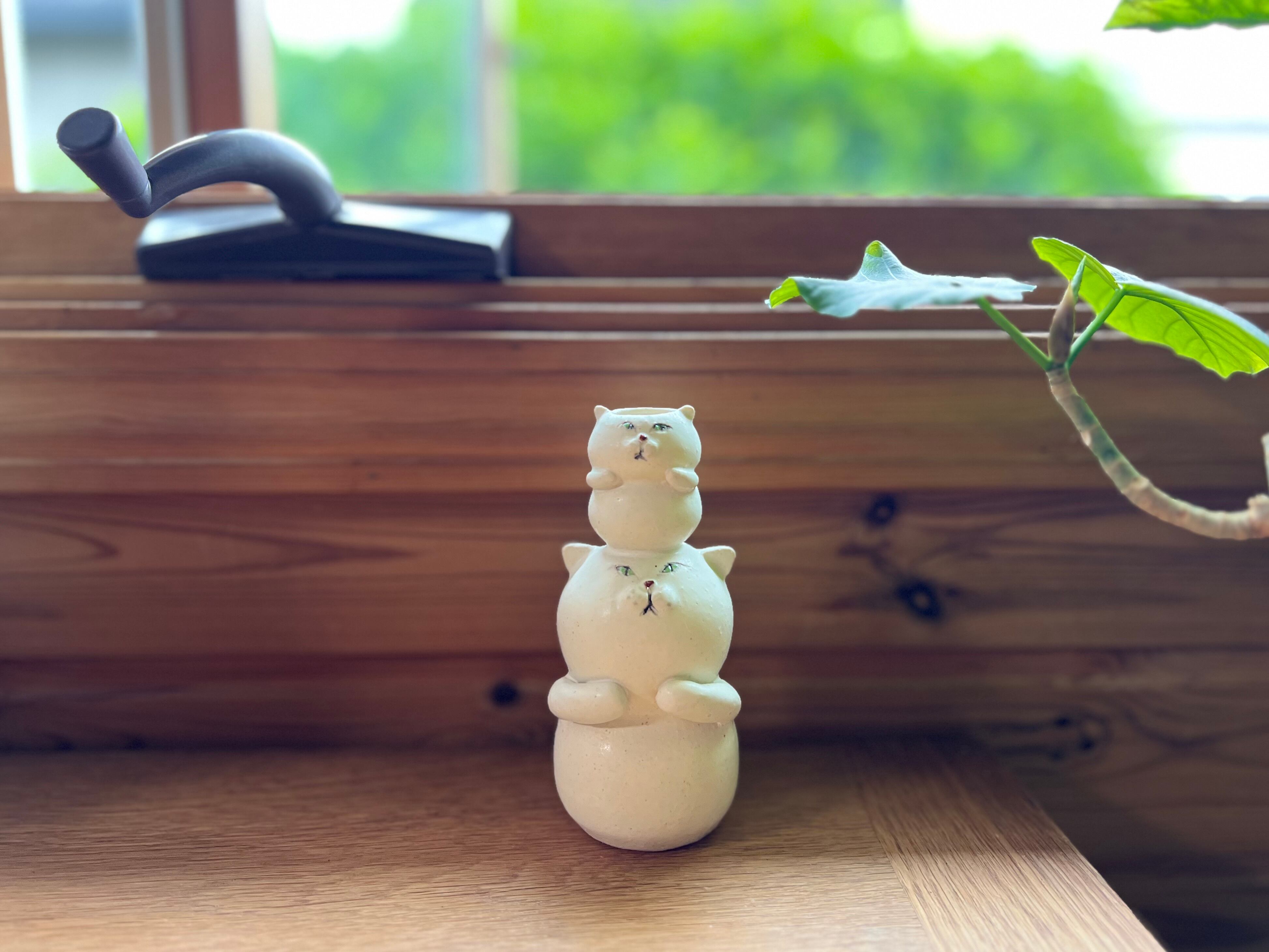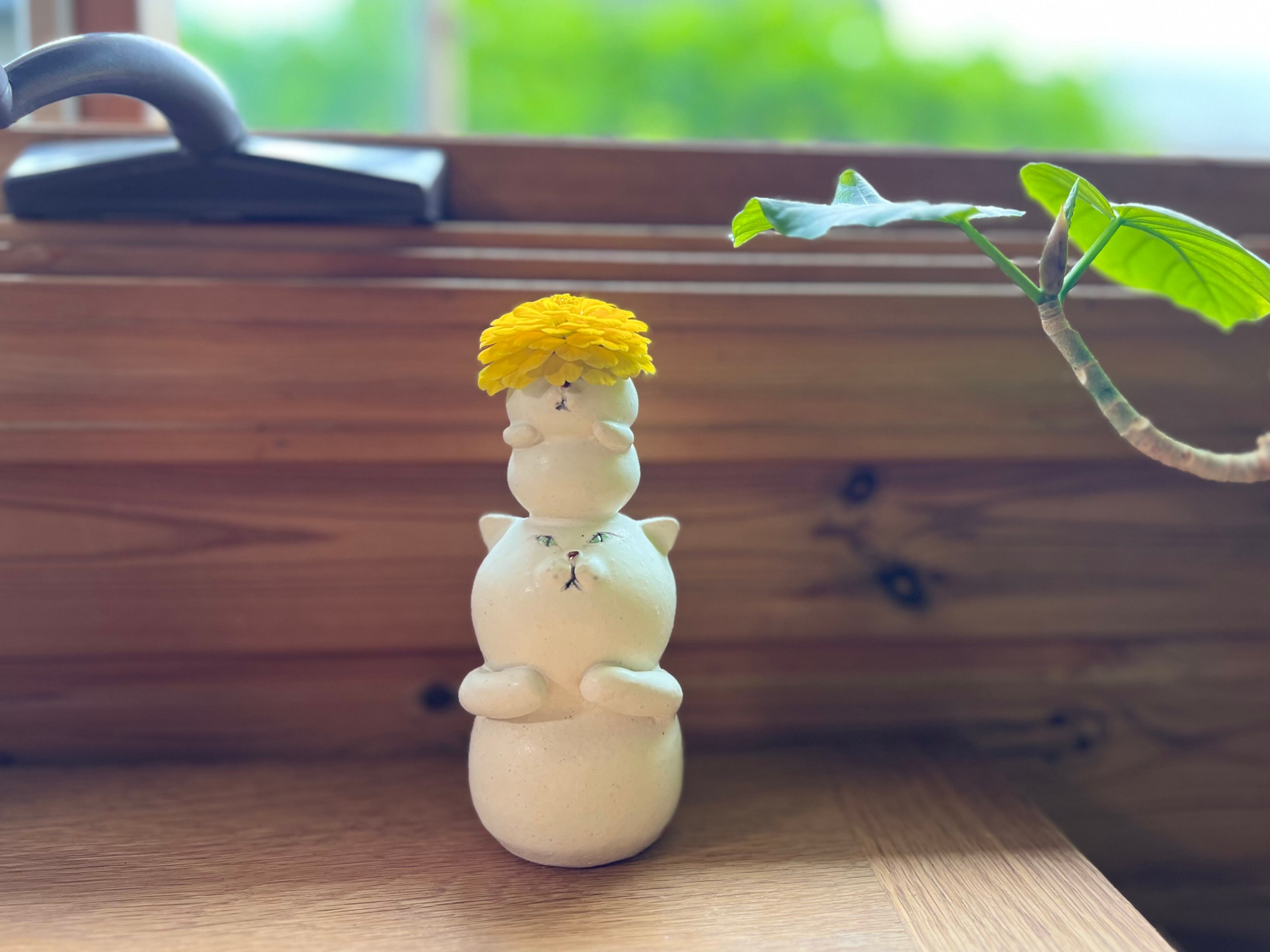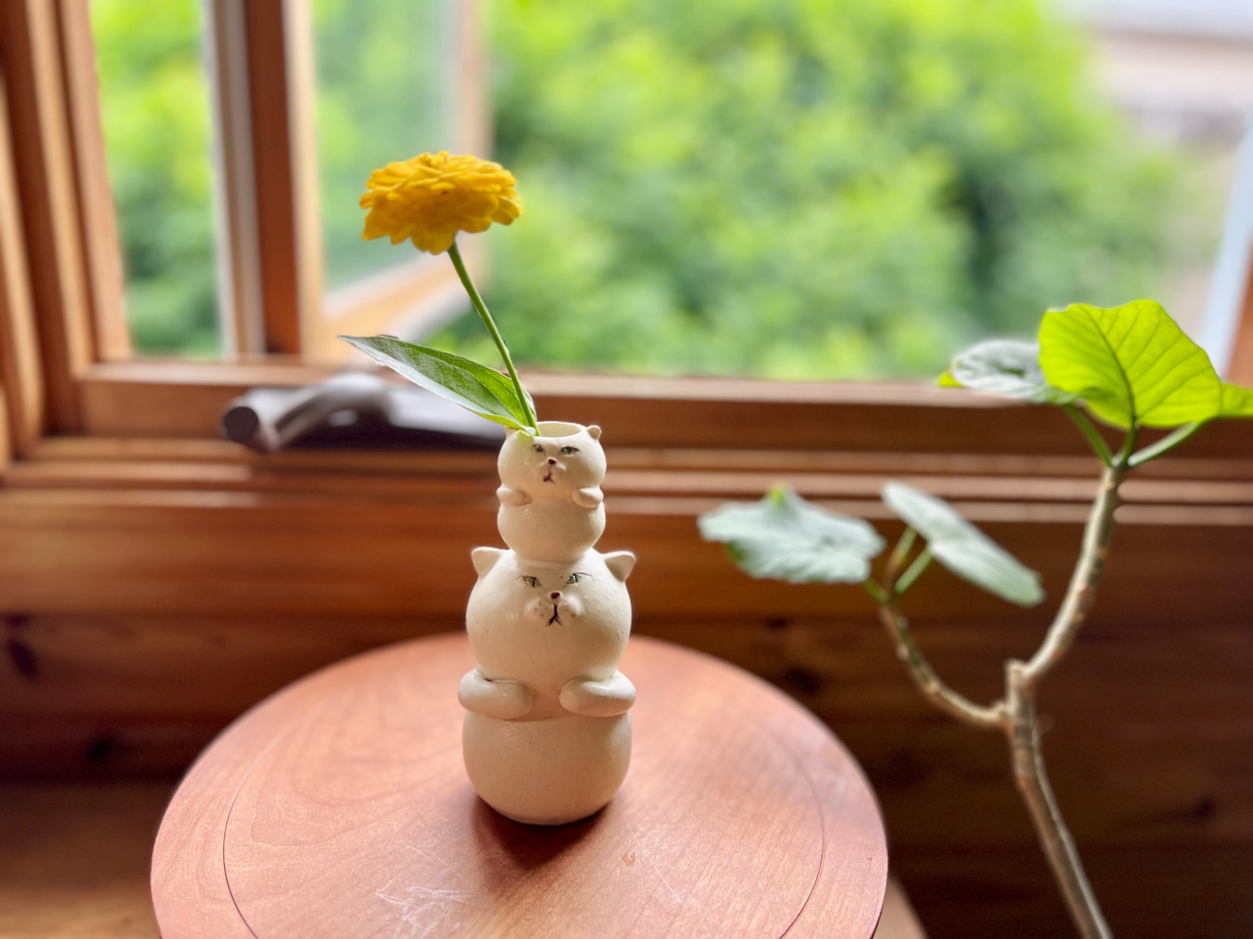 白猫さんが小さい猫さんを頭に乗せた一輪挿しです。猫好きの方や花を飾るのが好きな方にぴったりのアイテムです。