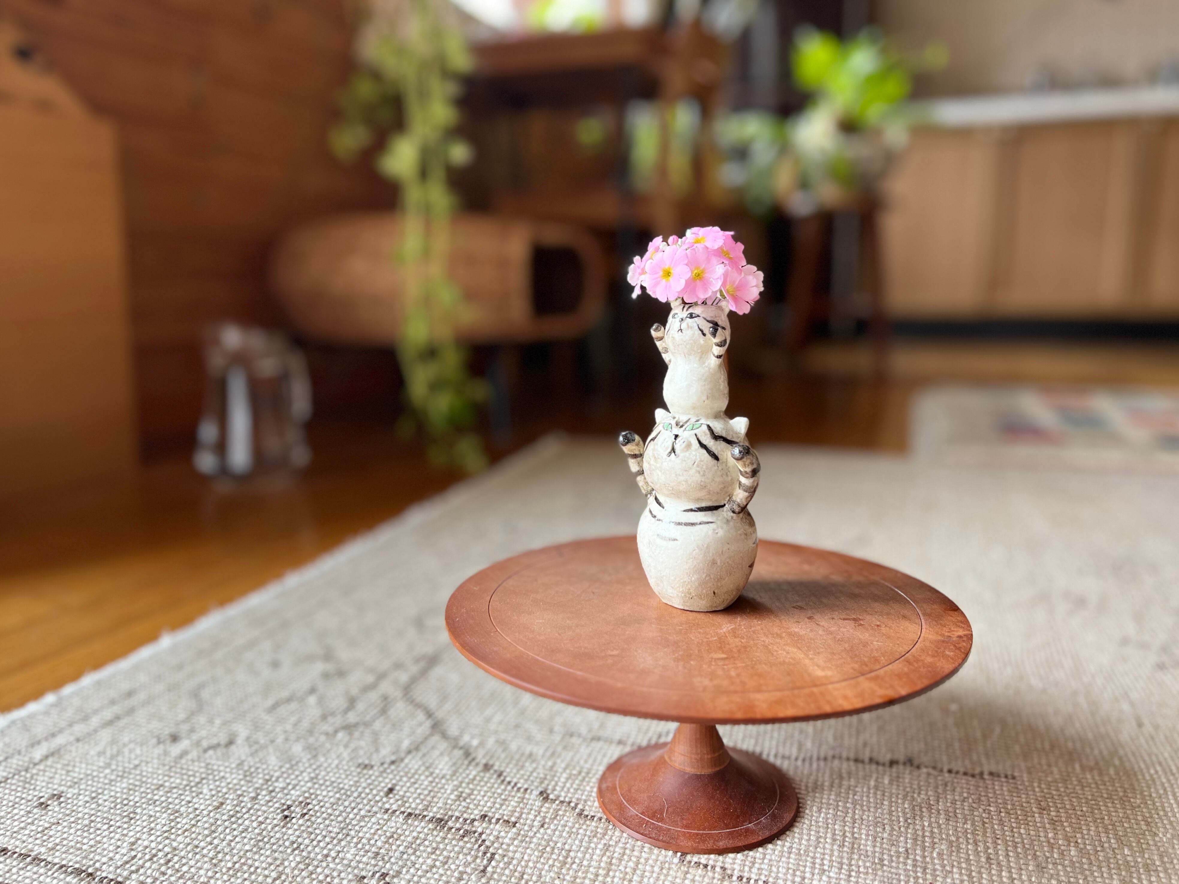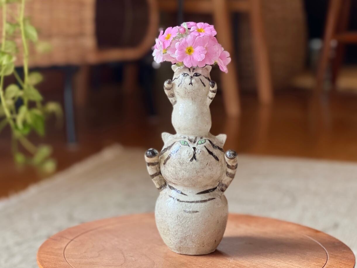 白猫さんが小さい猫さんを頭に乗せた一輪挿しです。猫好きの方や花を飾るのが好きな方にぴったりのアイテムです。