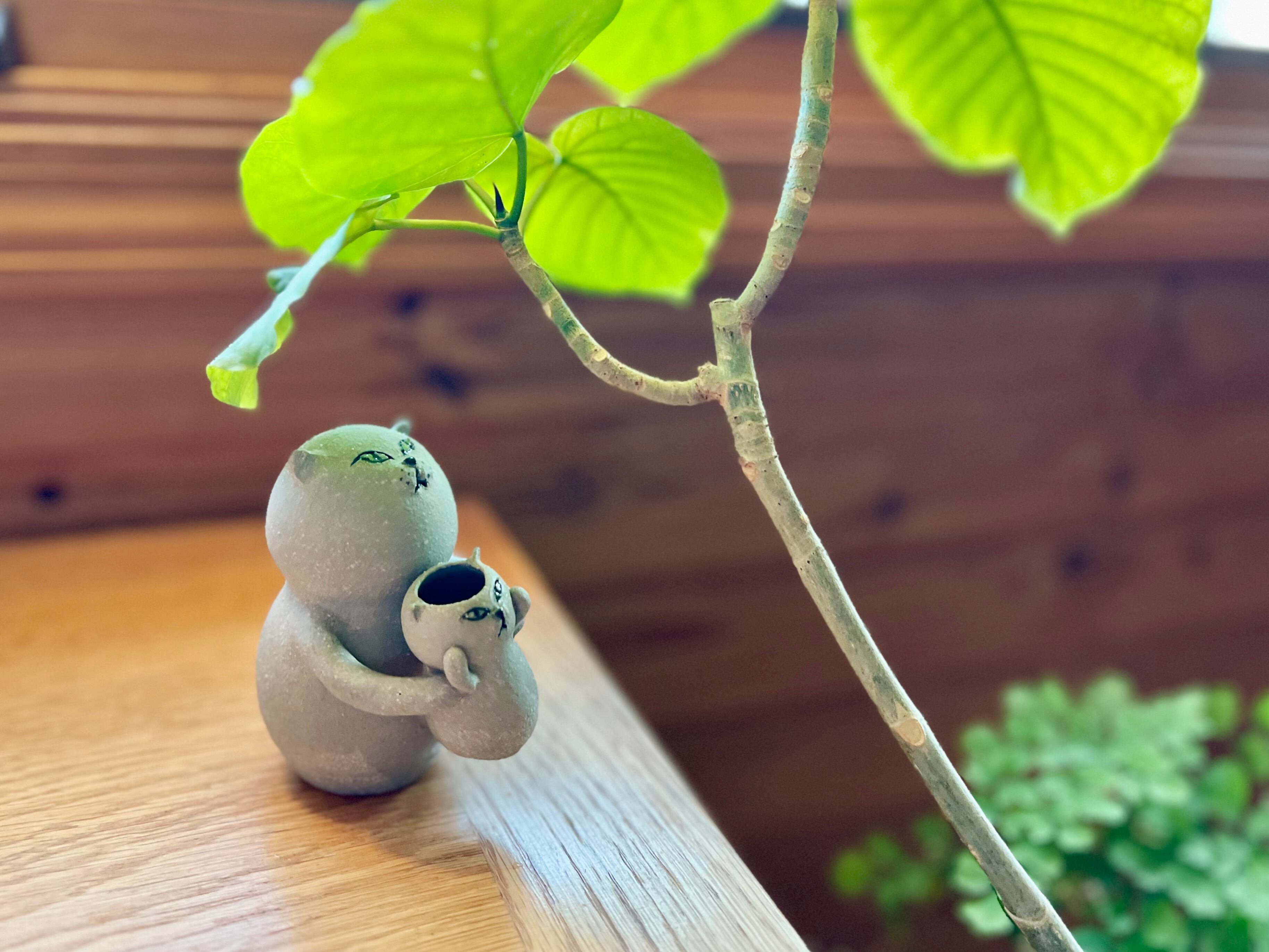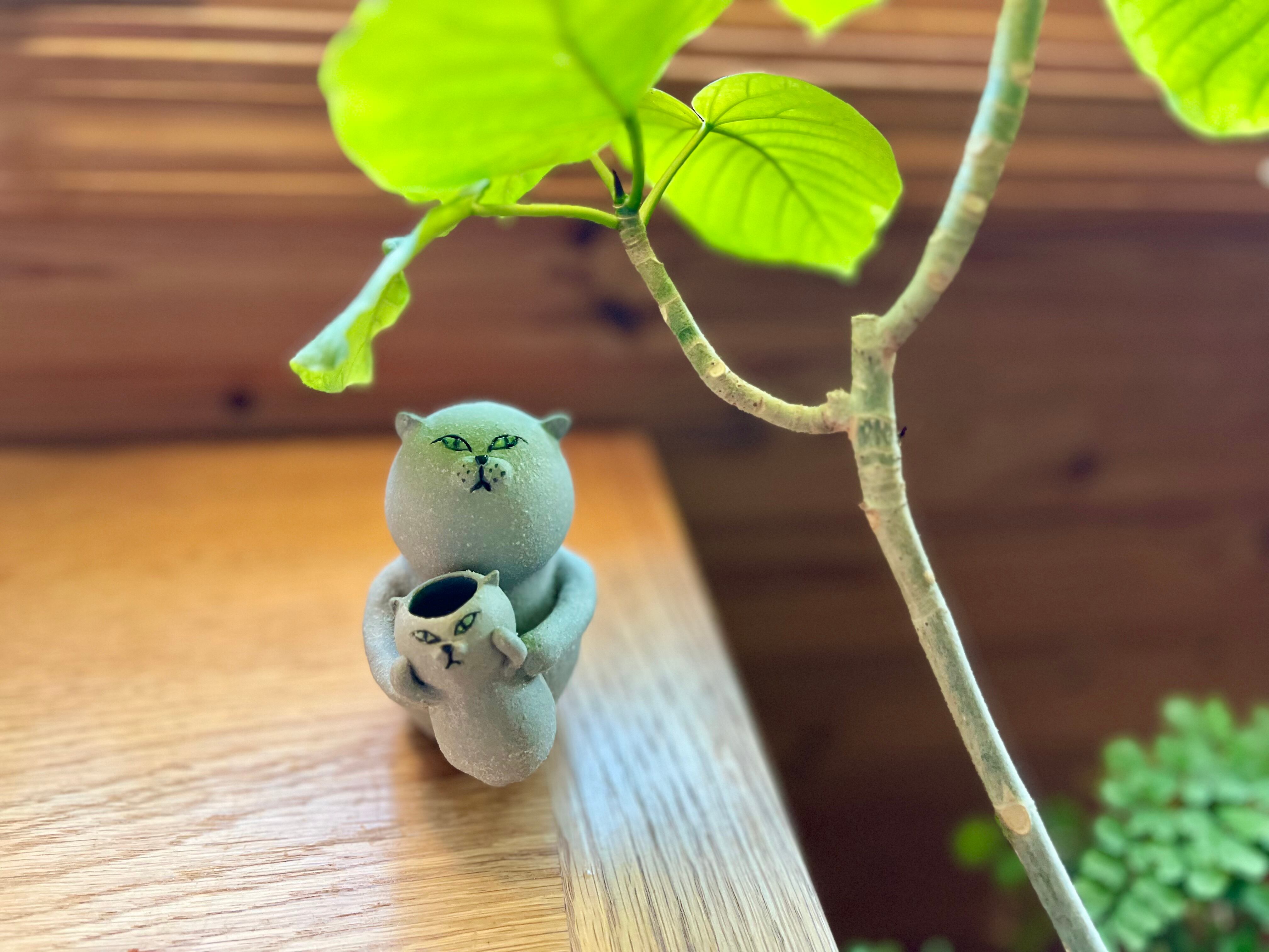 グレー猫さんが小さい猫さんを抱っこした一輪挿しです。猫好きの方や花を飾るのが好きな方にぴったりのアイテムです。