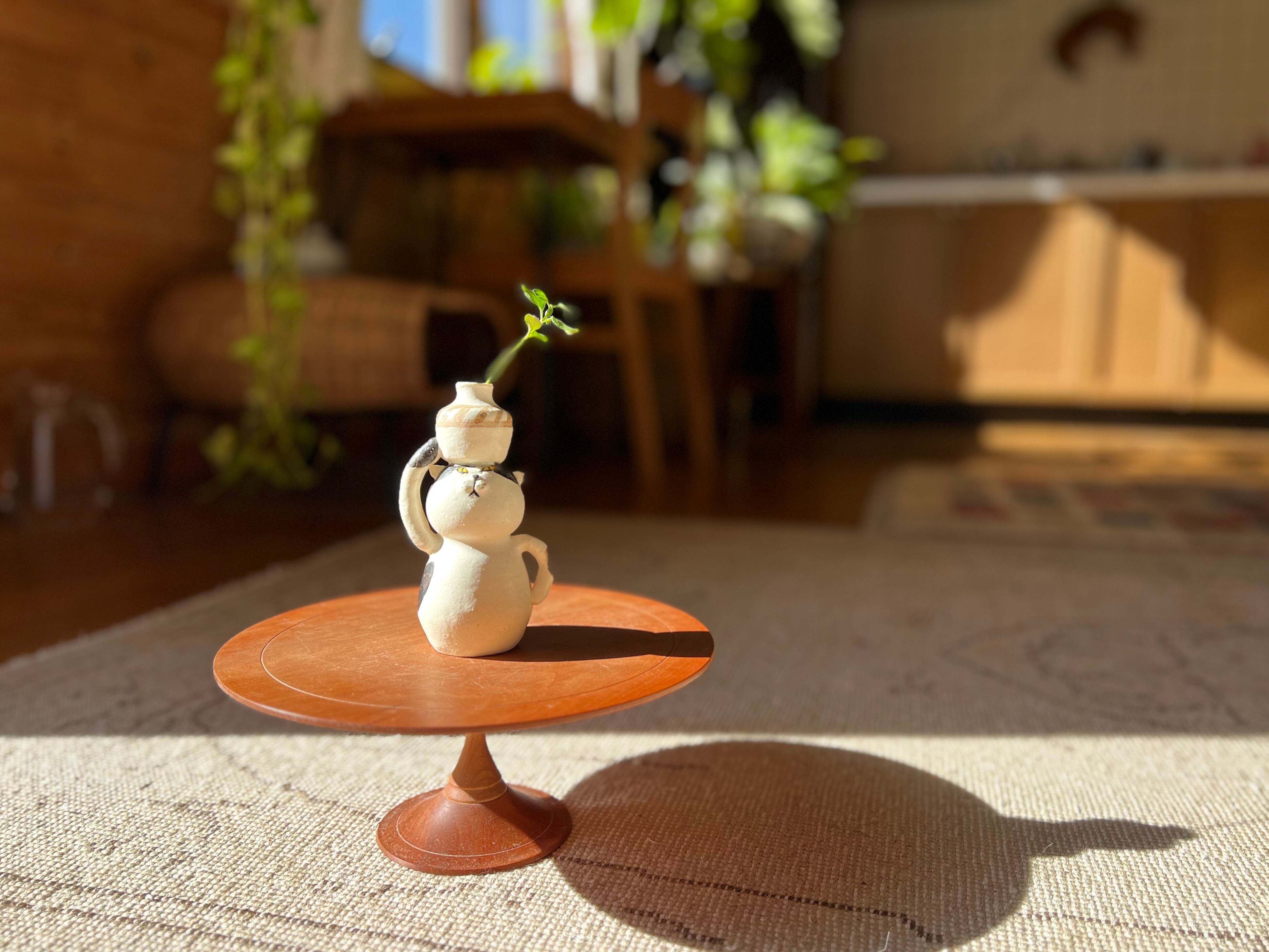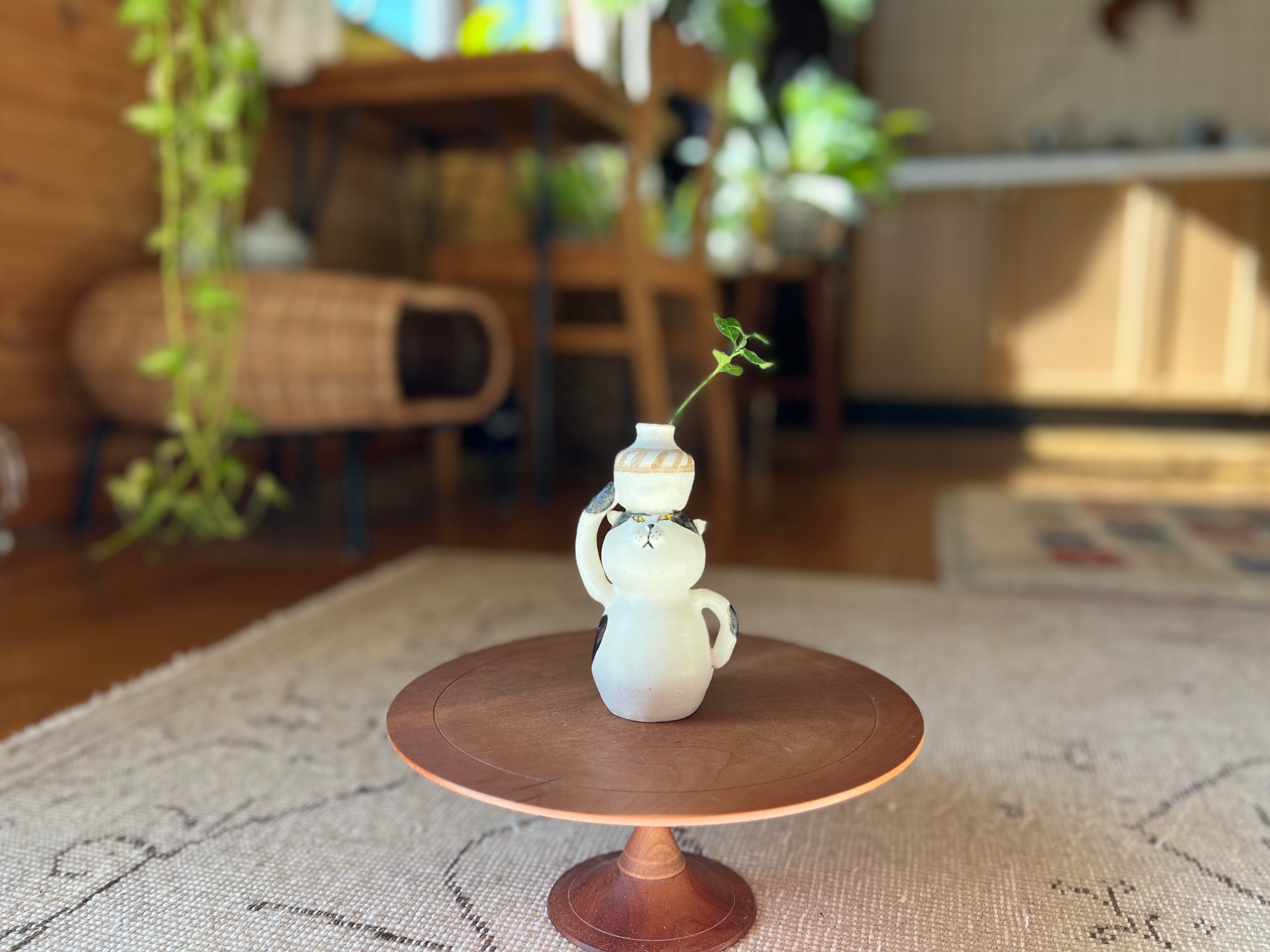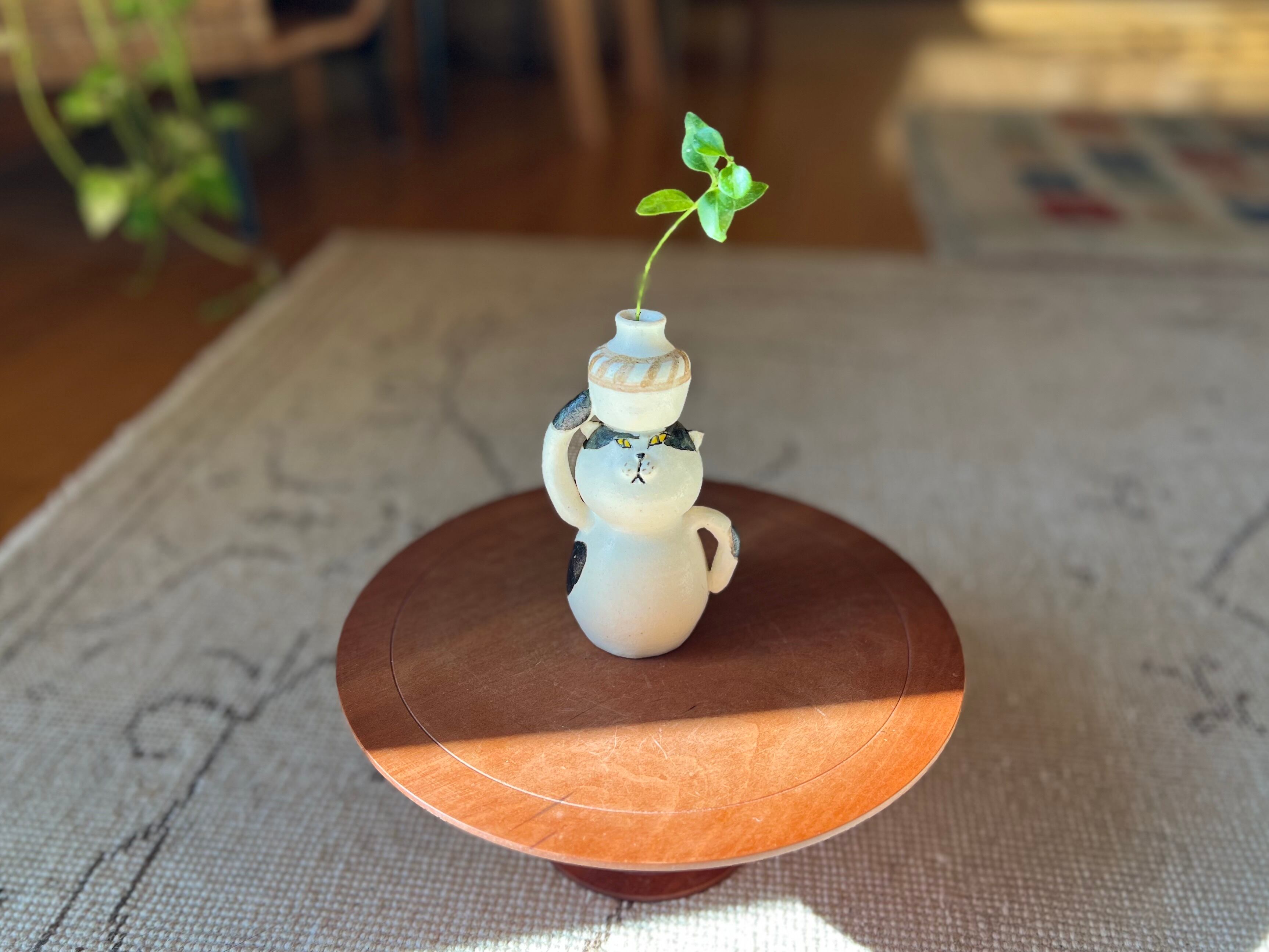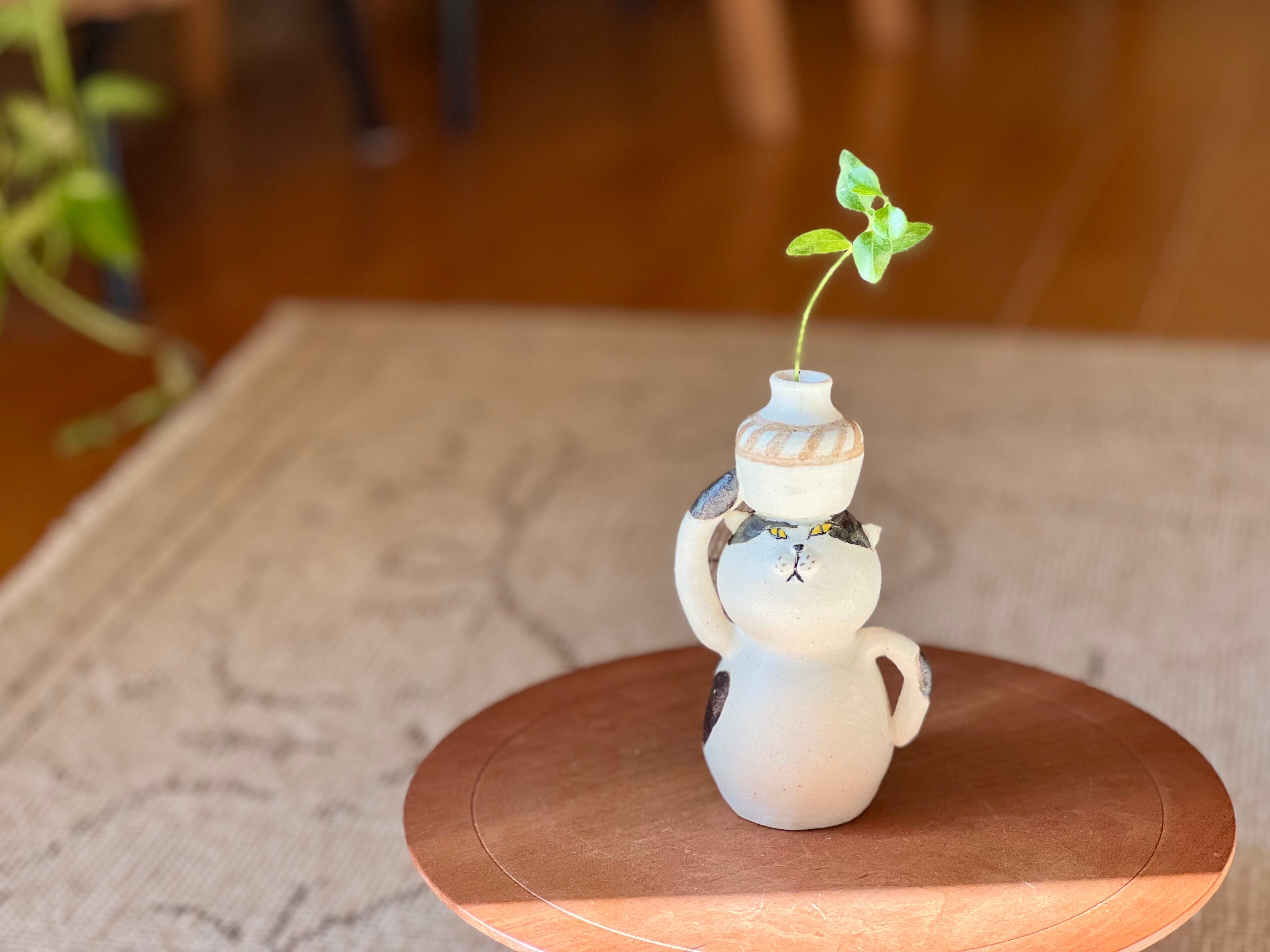 茶トラ猫さんが頭に壺を乗せた一輪挿しです。猫好きの方や花を飾るのが好きな方にぴったりのアイテムです。