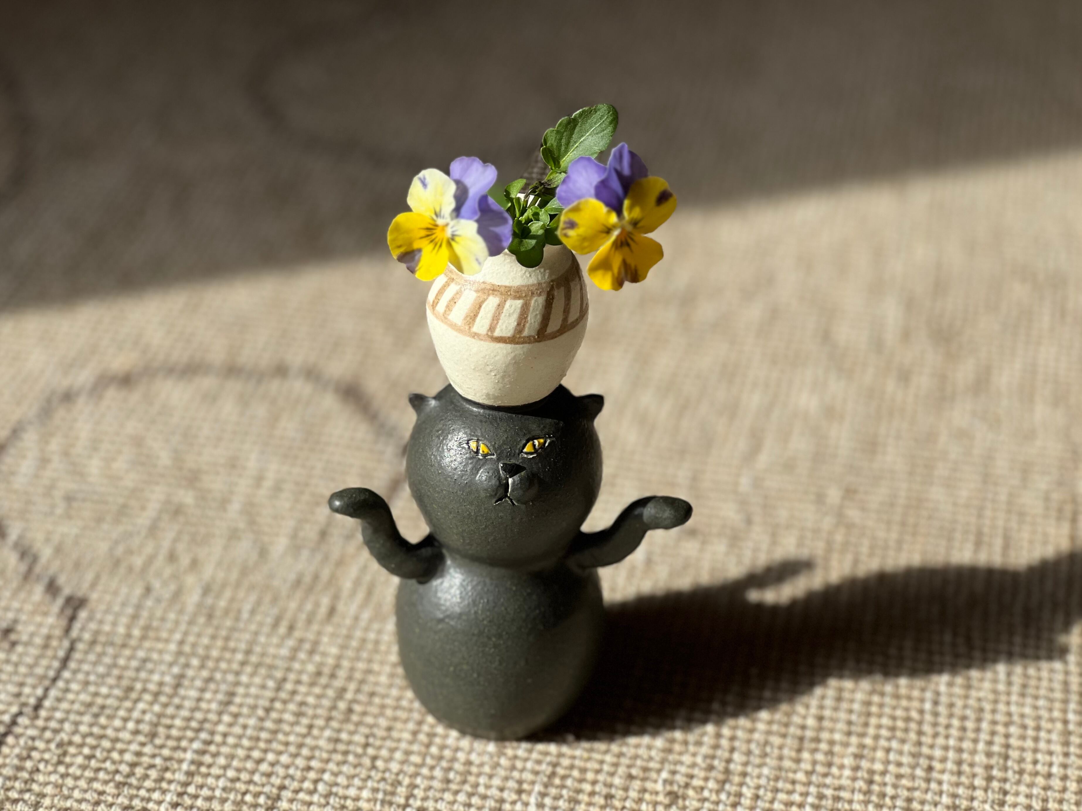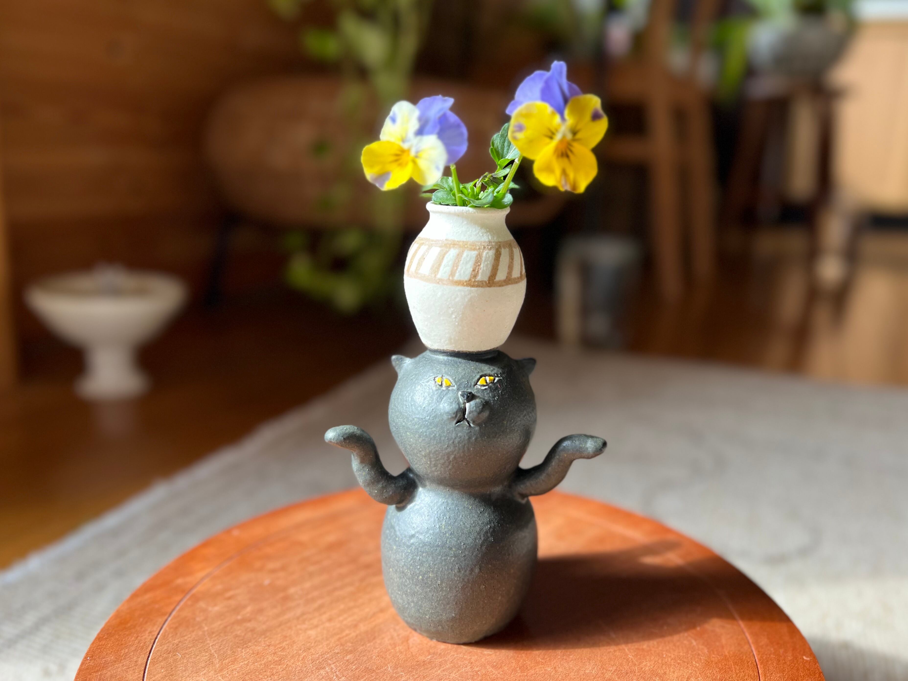 黒猫さんが頭に壺を乗せた一輪挿しです。猫好きの方や花を飾るのが好きな方にぴったりのアイテムです。