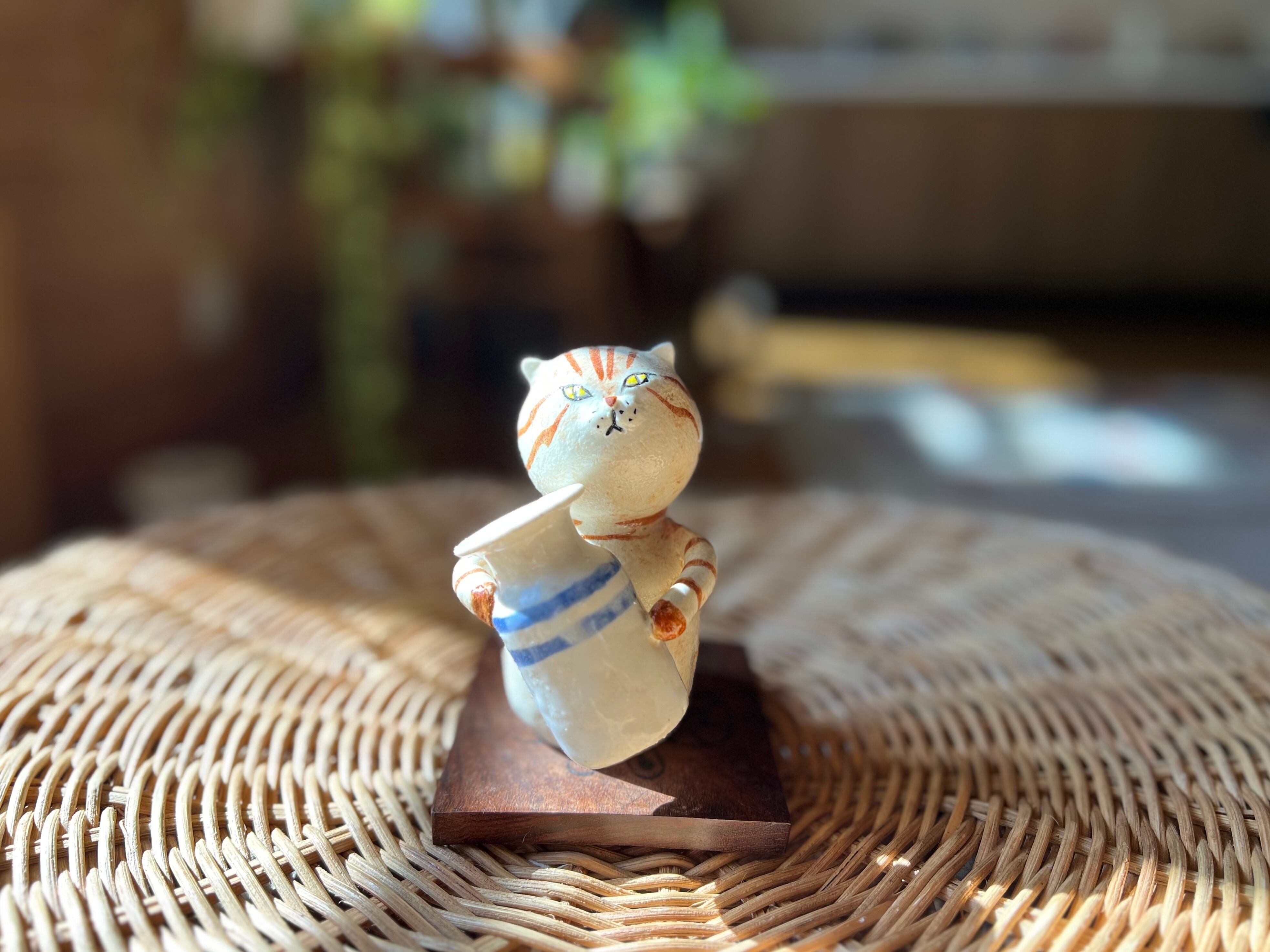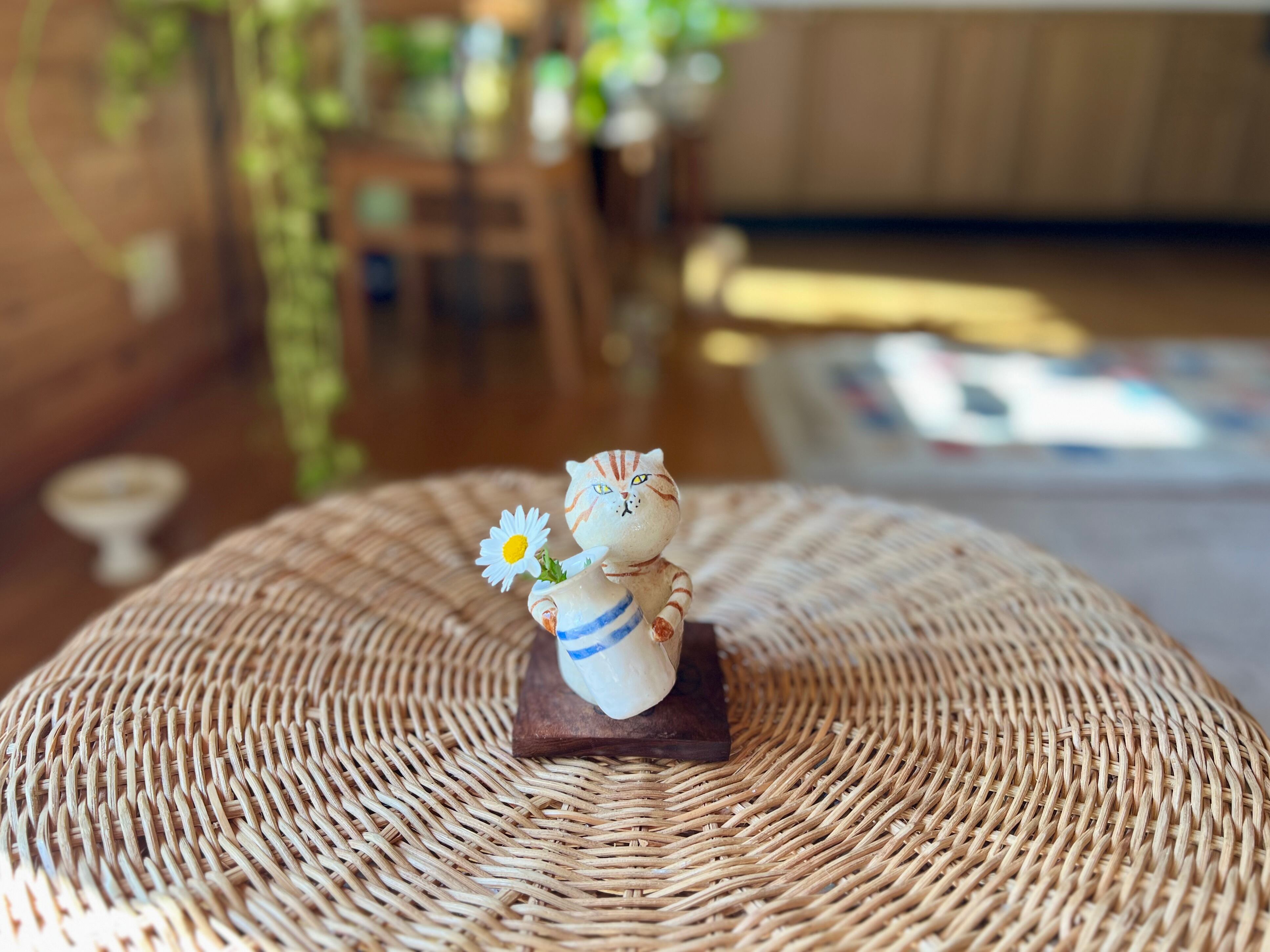 茶トラ猫さんが花瓶を持った一輪挿しです。猫好きの方や花を飾るのが好きな方にぴったりのアイテムです。