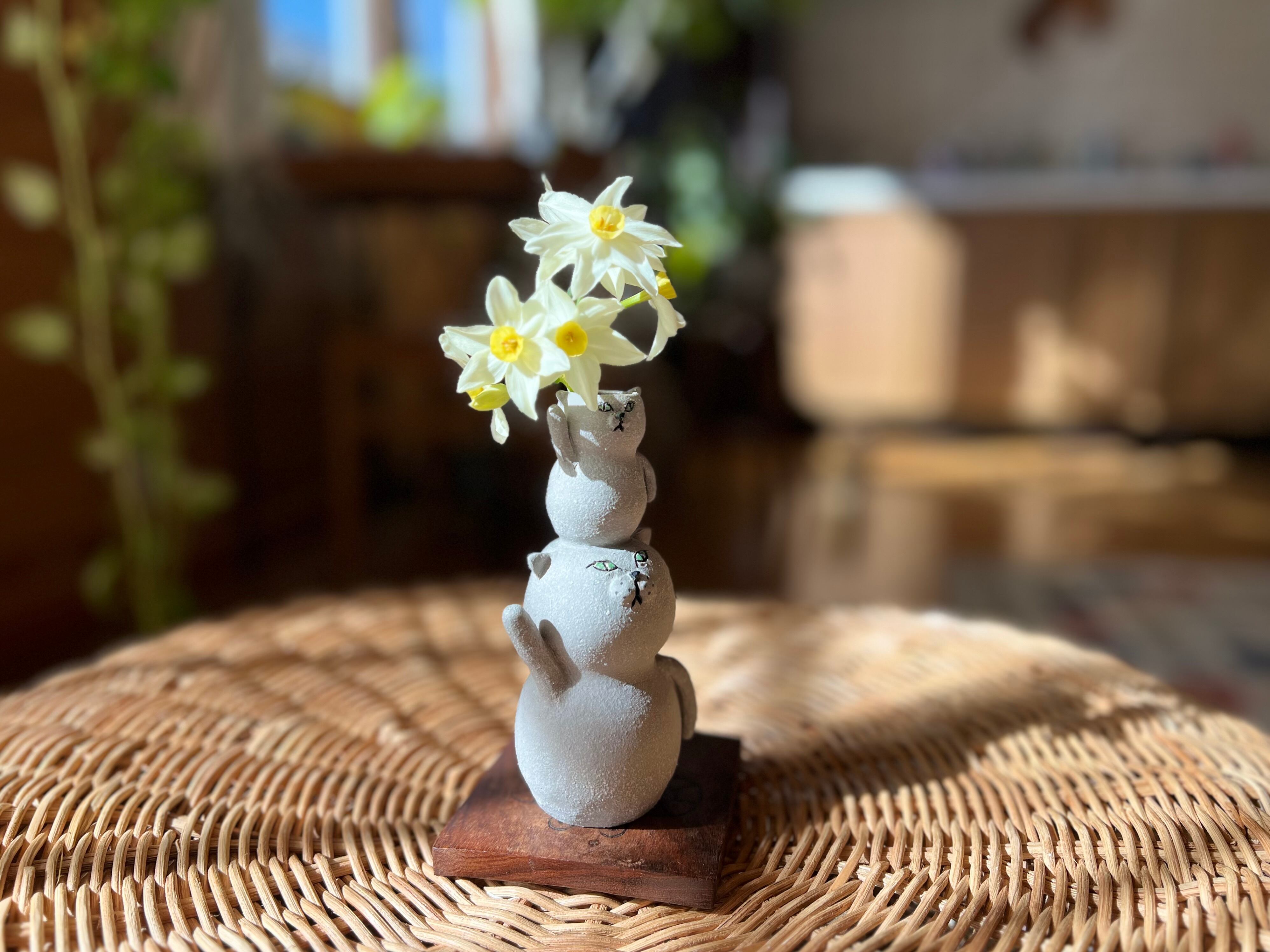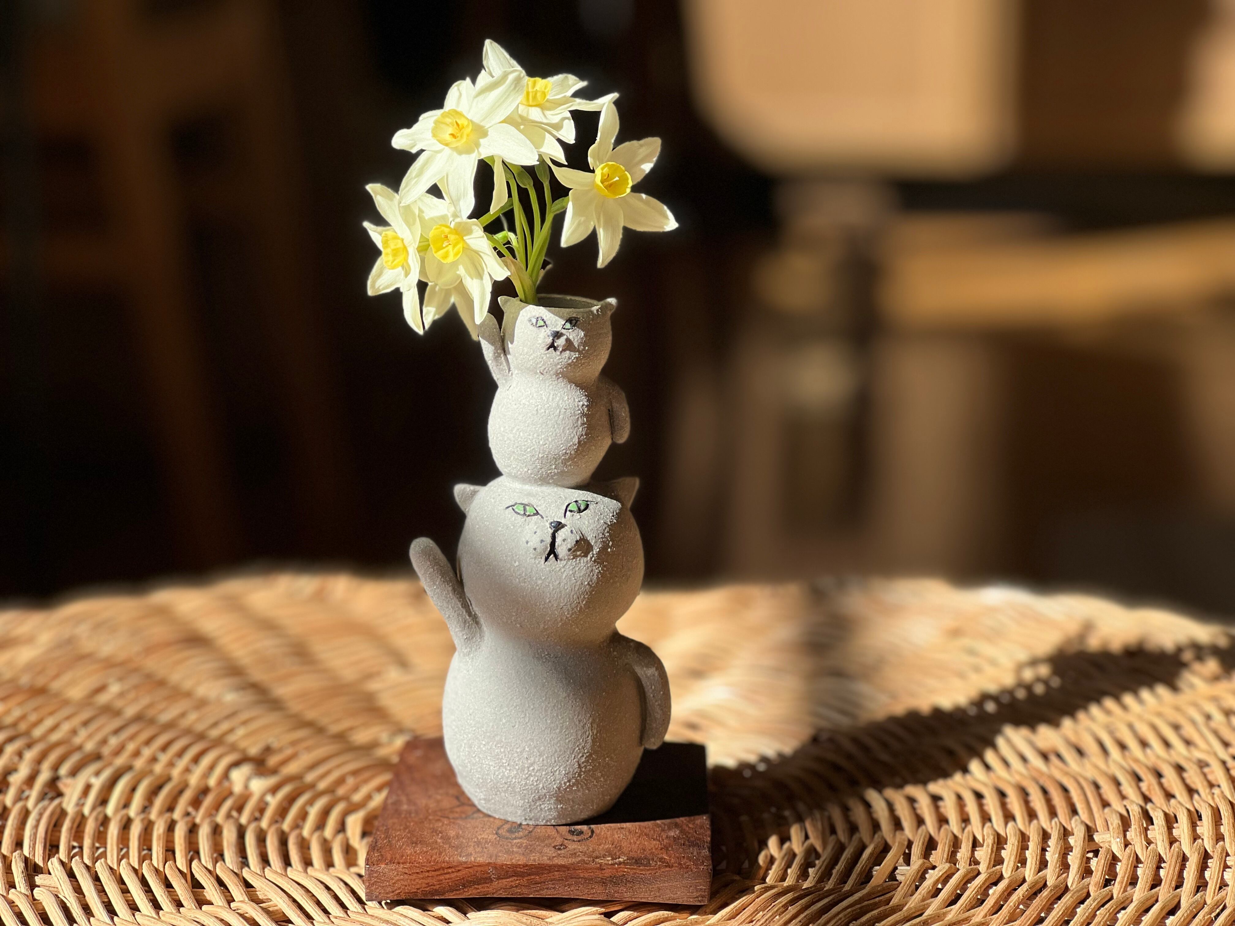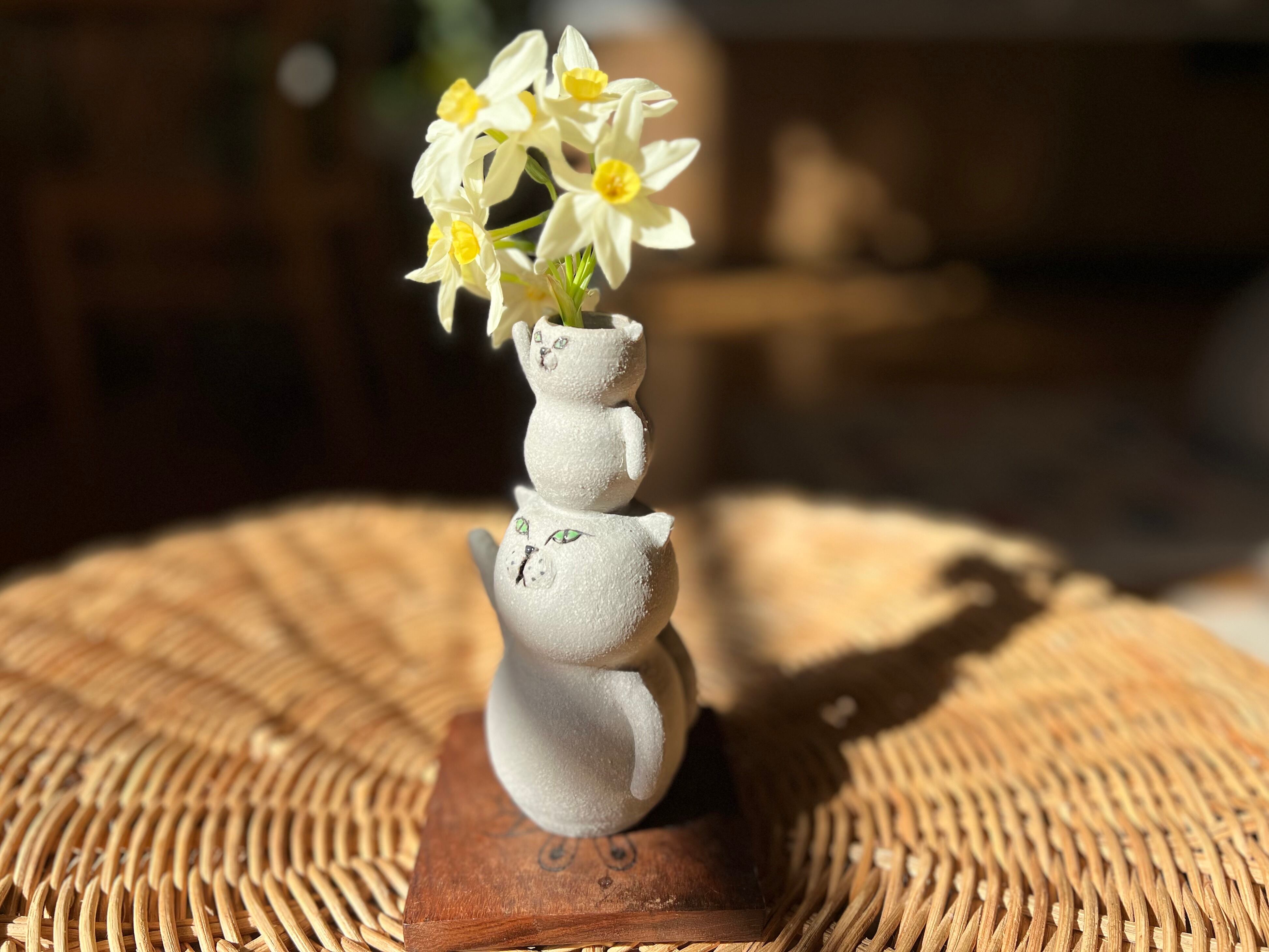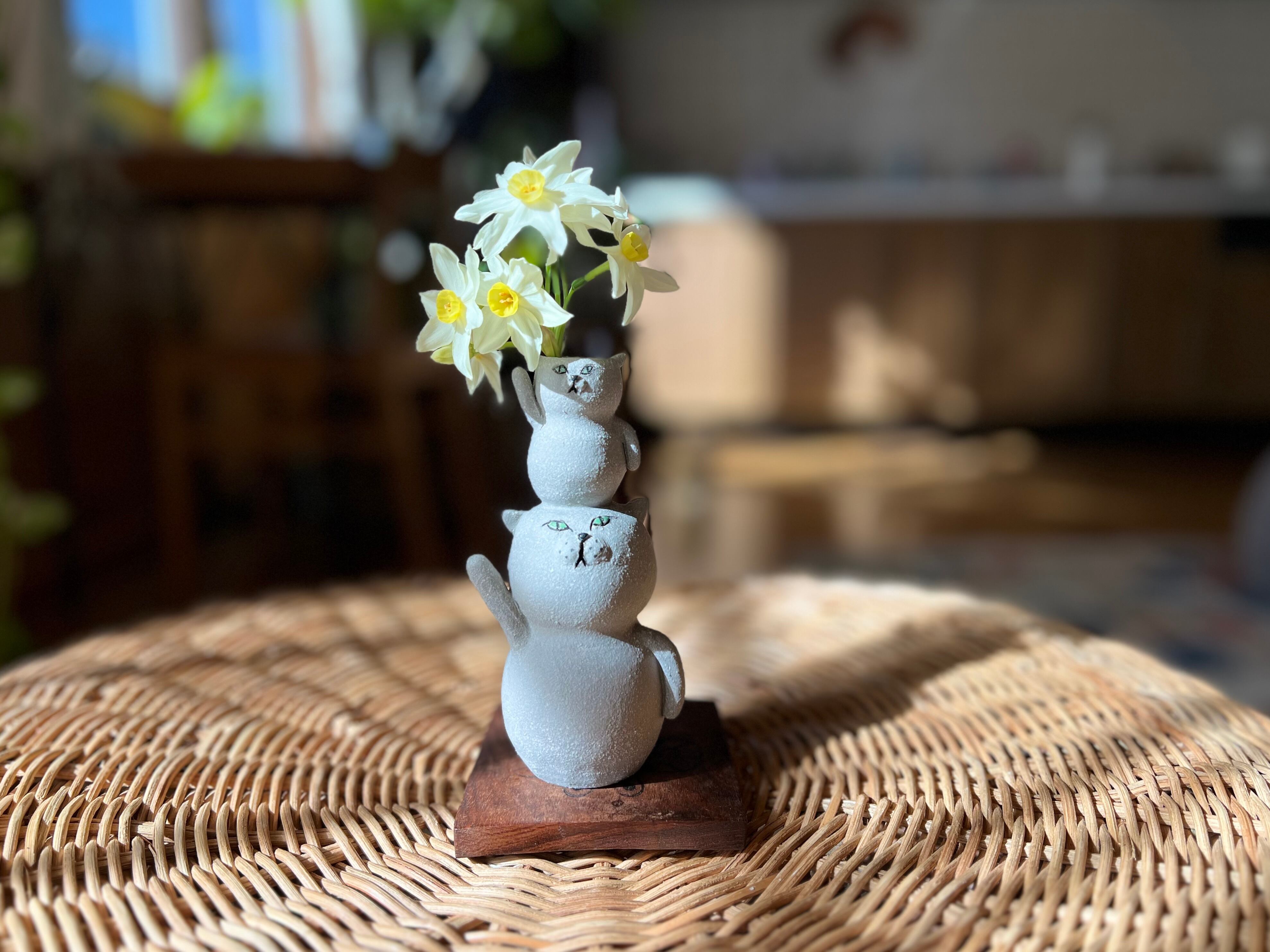 グレー猫さんが小さい猫さんを頭に乗せた一輪挿しです。猫好きの方や花を飾るのが好きな方にぴったりのアイテムです。