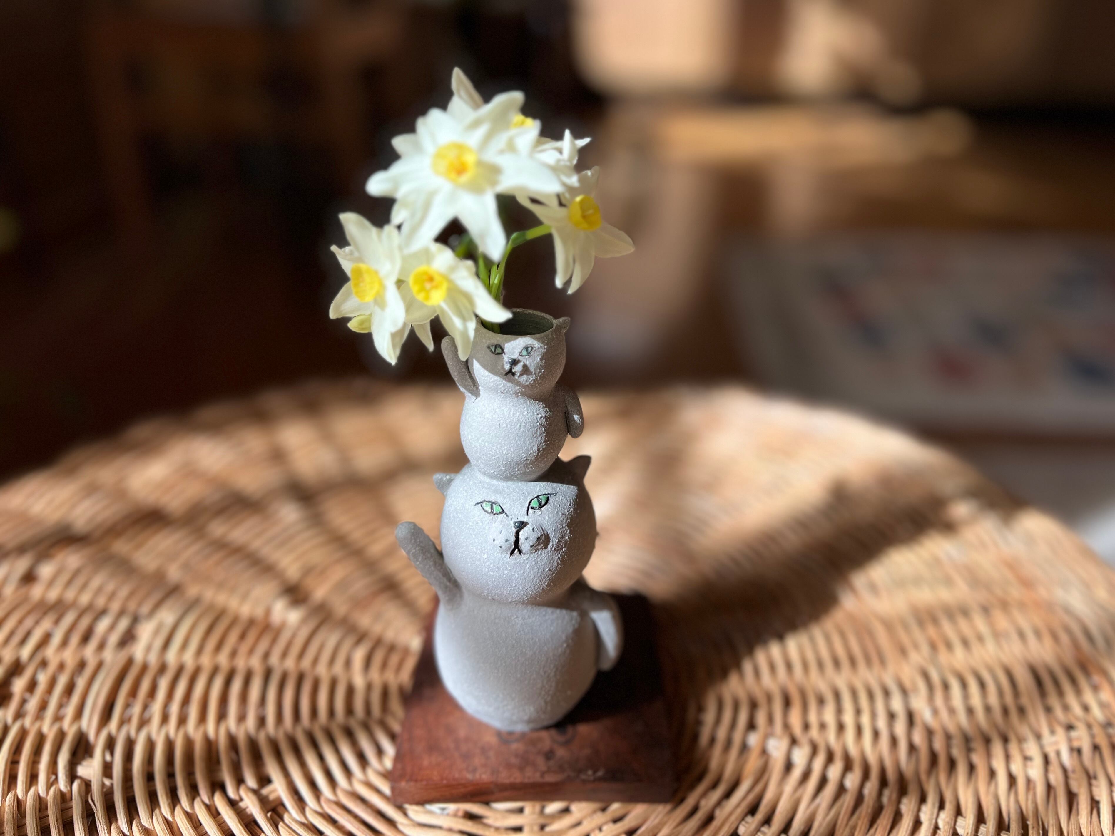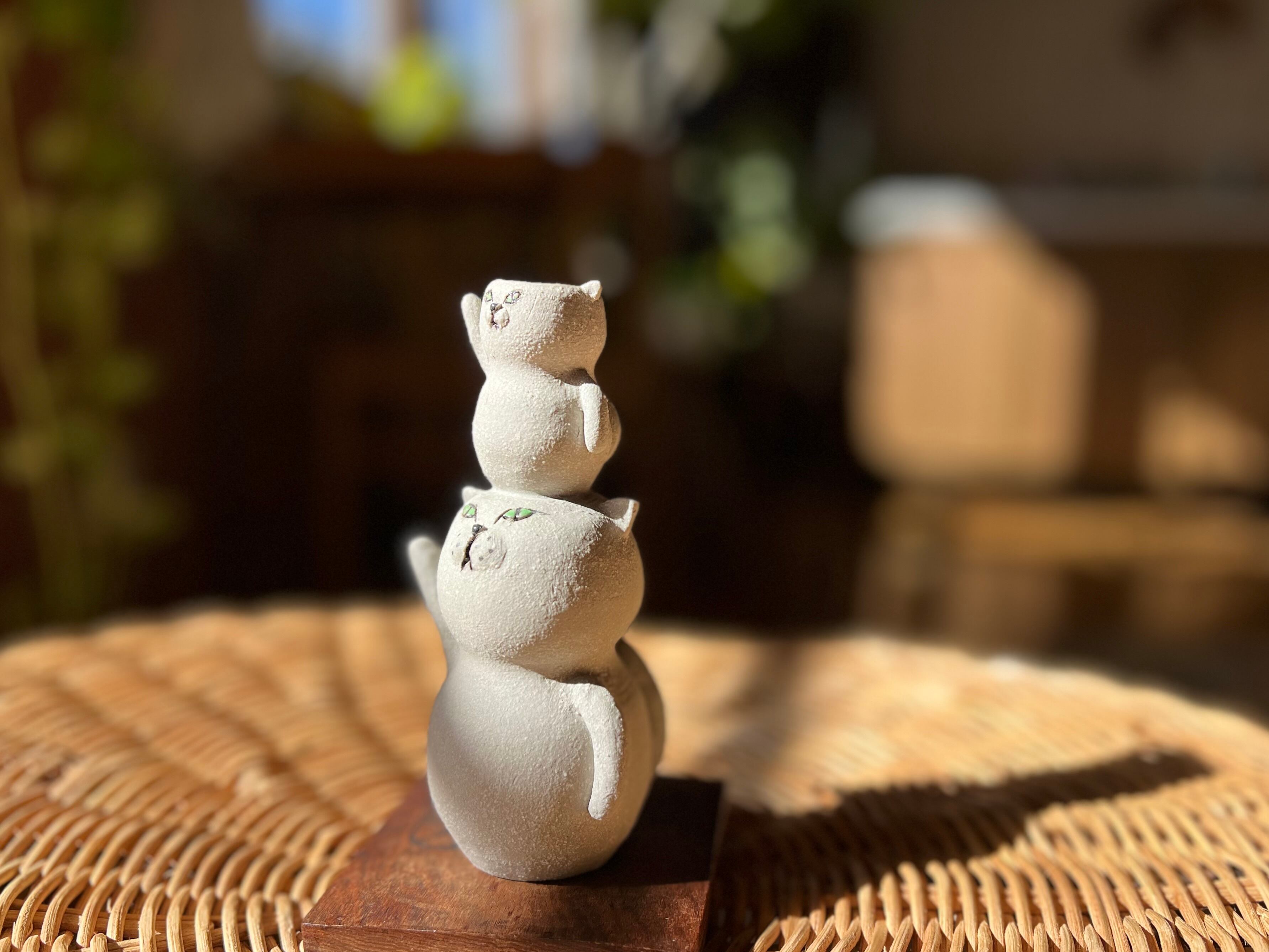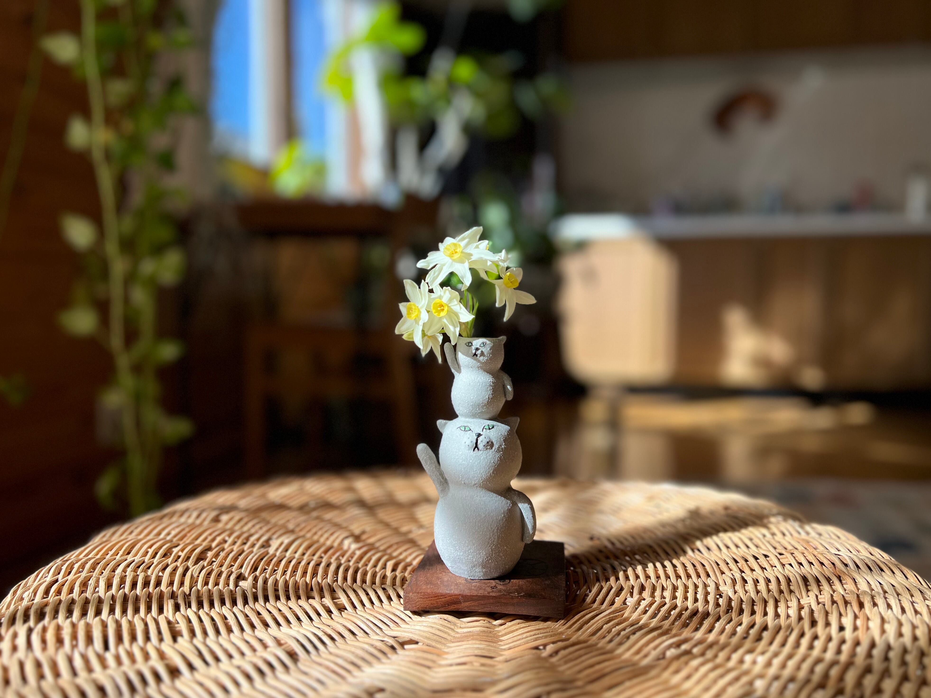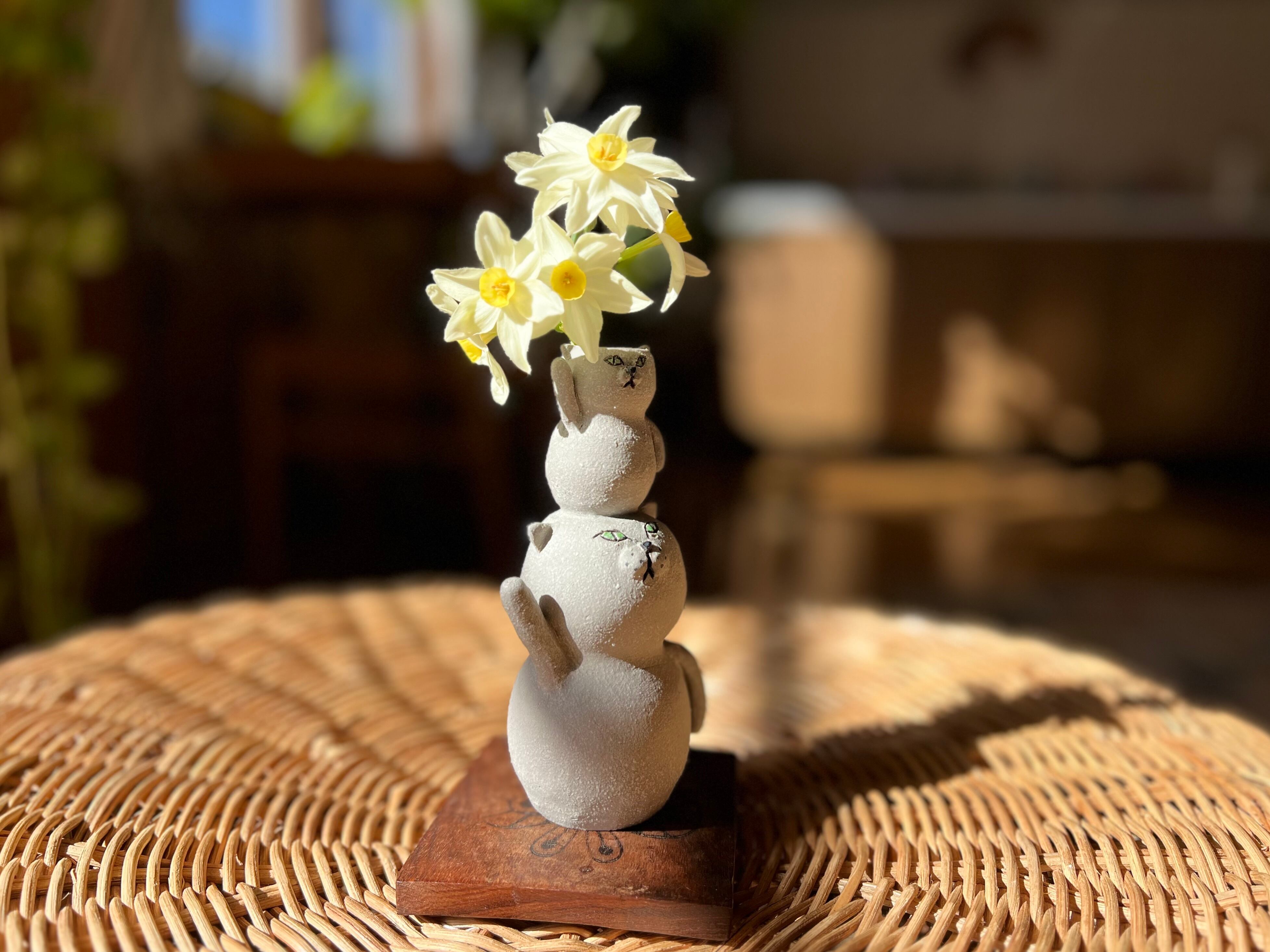 グレー猫さんが小さい猫さんを頭に乗せた一輪挿しです。猫好きの方や花を飾るのが好きな方にぴったりのアイテムです。
