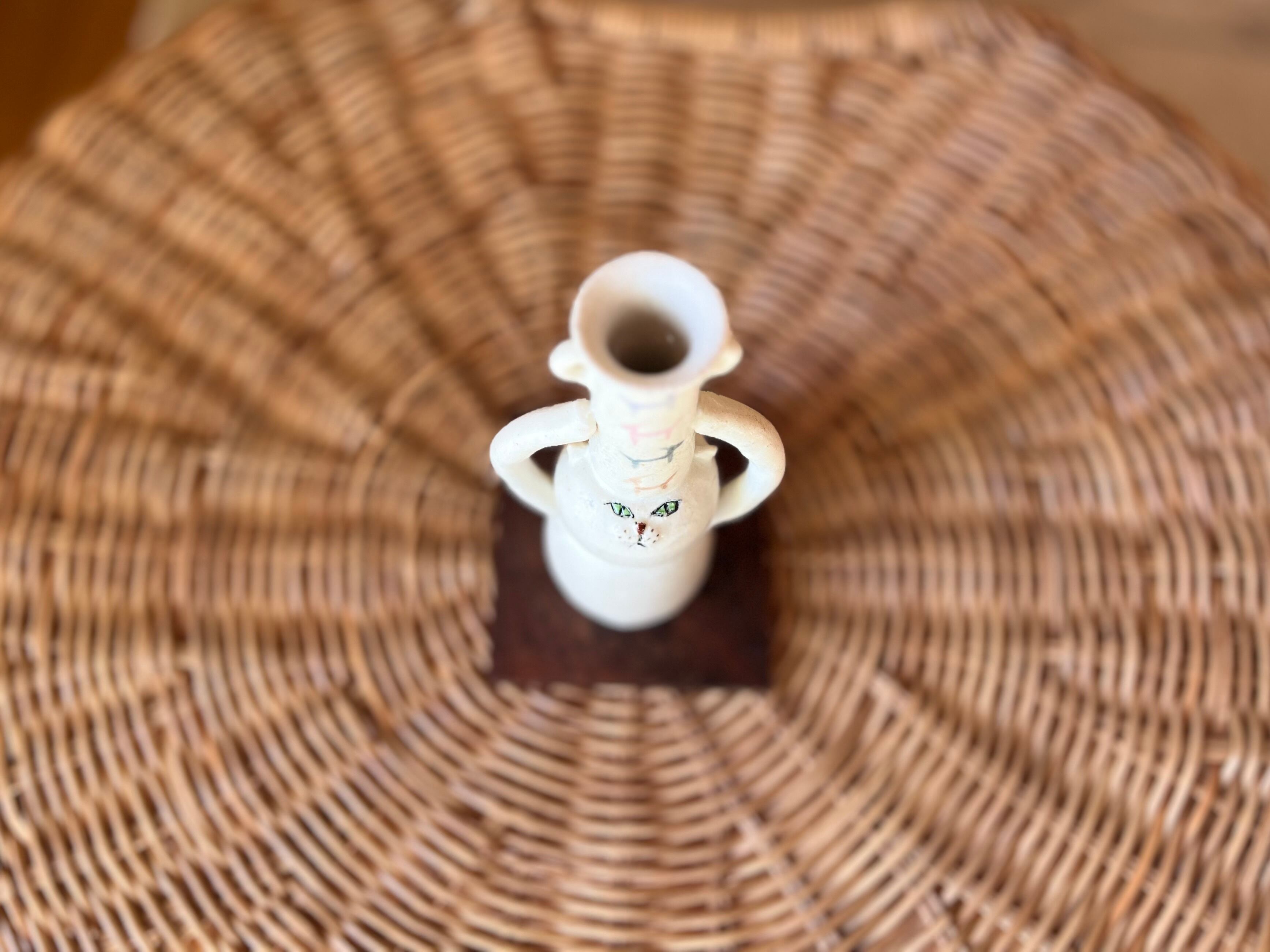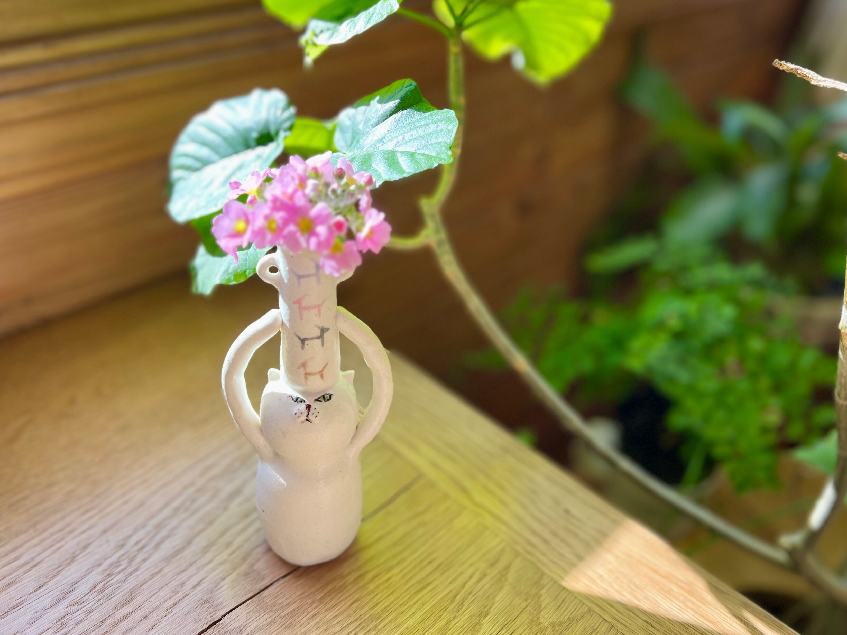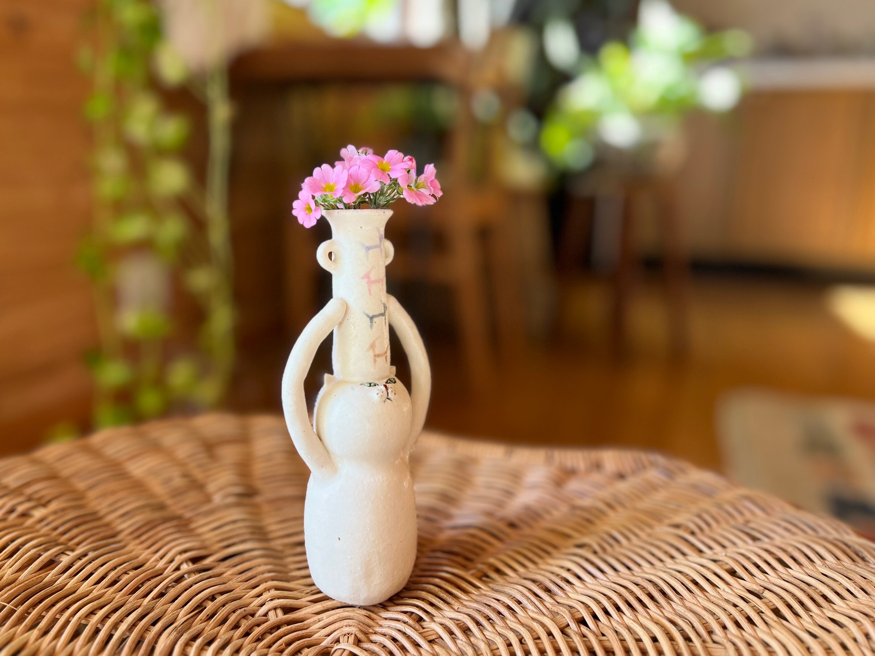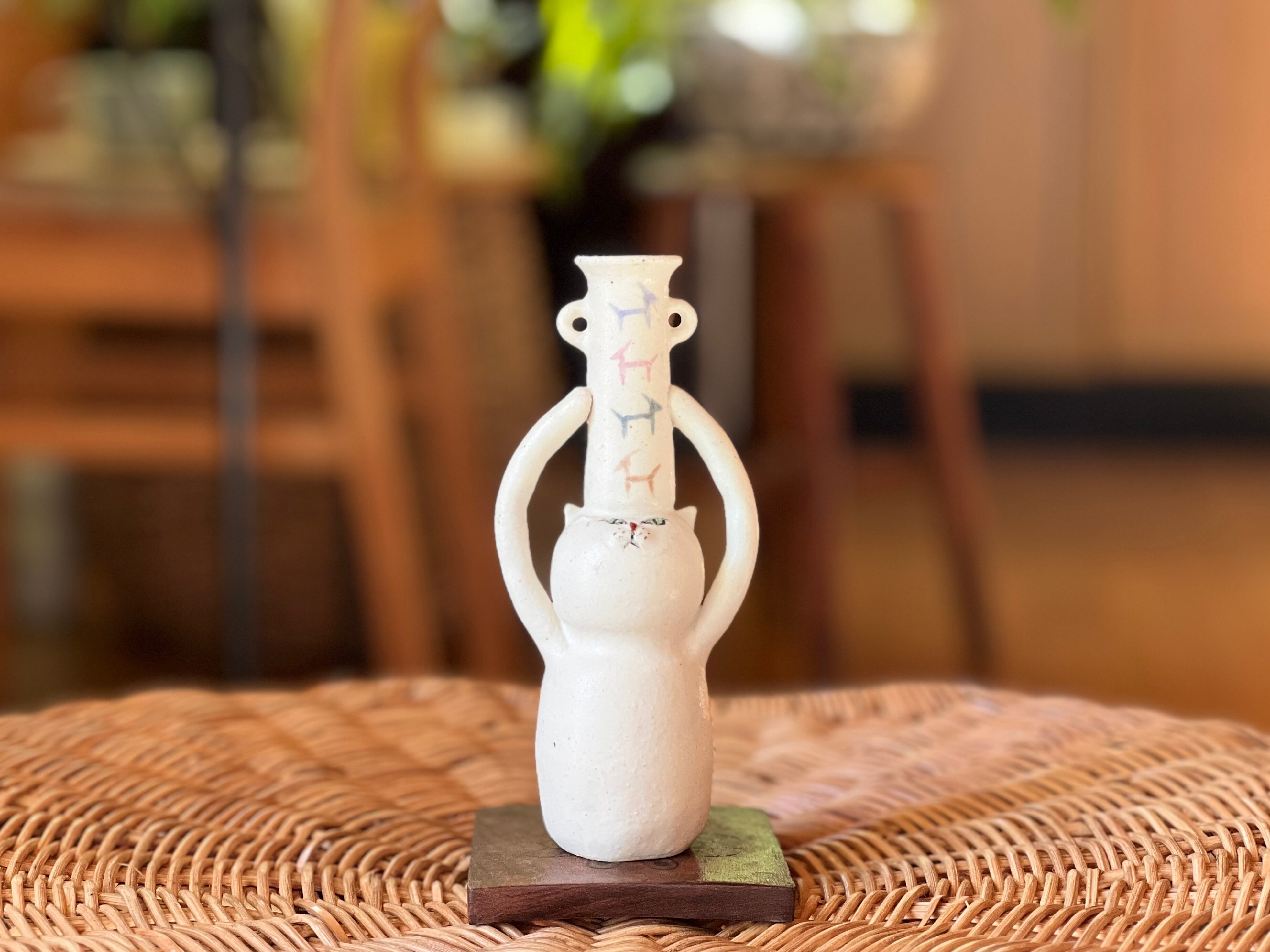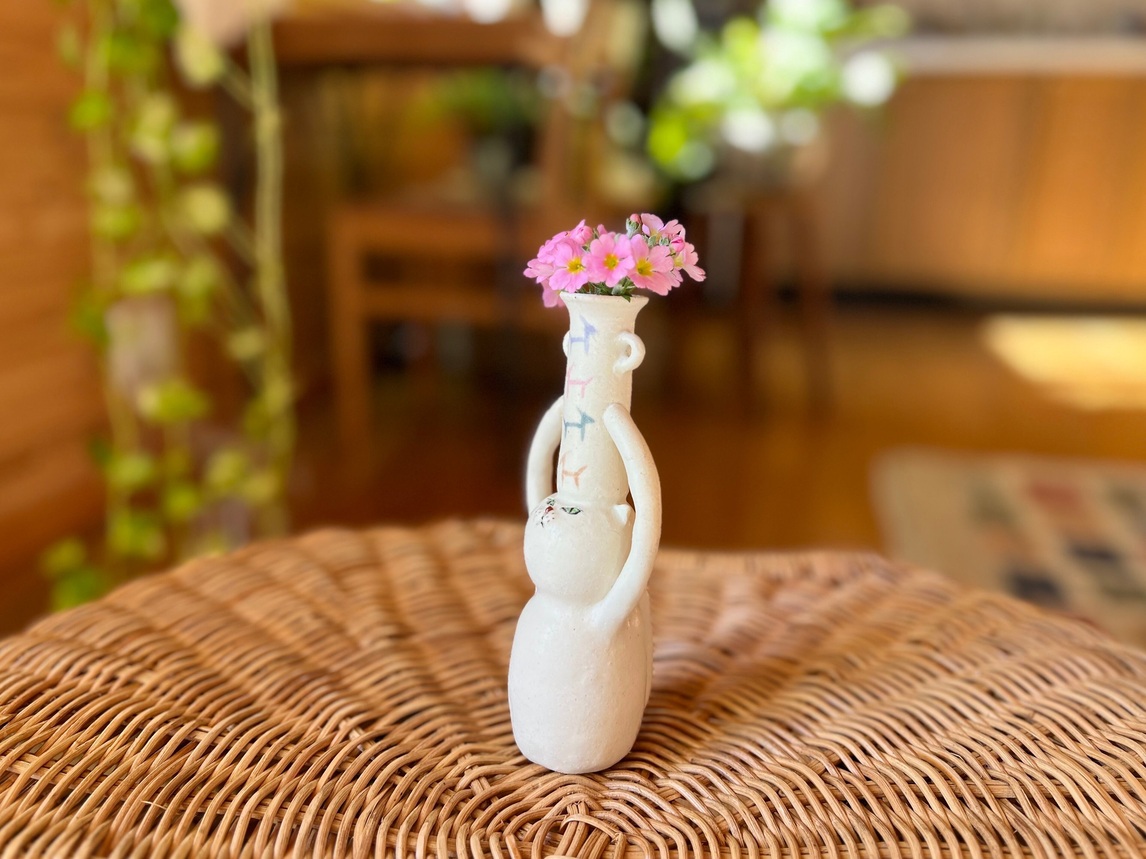 白猫さんが頭に壺を乗せた一輪挿しです。猫好きの方や花を飾るのが好きな方にぴったりのアイテムです。